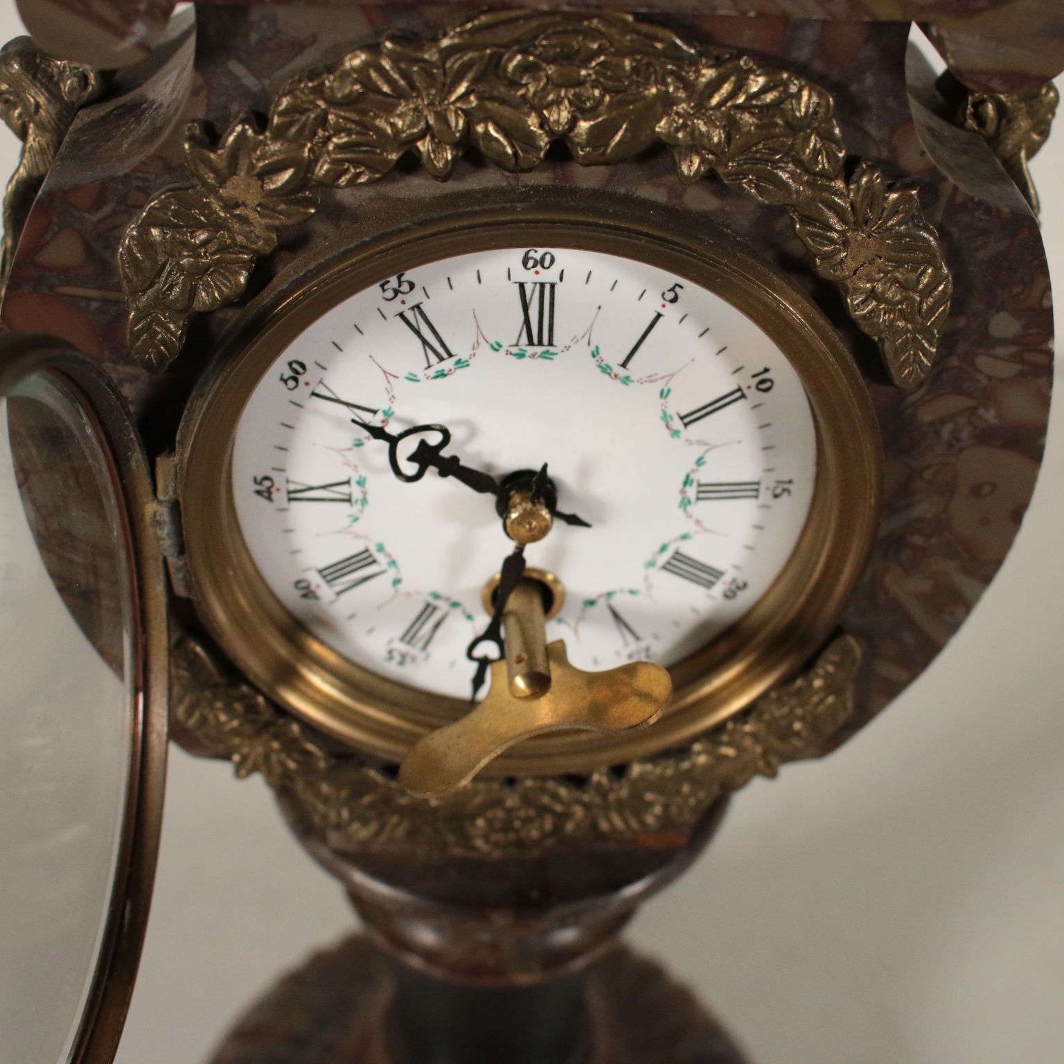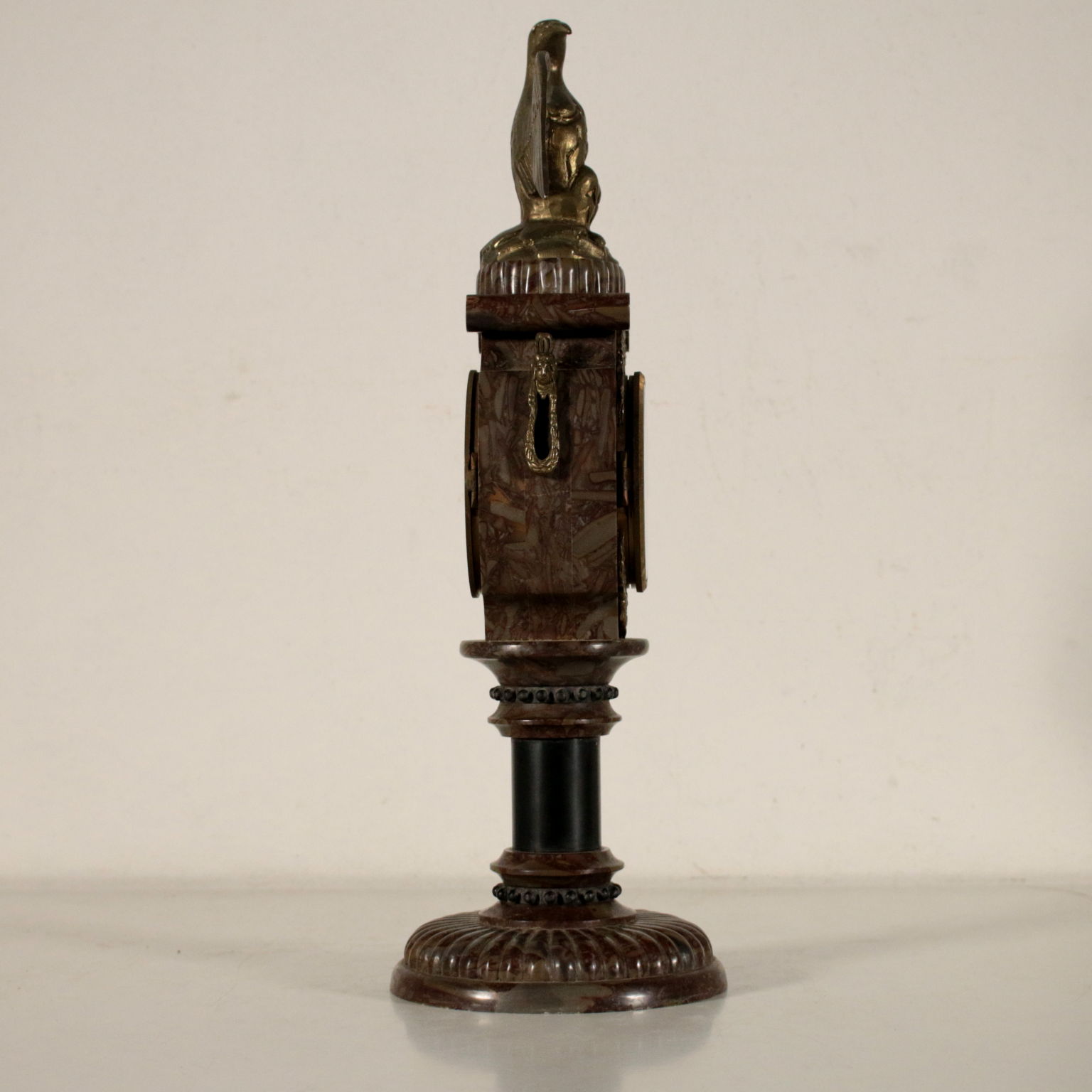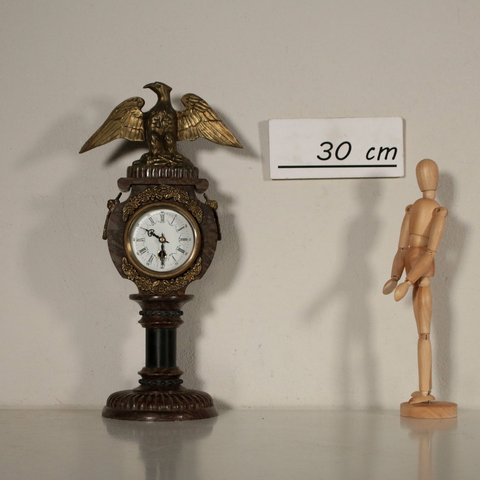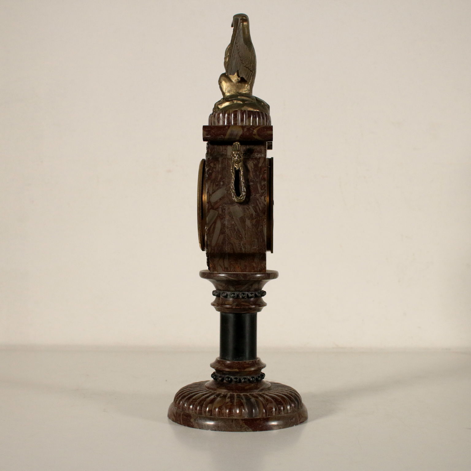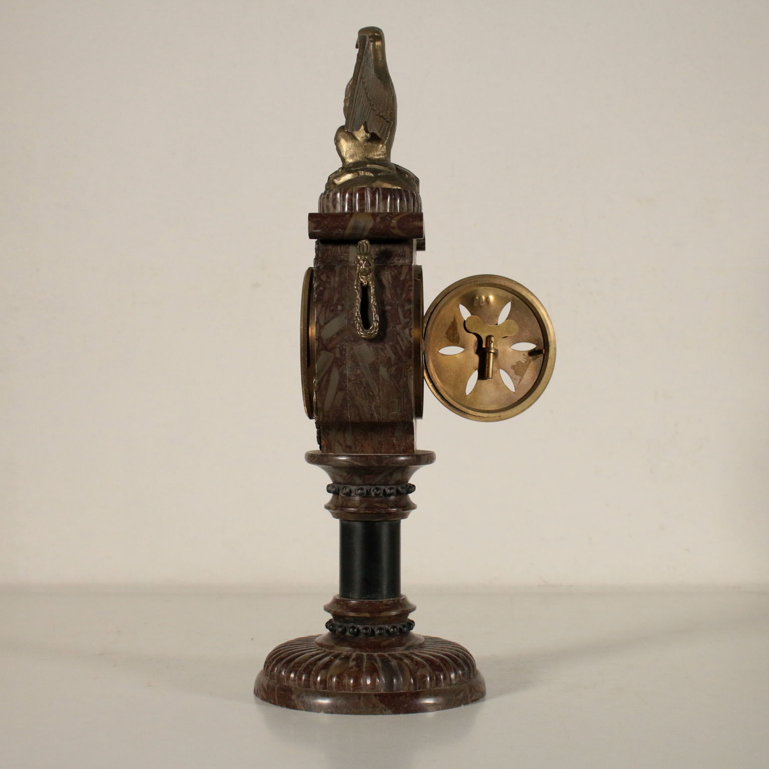 Orologio da tavolo in marmo a base circolare con applicazioni e aquila alla sommità in bronzo. Mostra in metallo smaltato a numeri romani per le ore e arabi per i minuti. Chiave di carica custodita al verso.