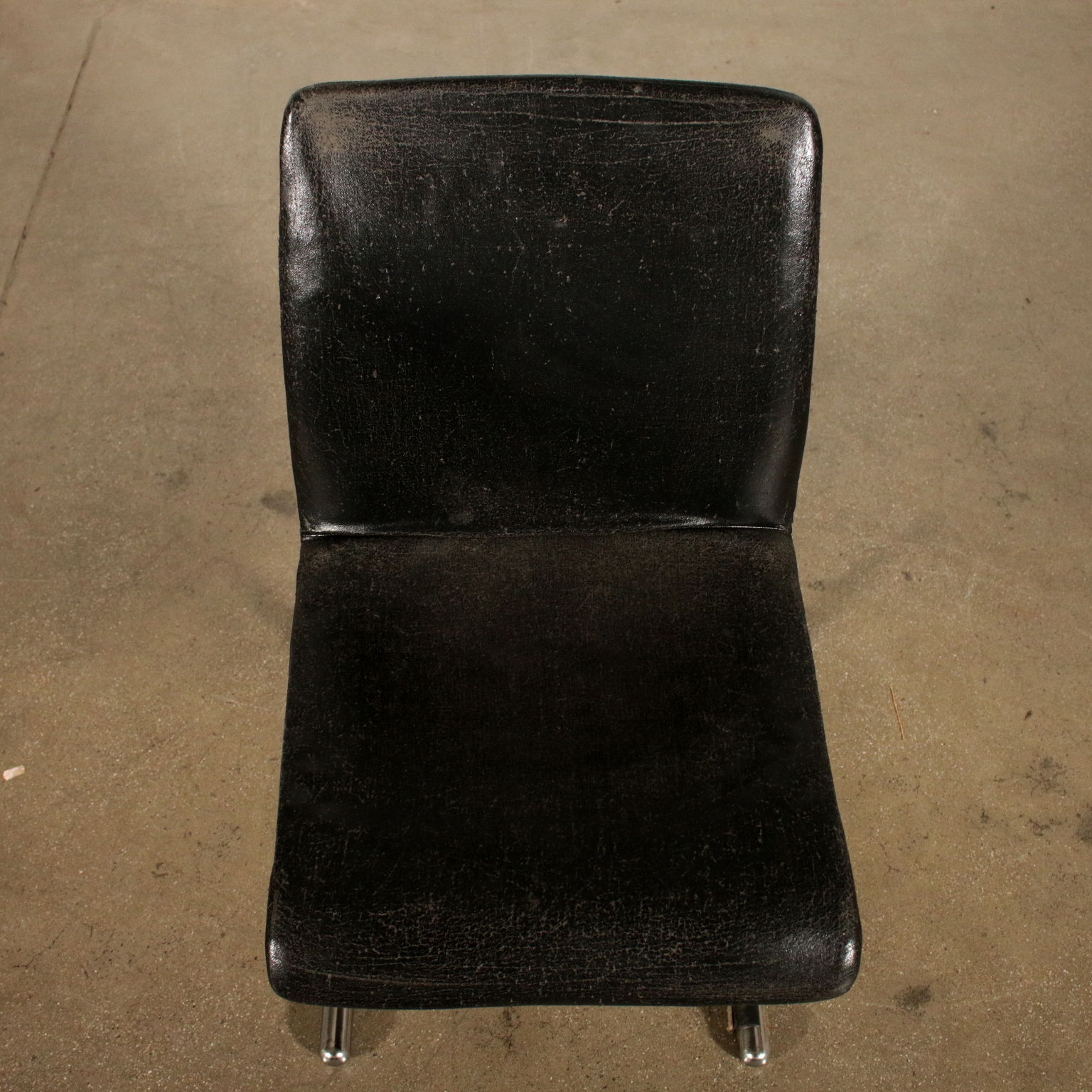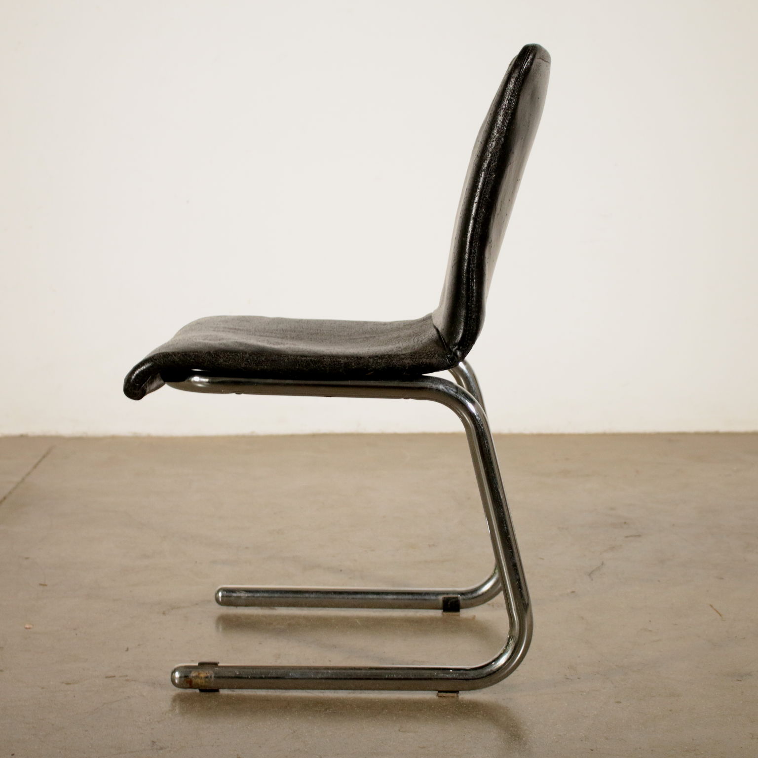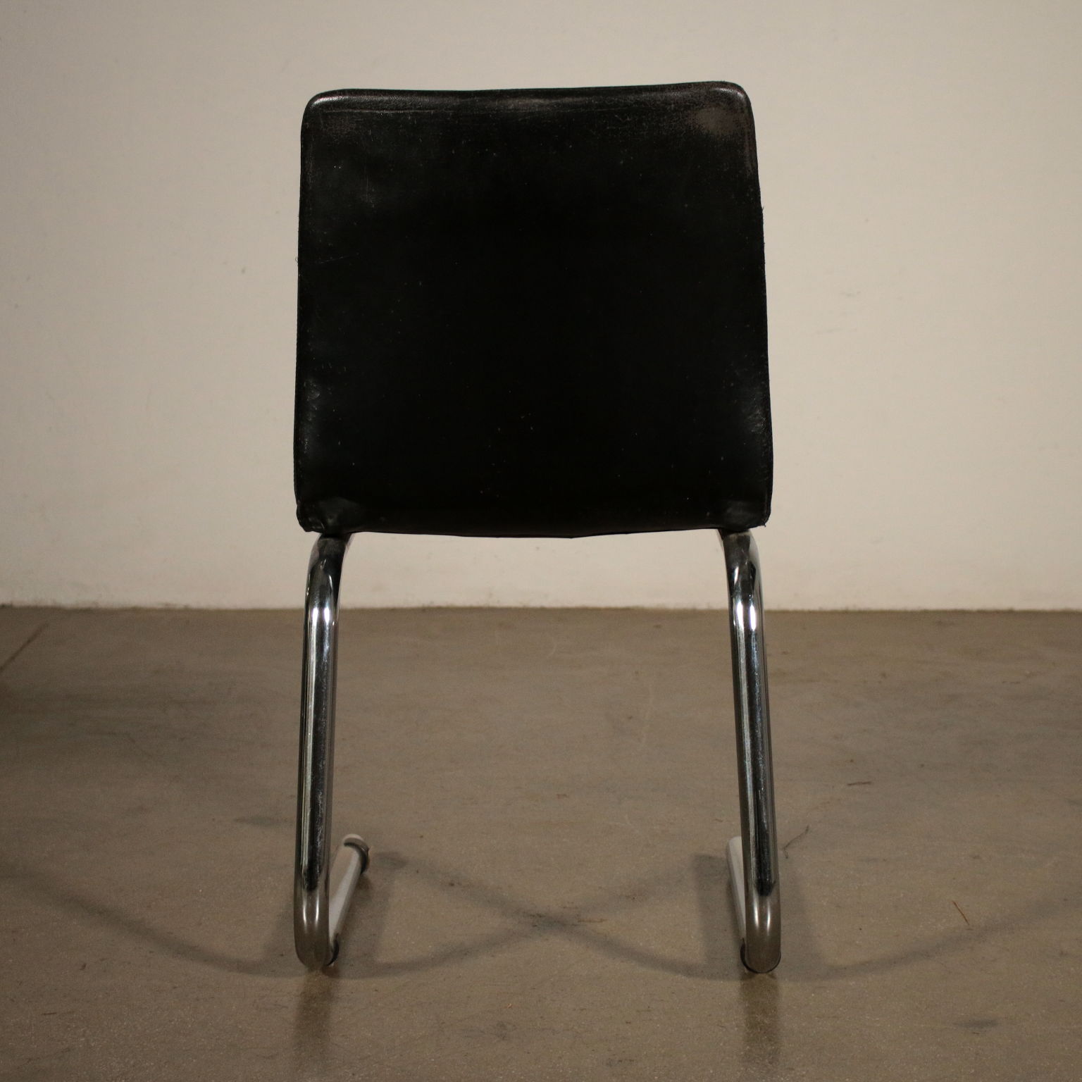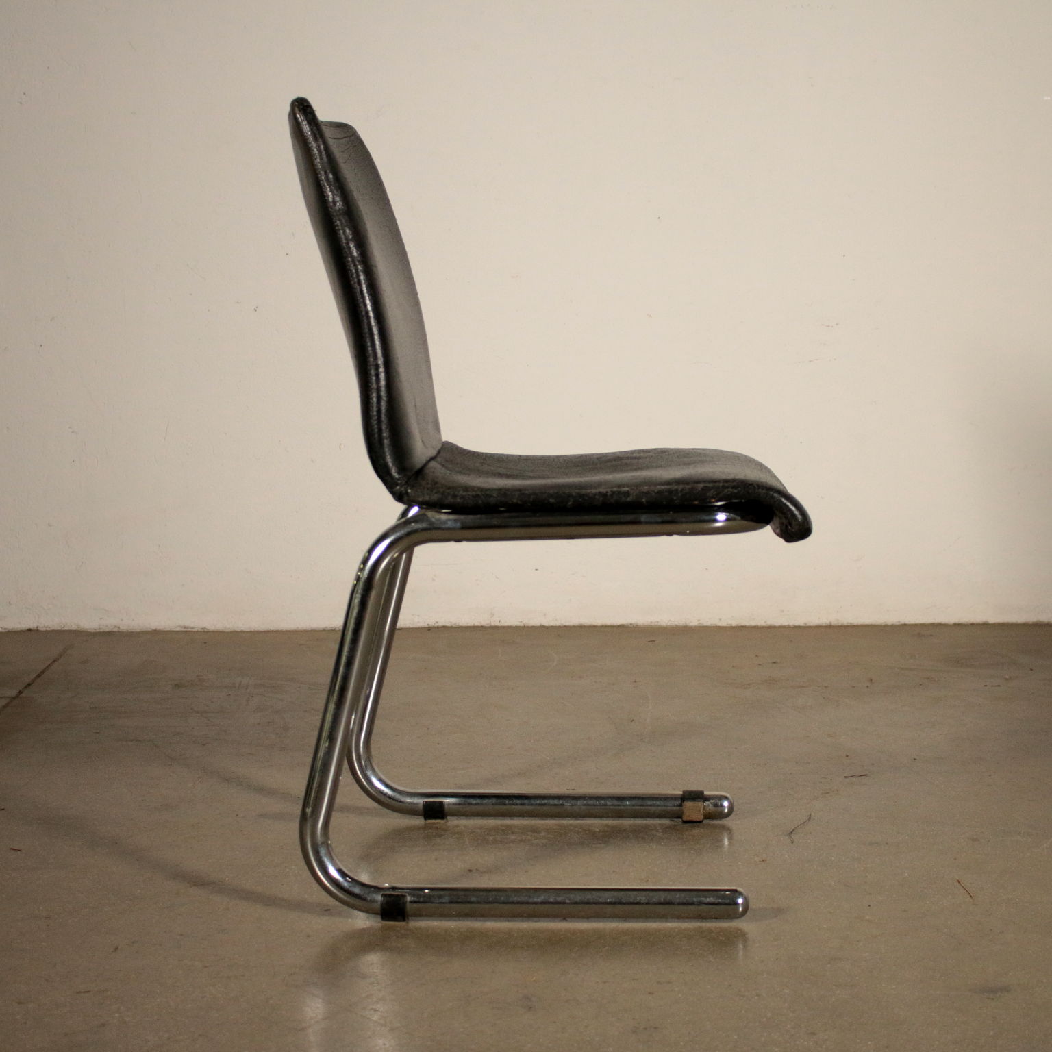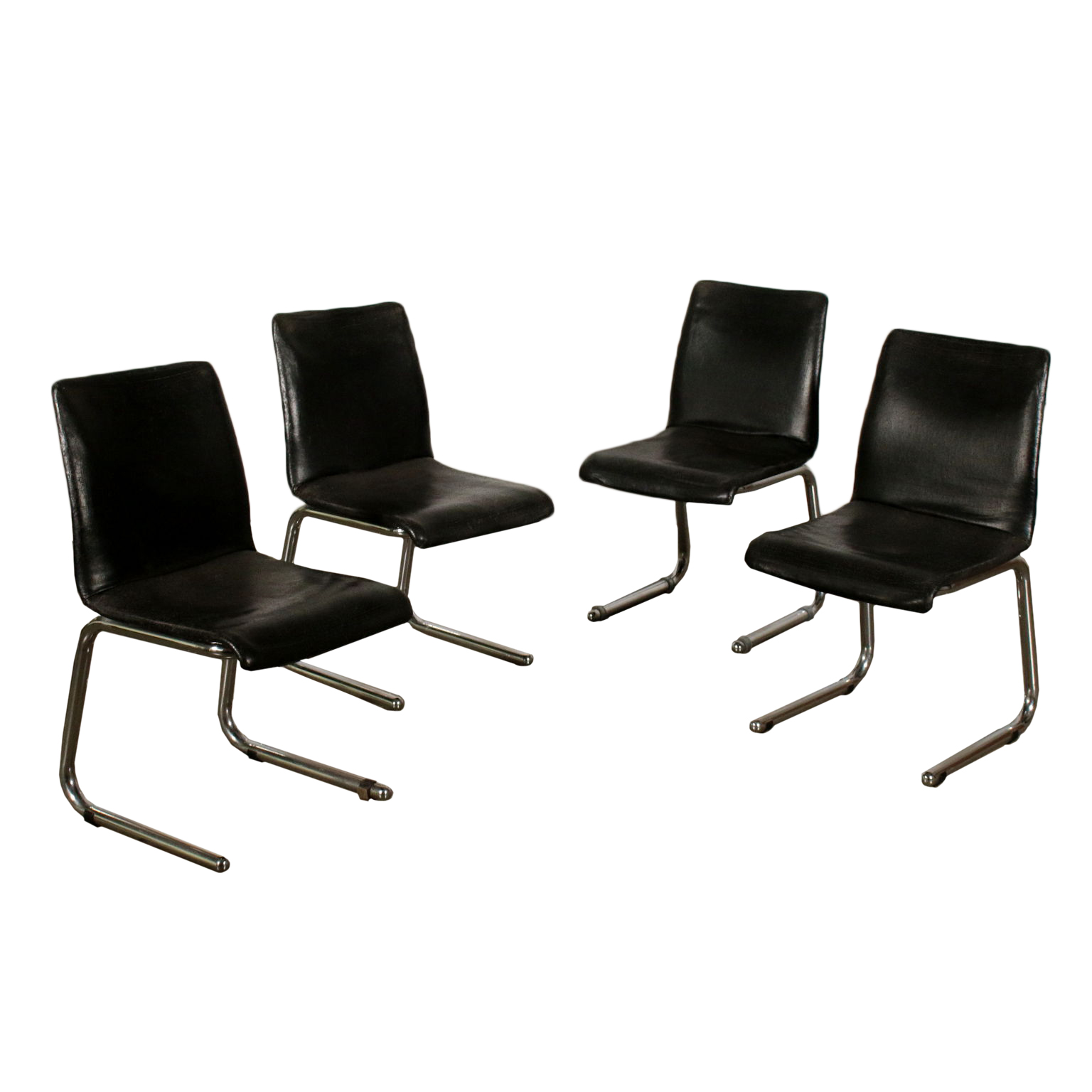 Gruppo di quattro sedie, sedute in espanso, rivestimento in similpelle, tubolare cromato.