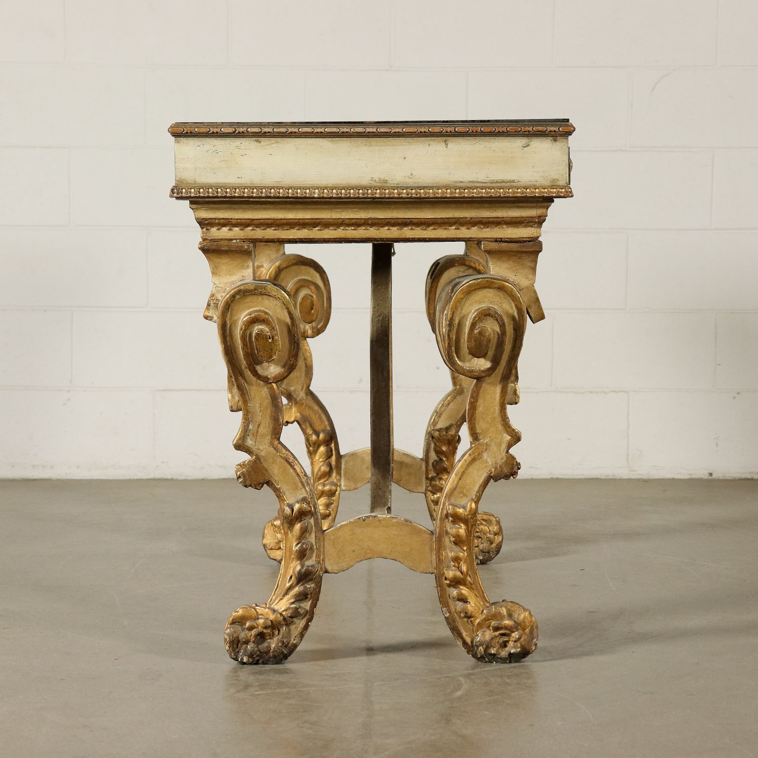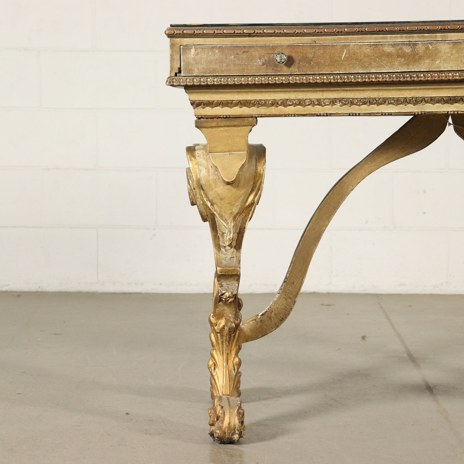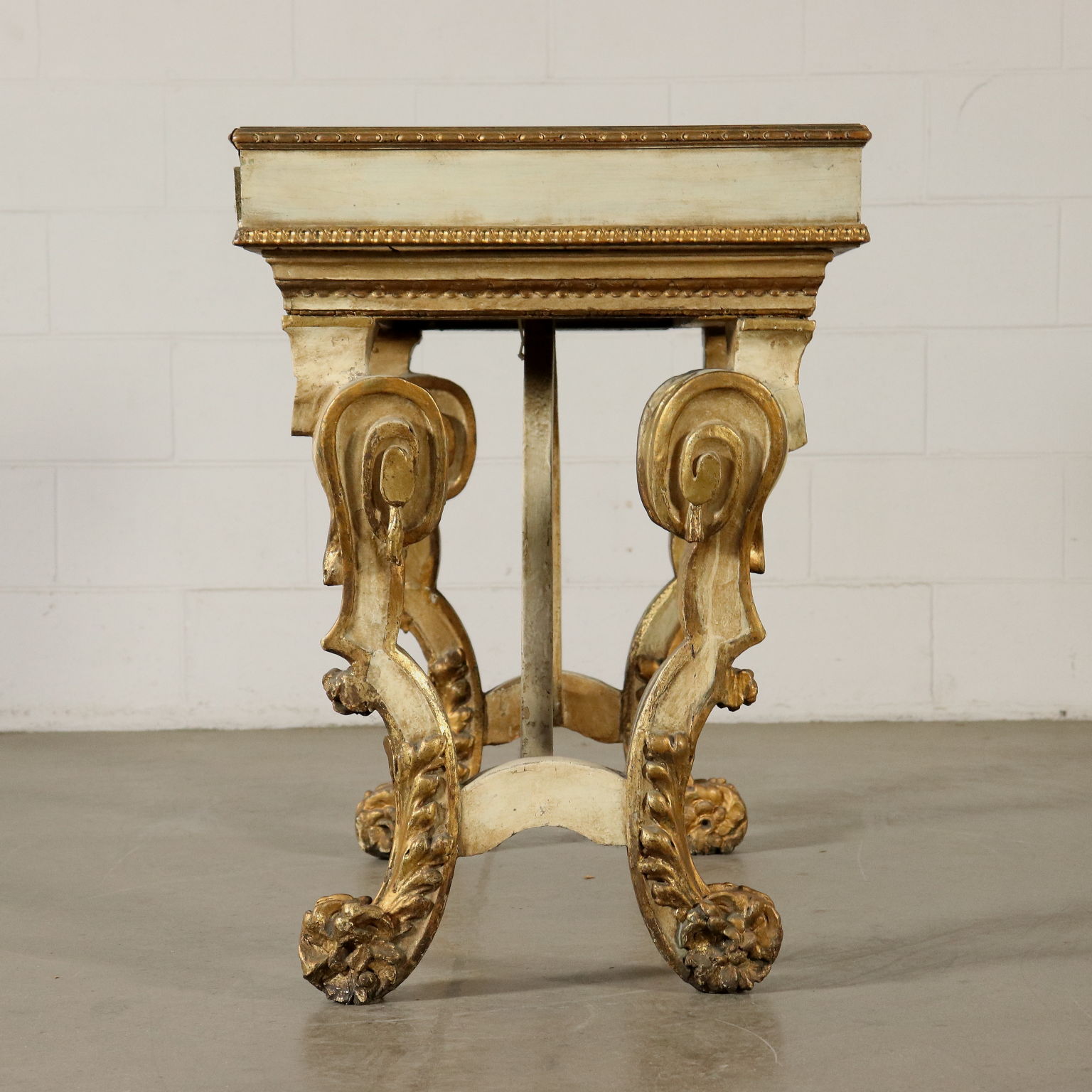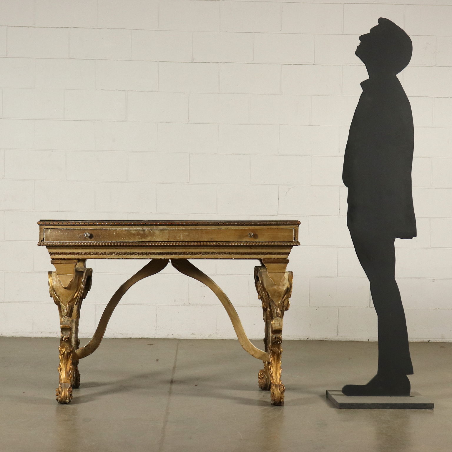 Assemblato alla fine dell'Ottocento con legni antichi. Retto da volute raccordate da saette presenta un cassetto nella fascia. Piano incassato in cristallo.