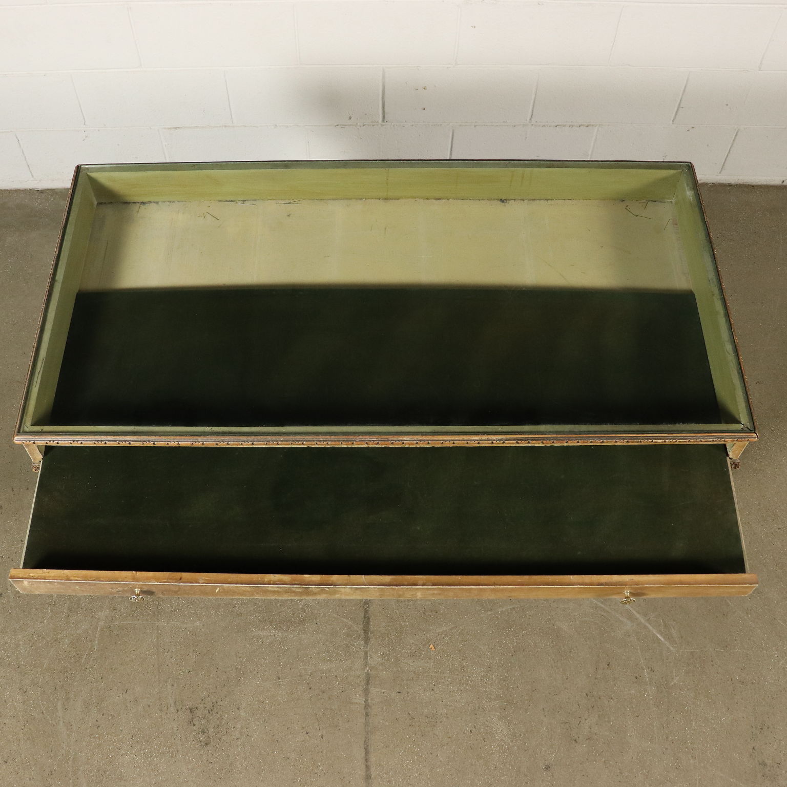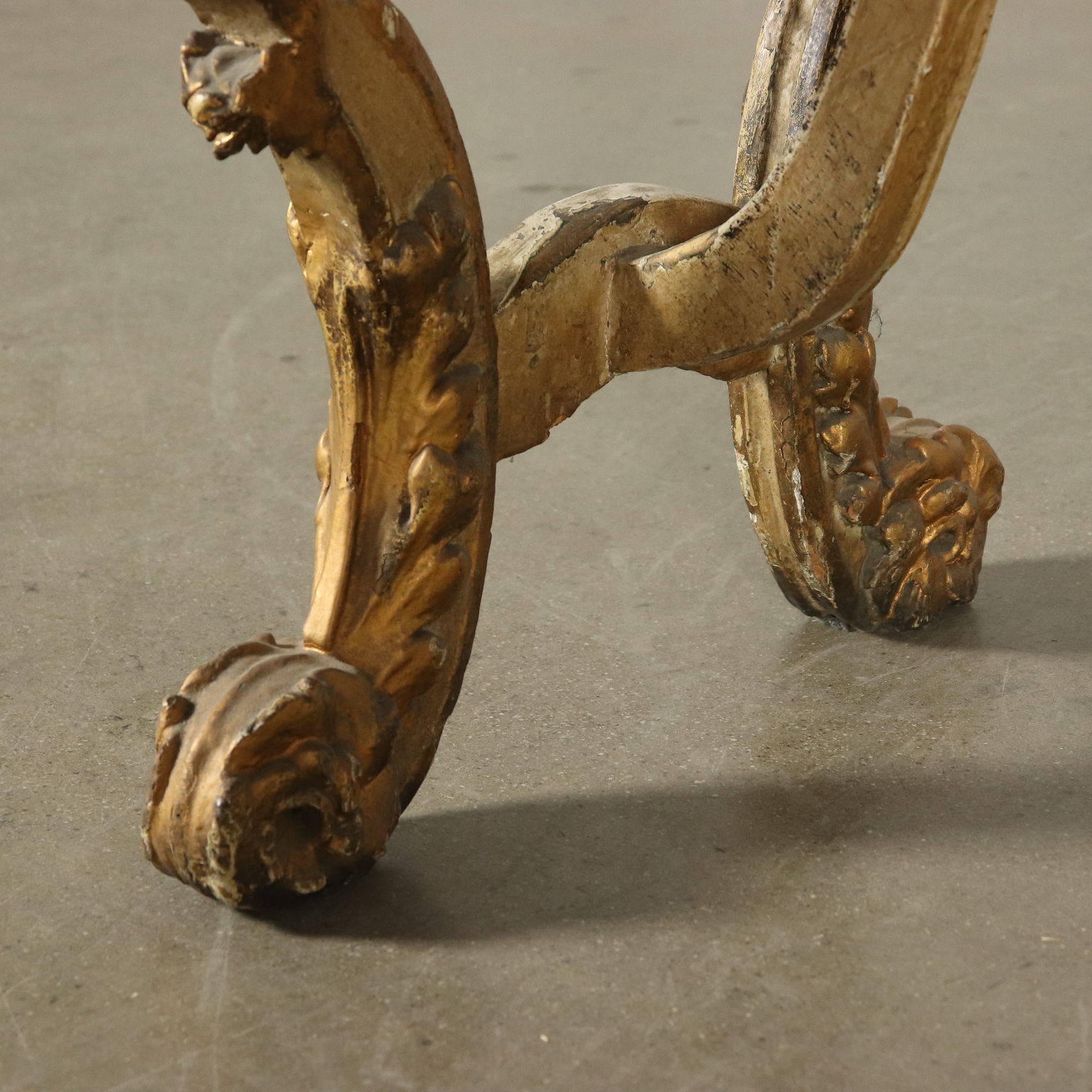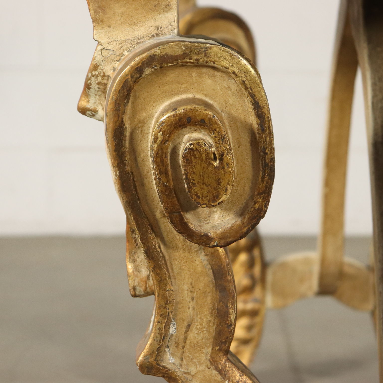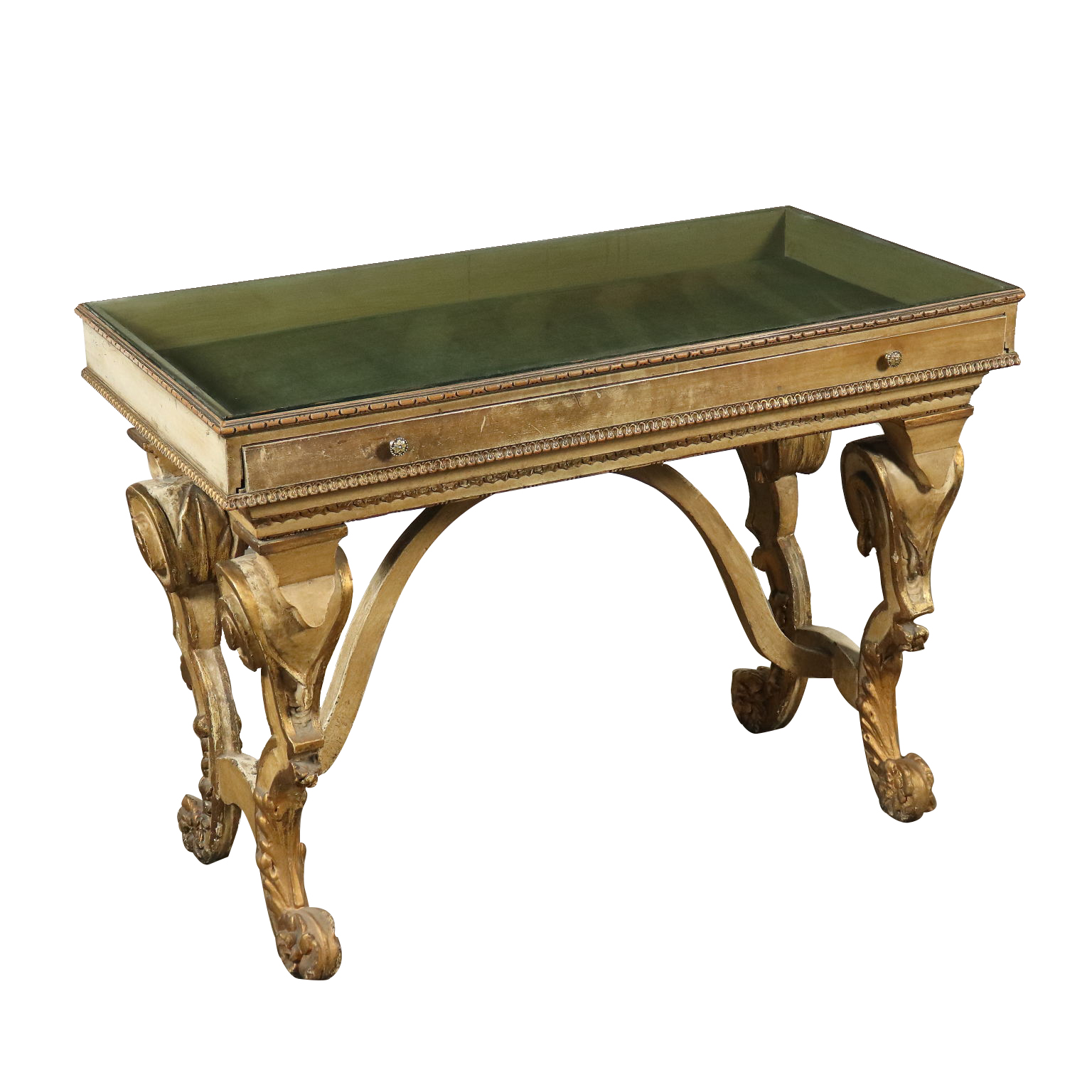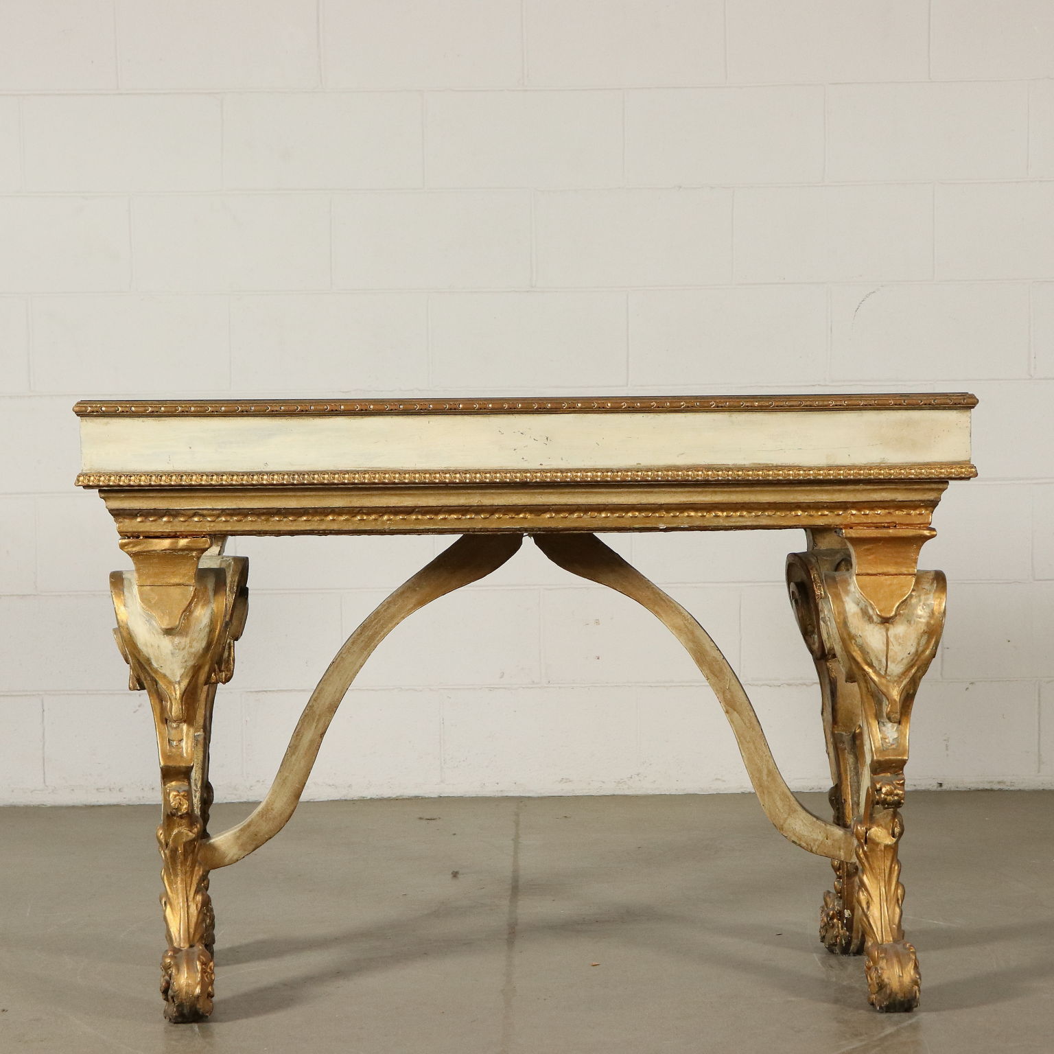 Assemblato alla fine dell'Ottocento con legni antichi. Retto da volute raccordate da saette presenta un cassetto nella fascia. Piano incassato in cristallo.