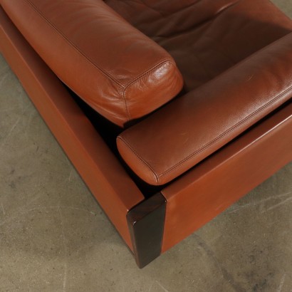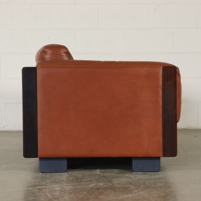Divano con fiancate in pannelli di legno rivestiti e cuscini alloggiati liberi in espanso con rivestimento in pelle.