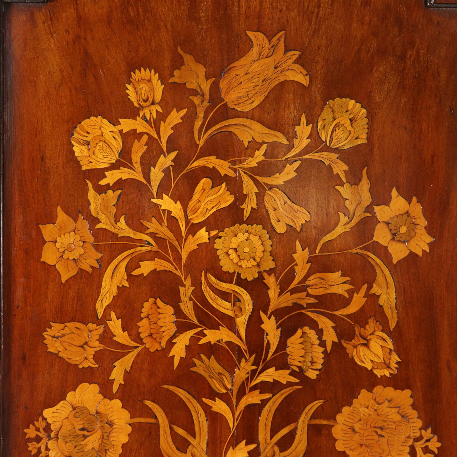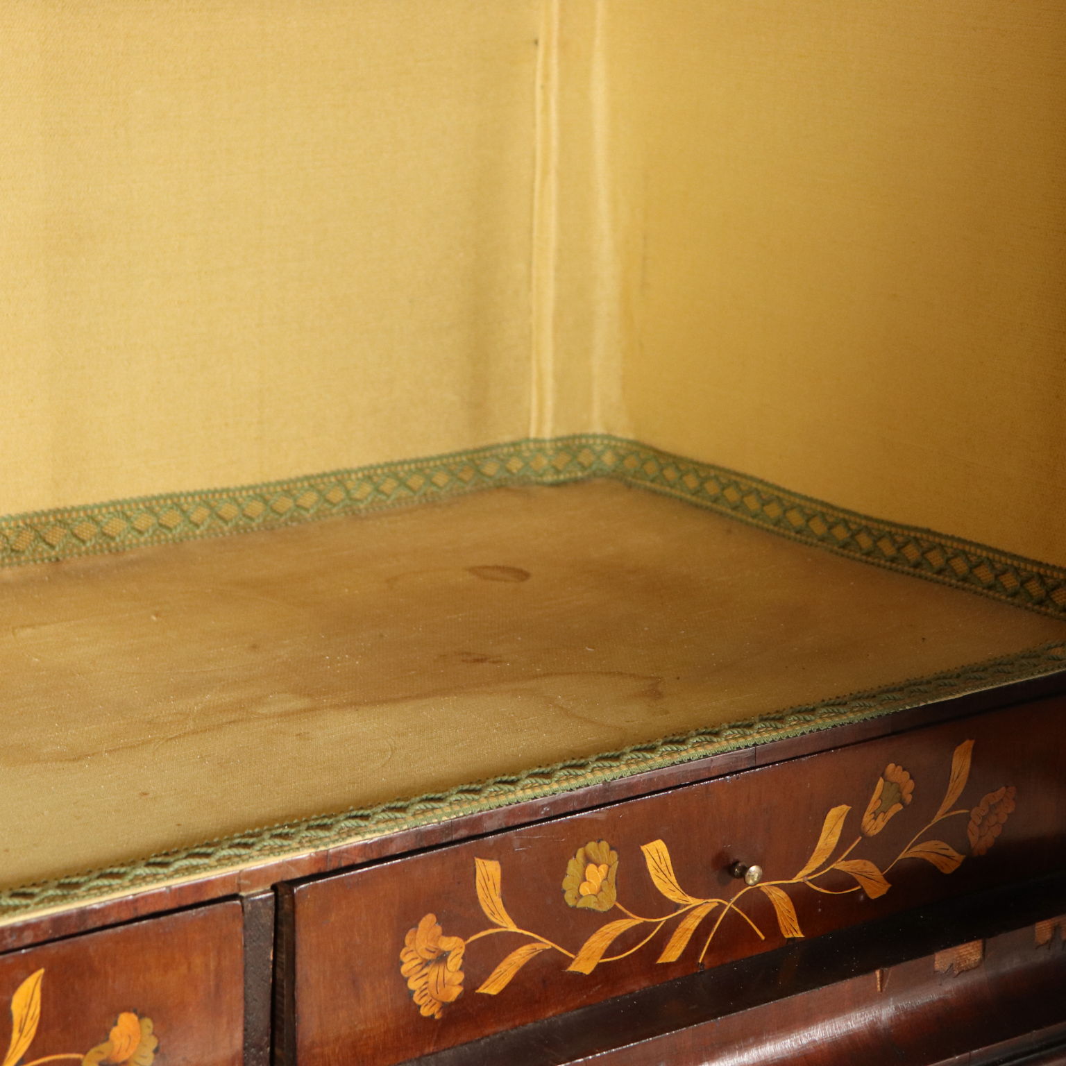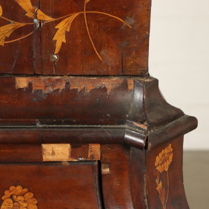 Cassettiera olandese mossa sul fronte, presenta montanti scantonati terminanti con artiglio d'aquila con sfera. Presenta tre cassetti e ampio grembiale. Alzata con coppia di ante intarsiate anche all'interno dove troviamo cinque cassettini e ripiani. Riccamente intarsiato in acero con fiori, elementi fogliacei e tulipani.