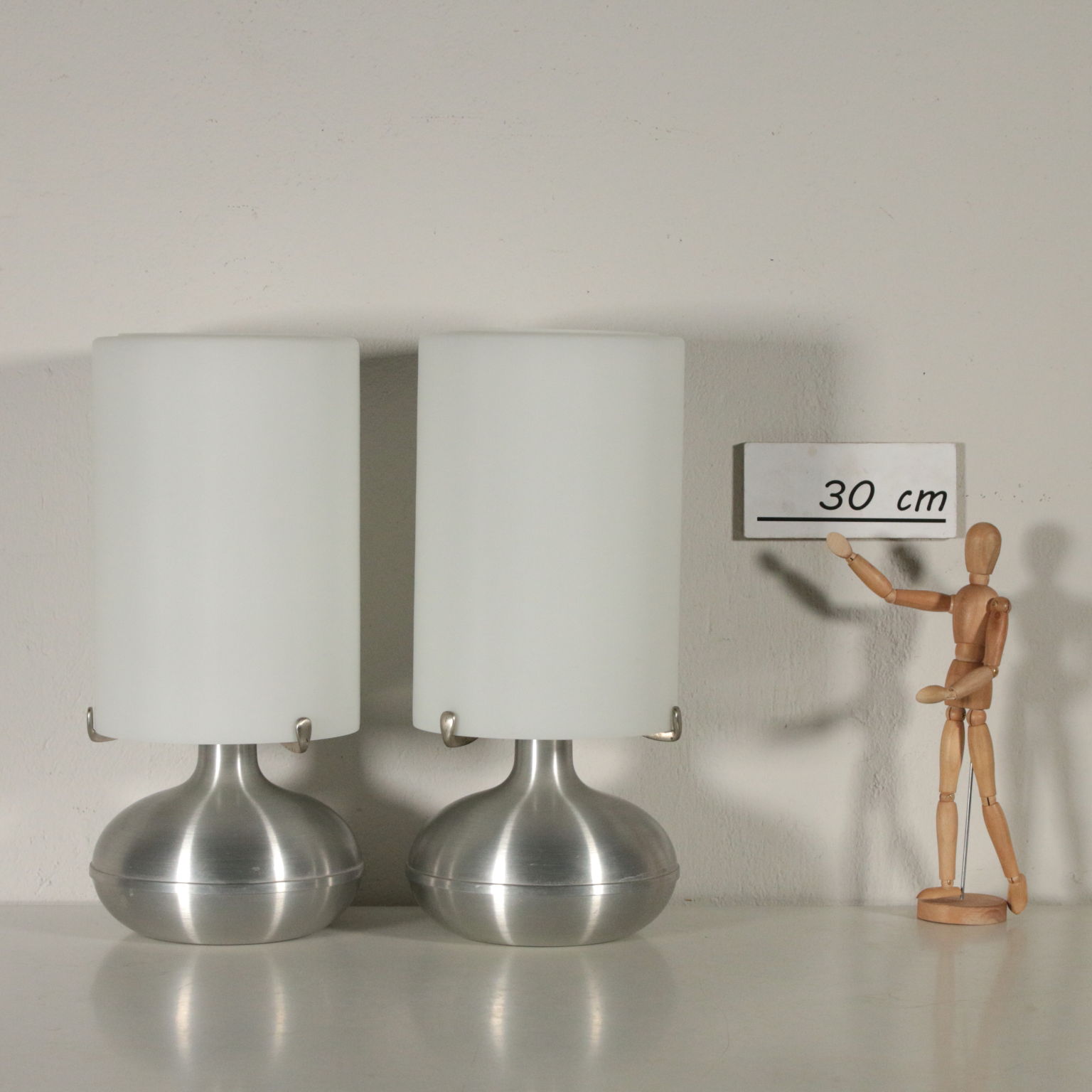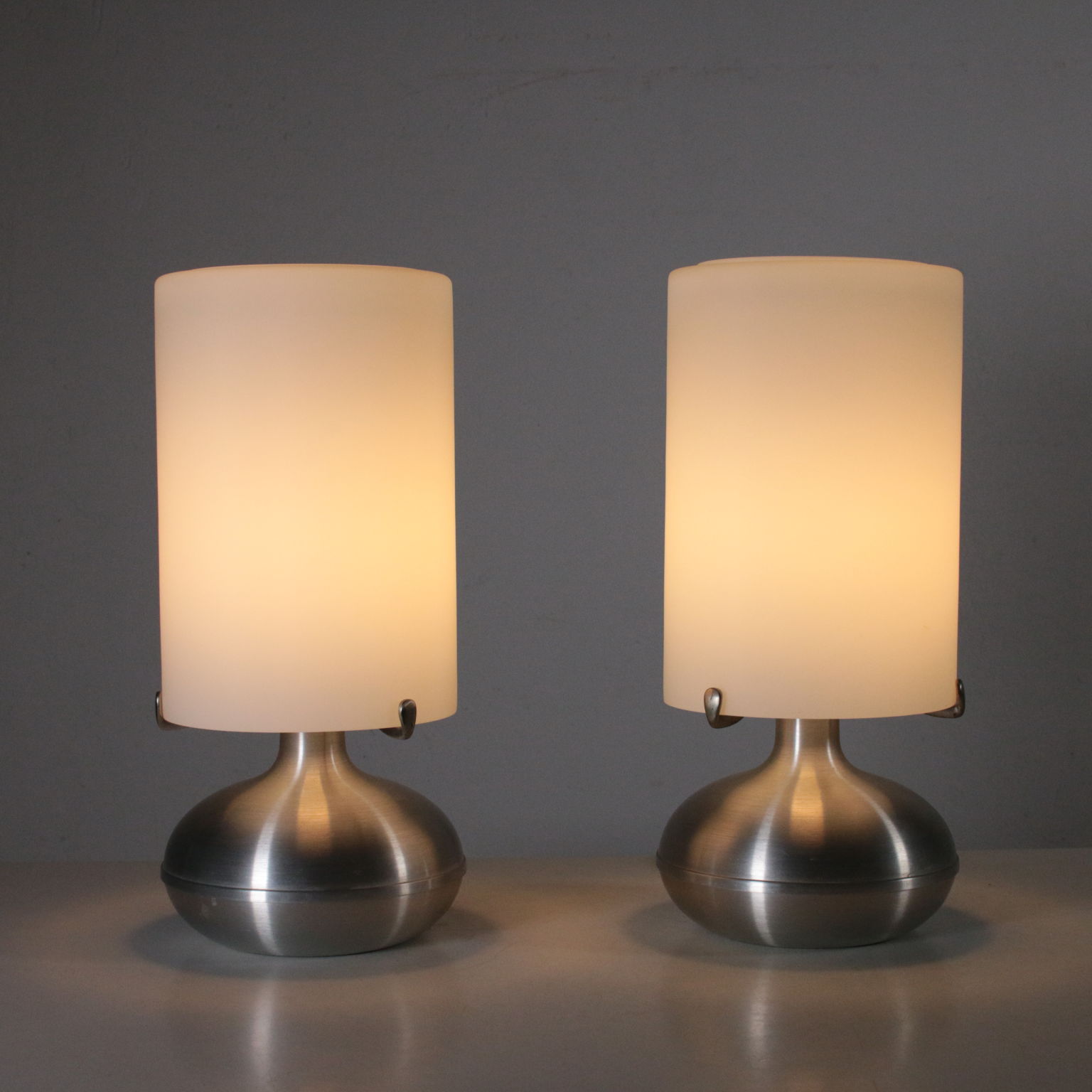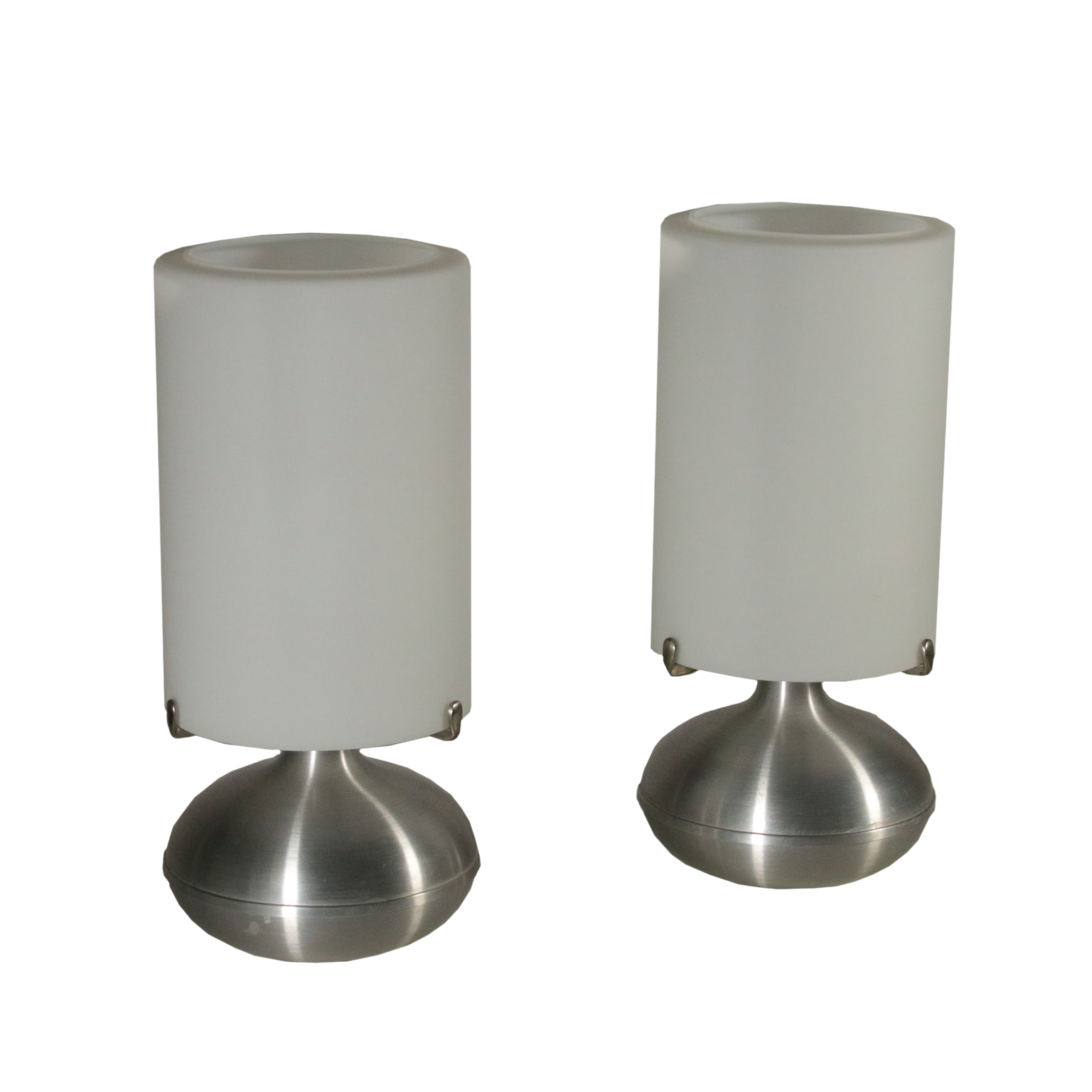 Coppia di lampade da tavolo; alluminio e vetro.