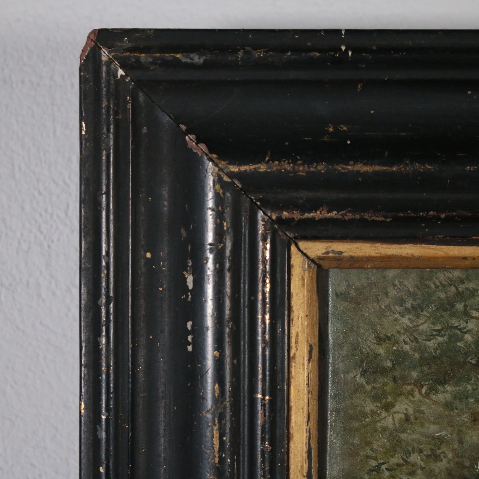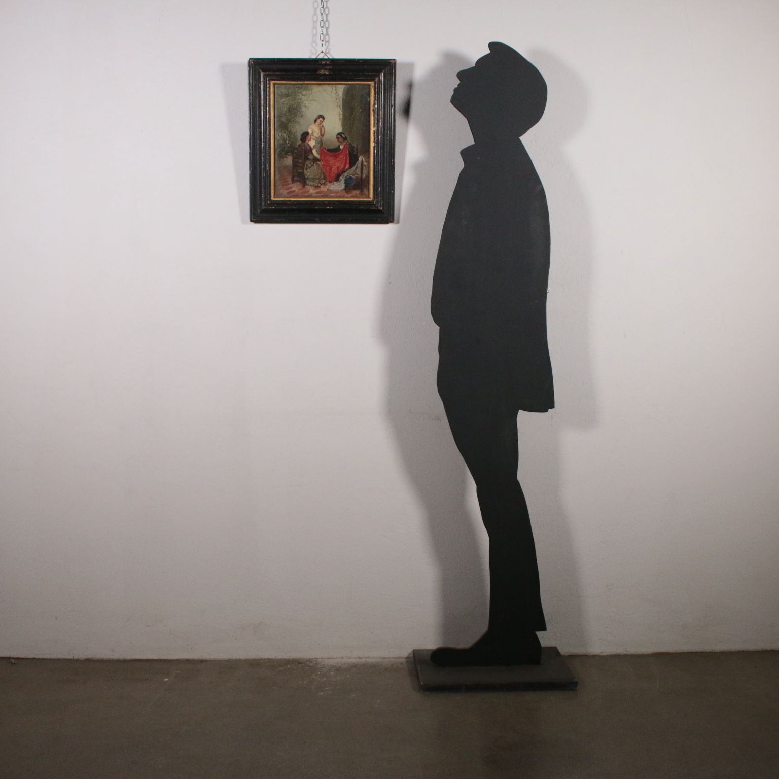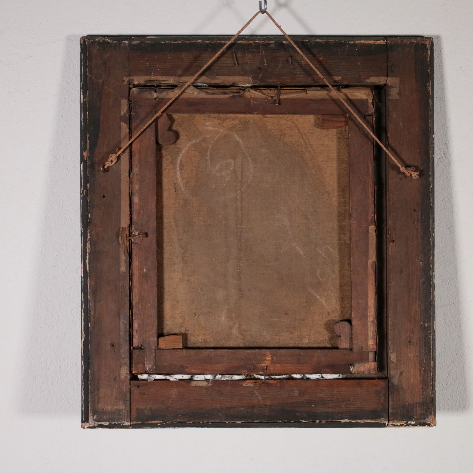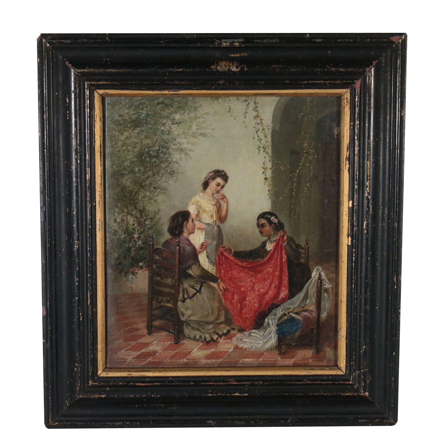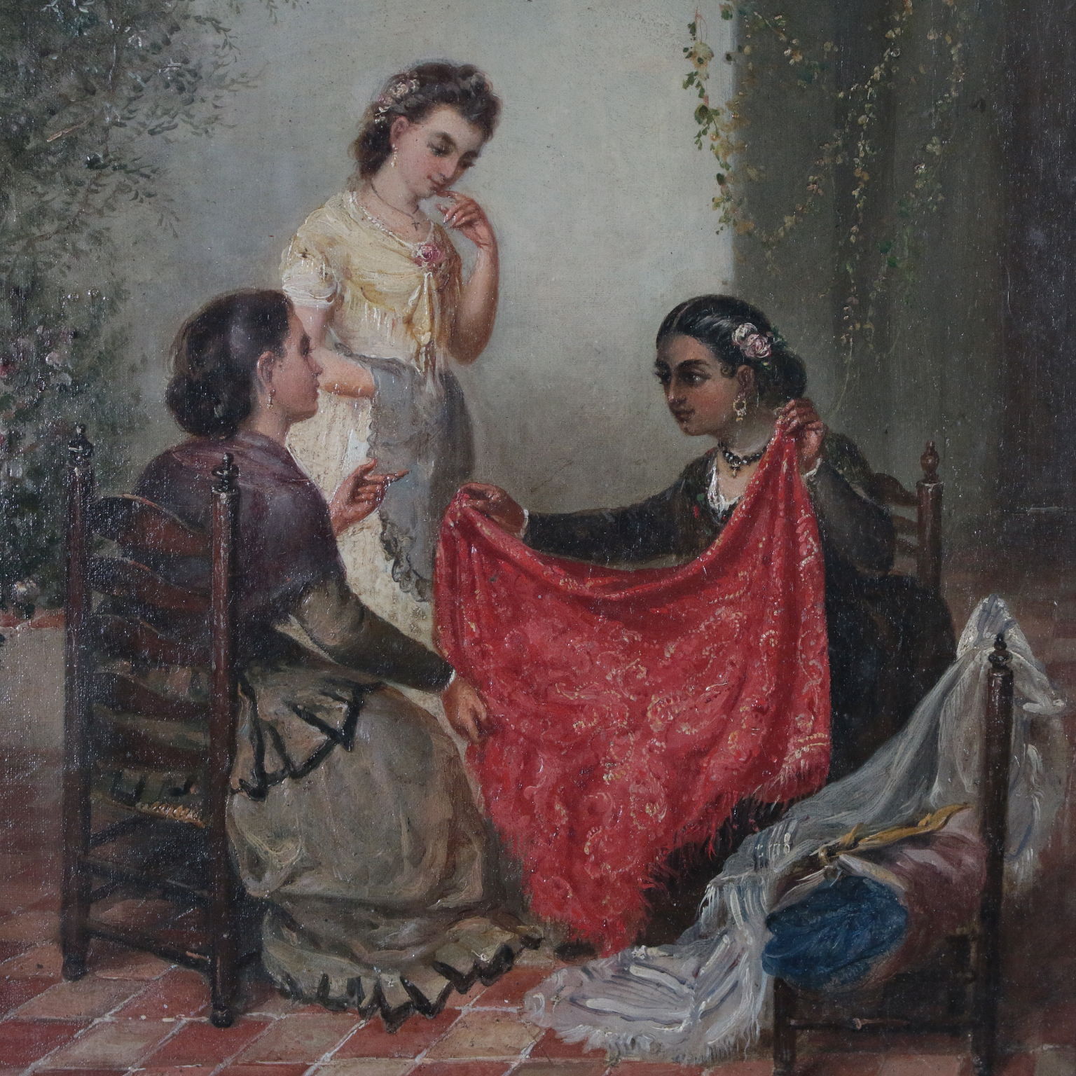 Olio su tela. Firmato e datato in basso a destra. Simpatica scena di genere in cui due donne e una bambina sono intente a valutare e scegliere delle stoffe variopinte, sedute su basse seggioline in un patio piastrellato. Presentato in cornice coeva con vetro.