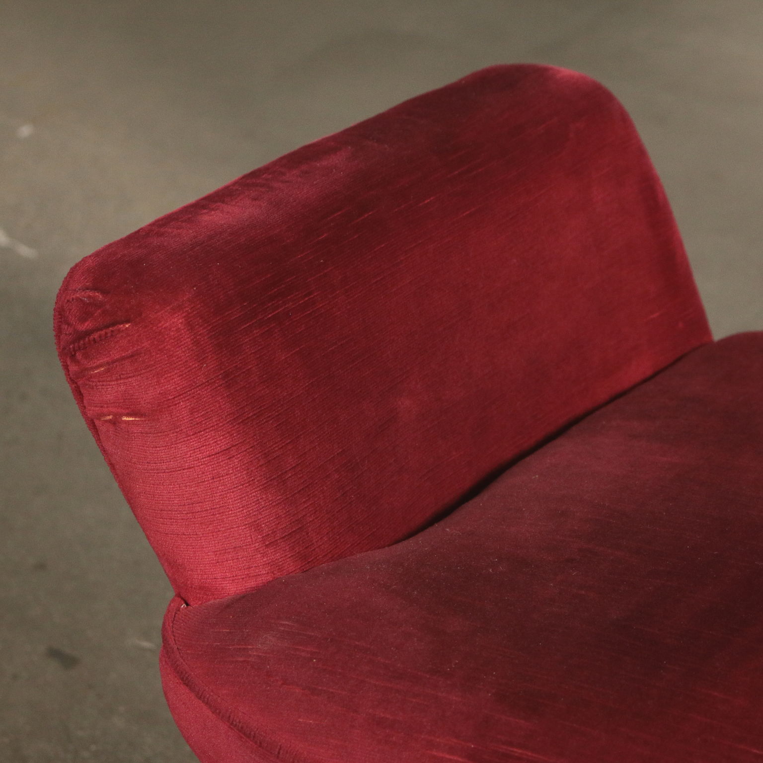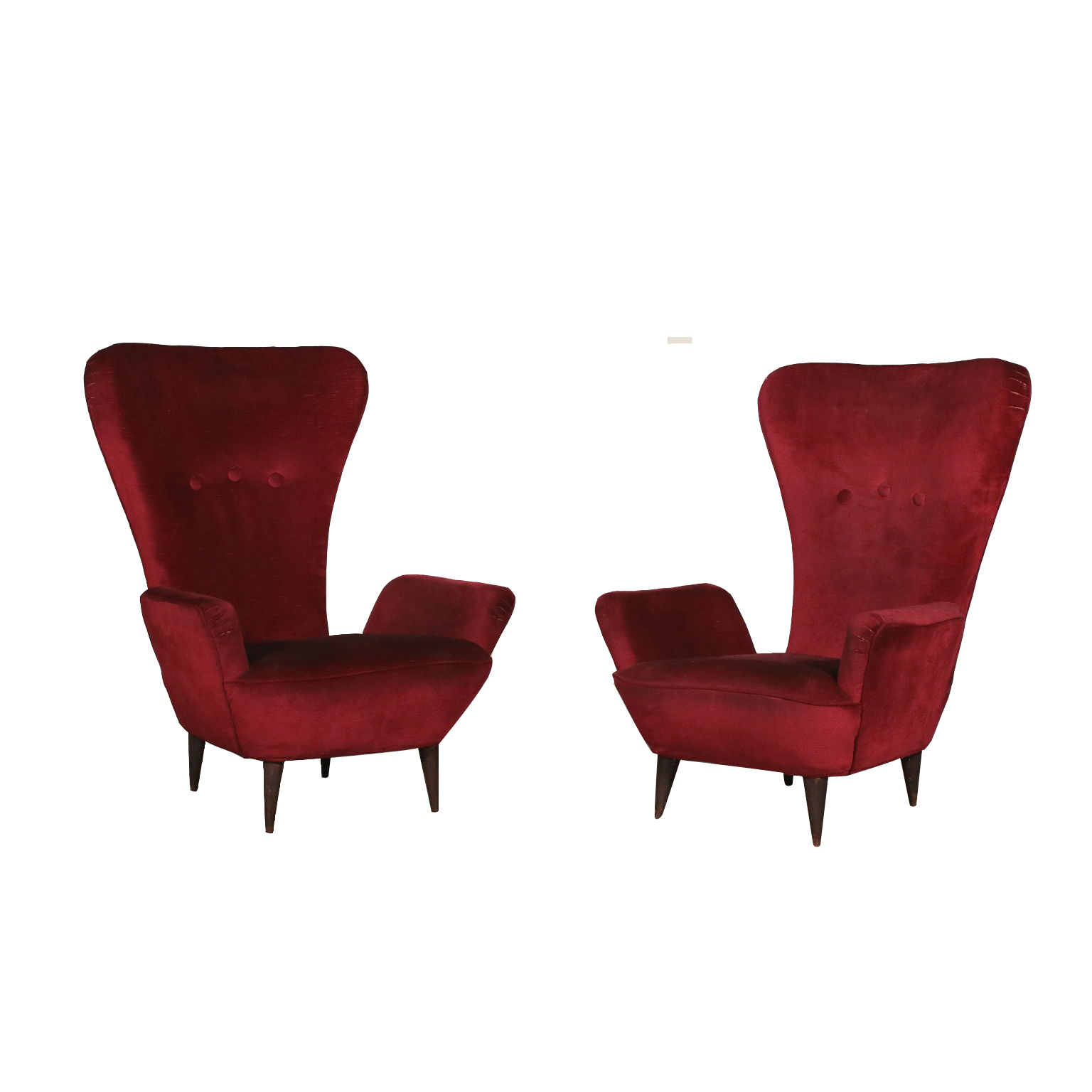 Coppia di poltrone; imbottitura molle e crine, rivestimento in velluto.