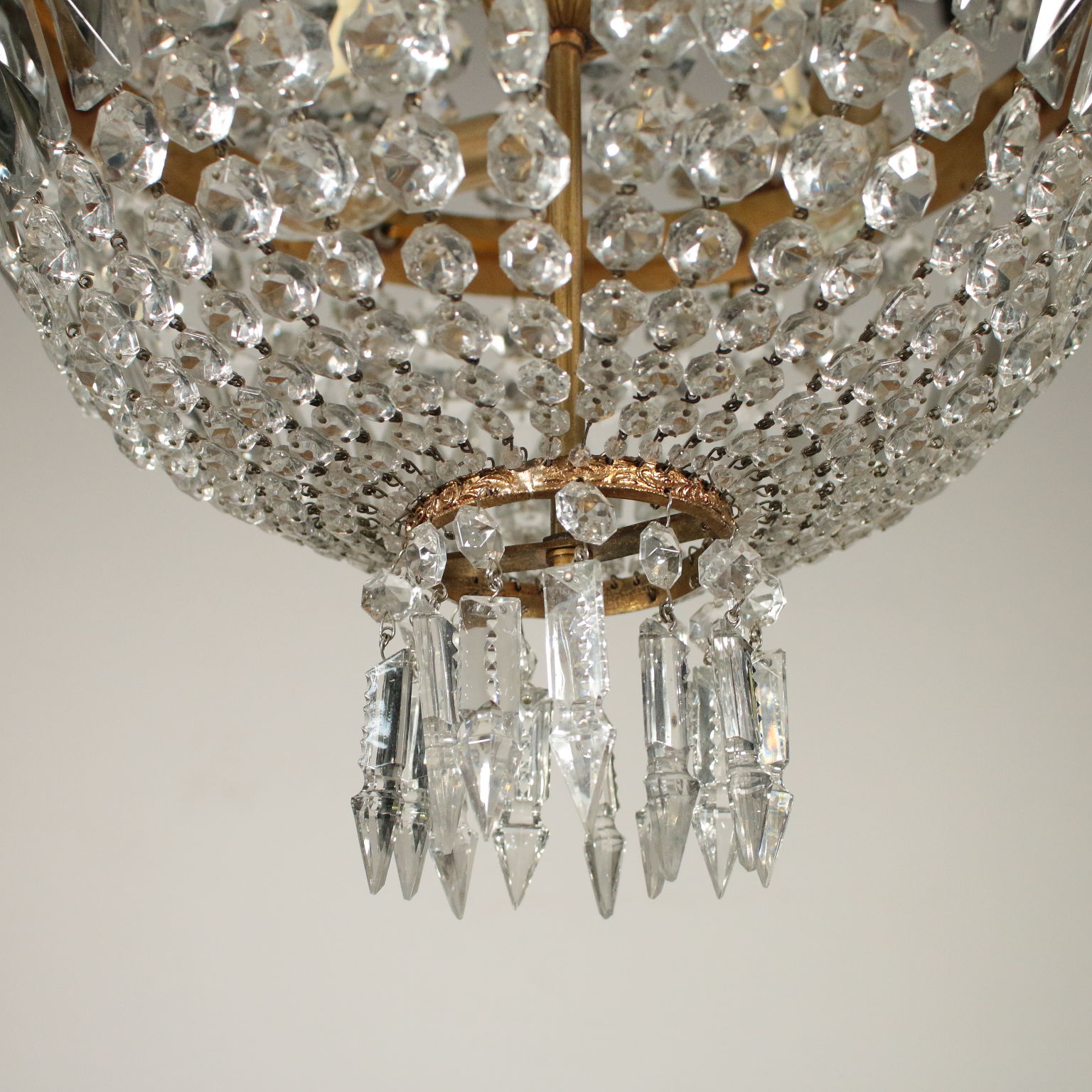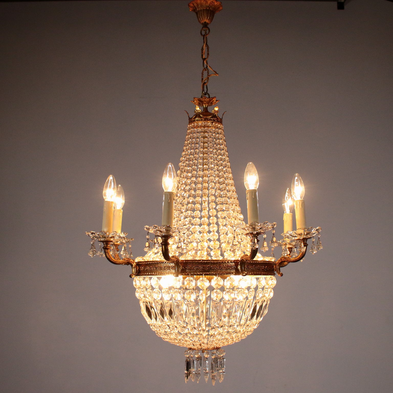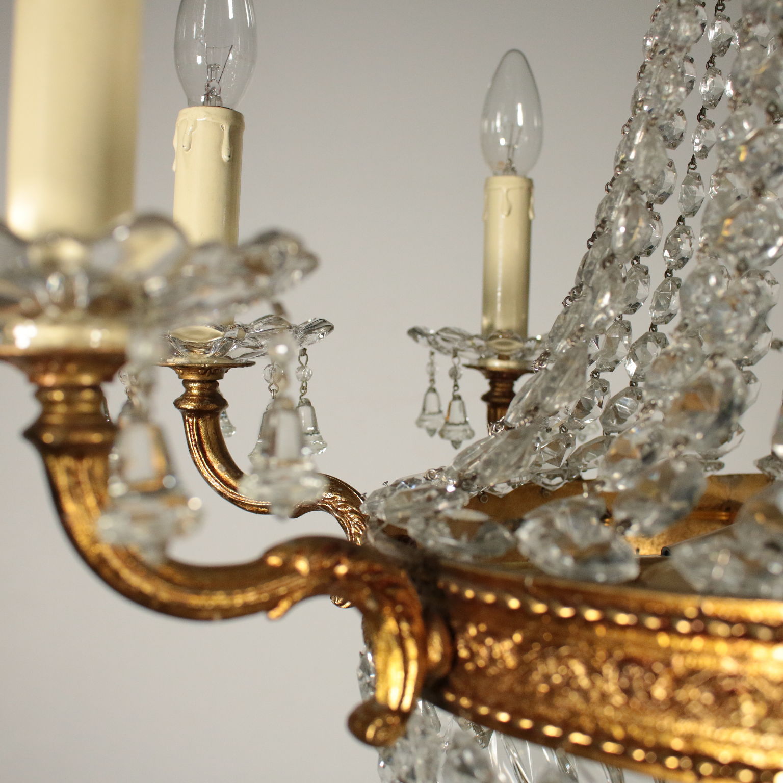 Lampadario a mongolfiera presenta fascia a otto bracci in bronzo dorato lavorato. Cordoni e pendenti in vetro. Dodici punti luci.