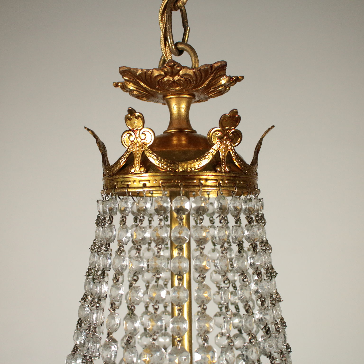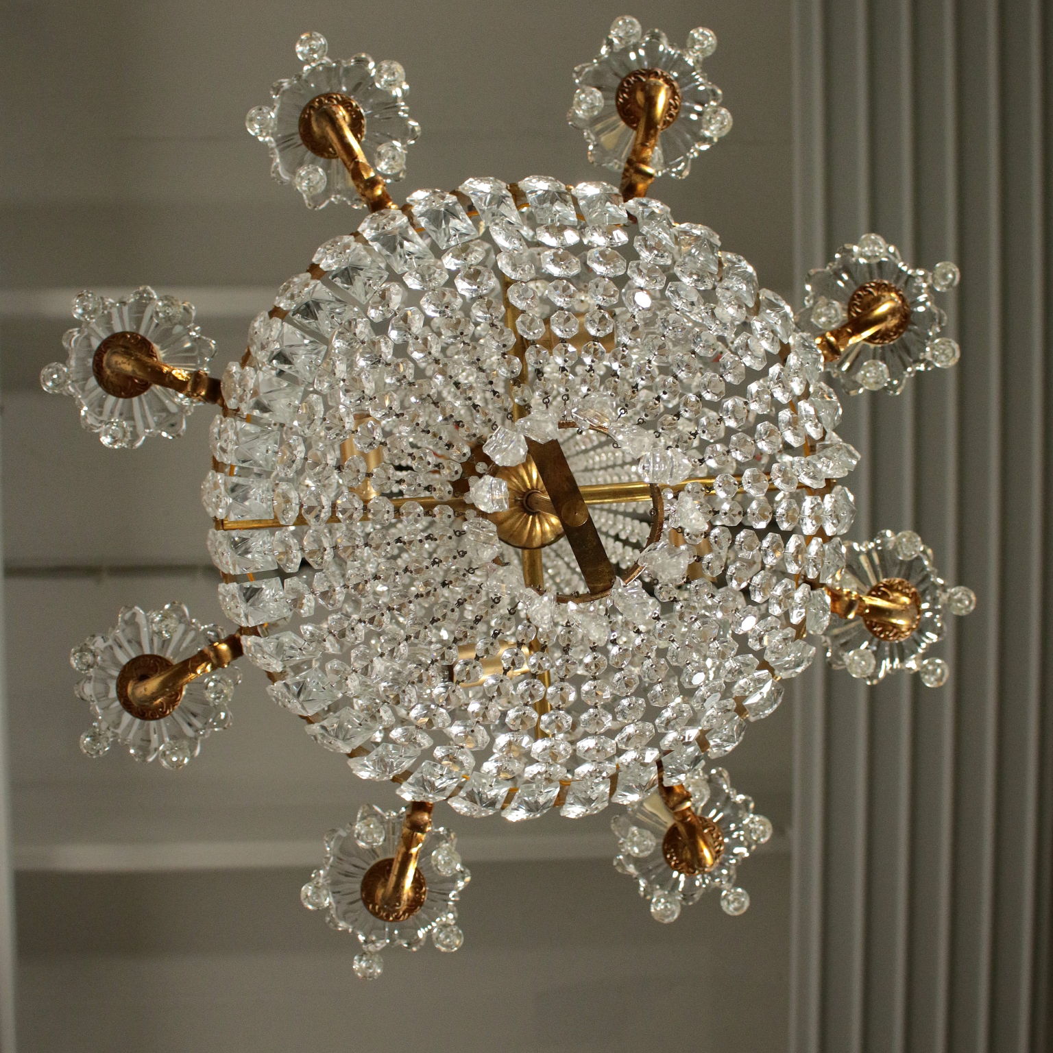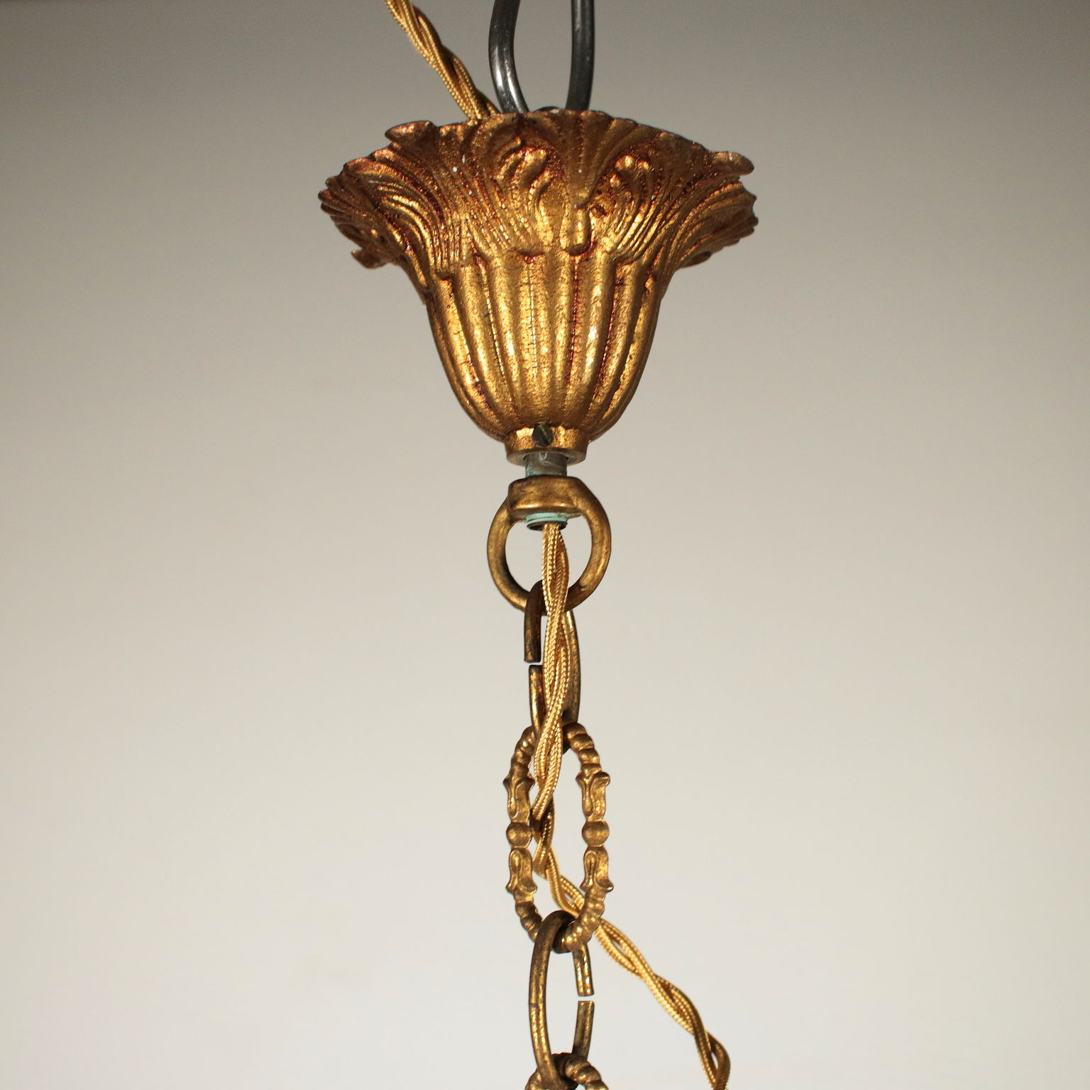 Lampadario a mongolfiera presenta fascia a otto bracci in bronzo dorato lavorato. Cordoni e pendenti in vetro. Dodici punti luci.