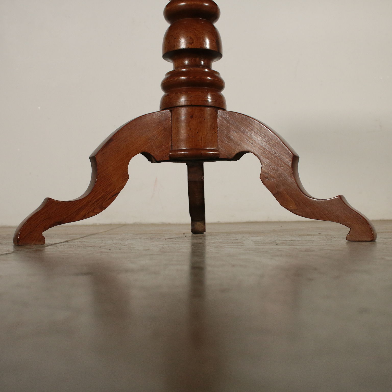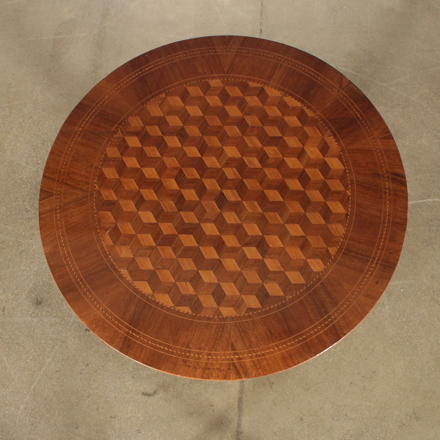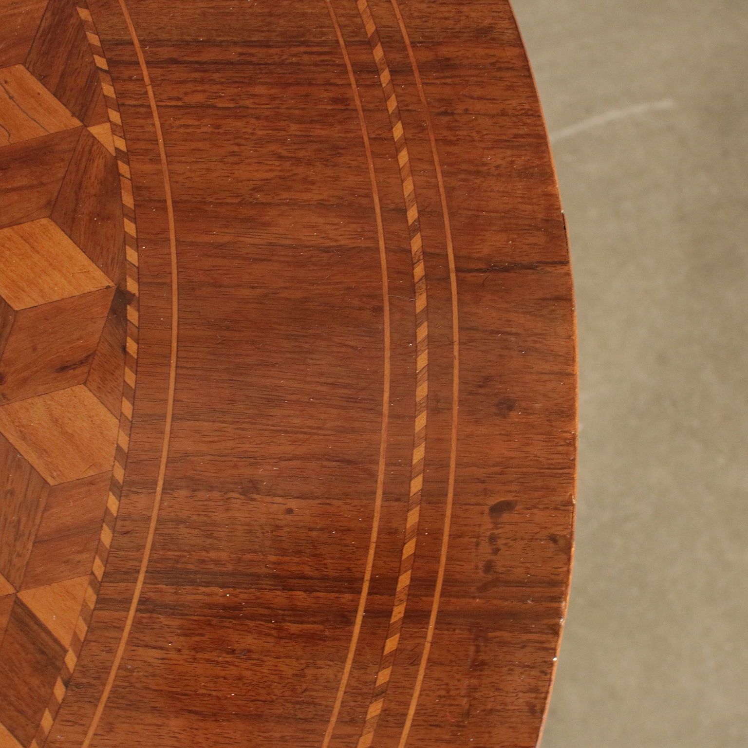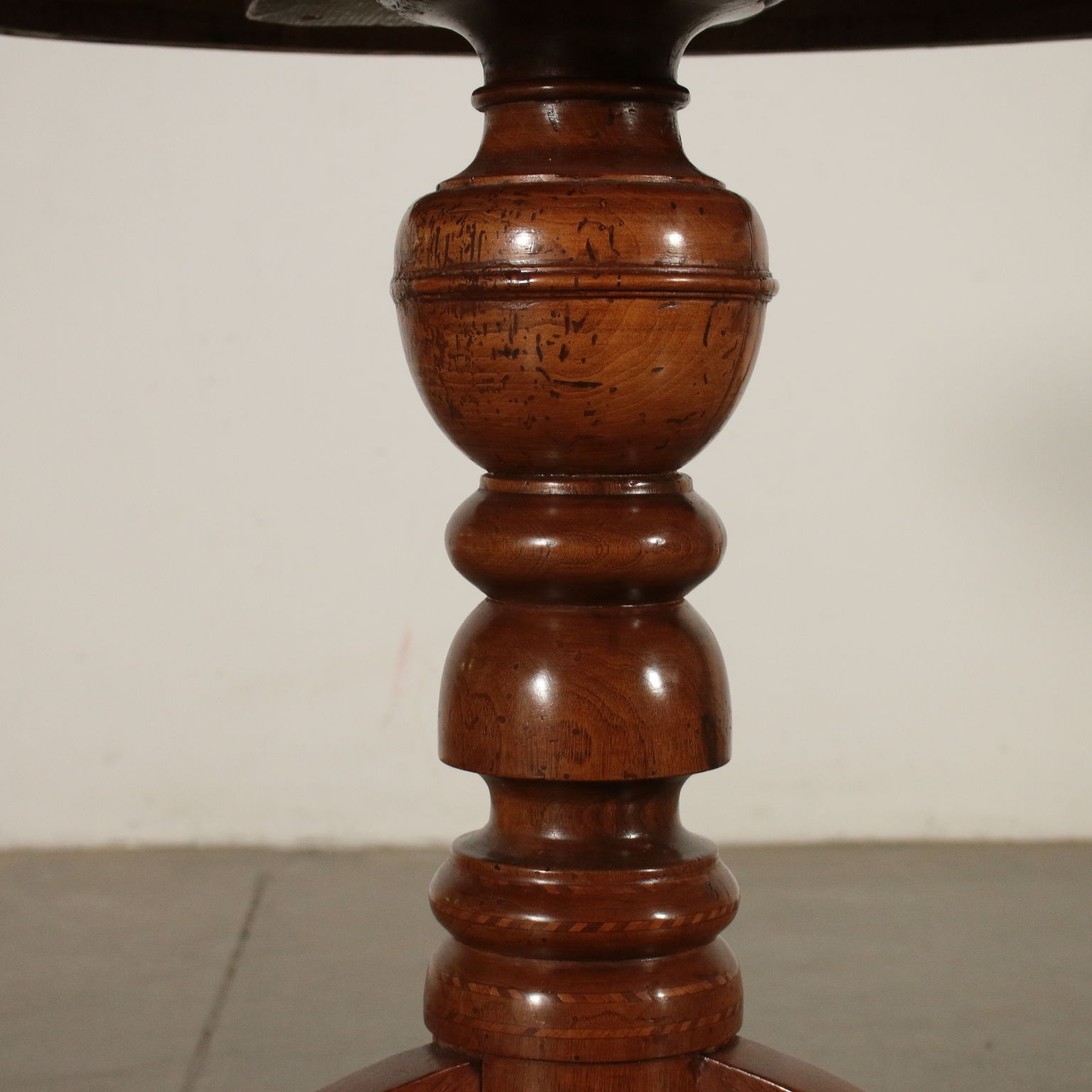 Retto da balaustro terminante con piedi mossi. Presenta piano tondo intarsiato a marqueterie.