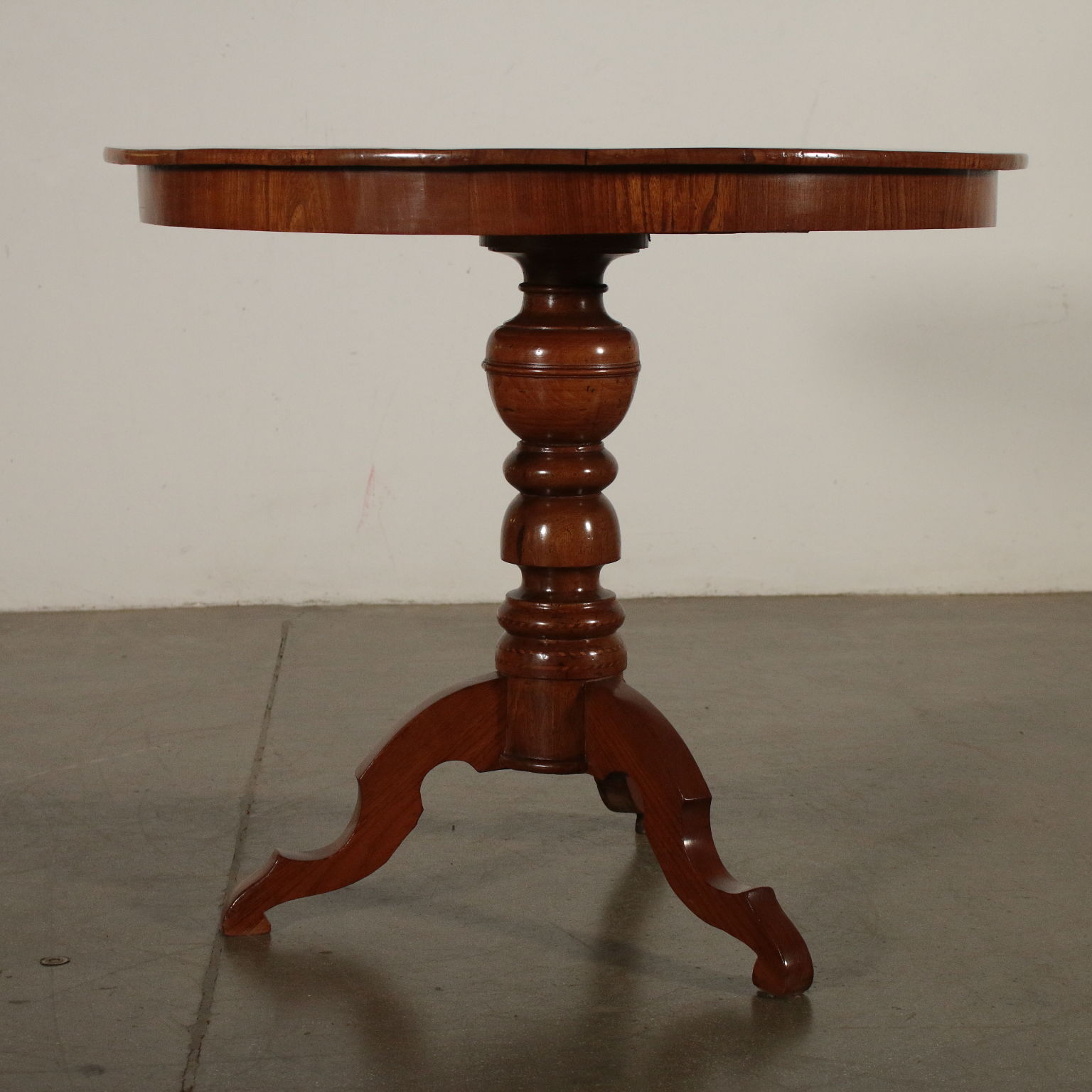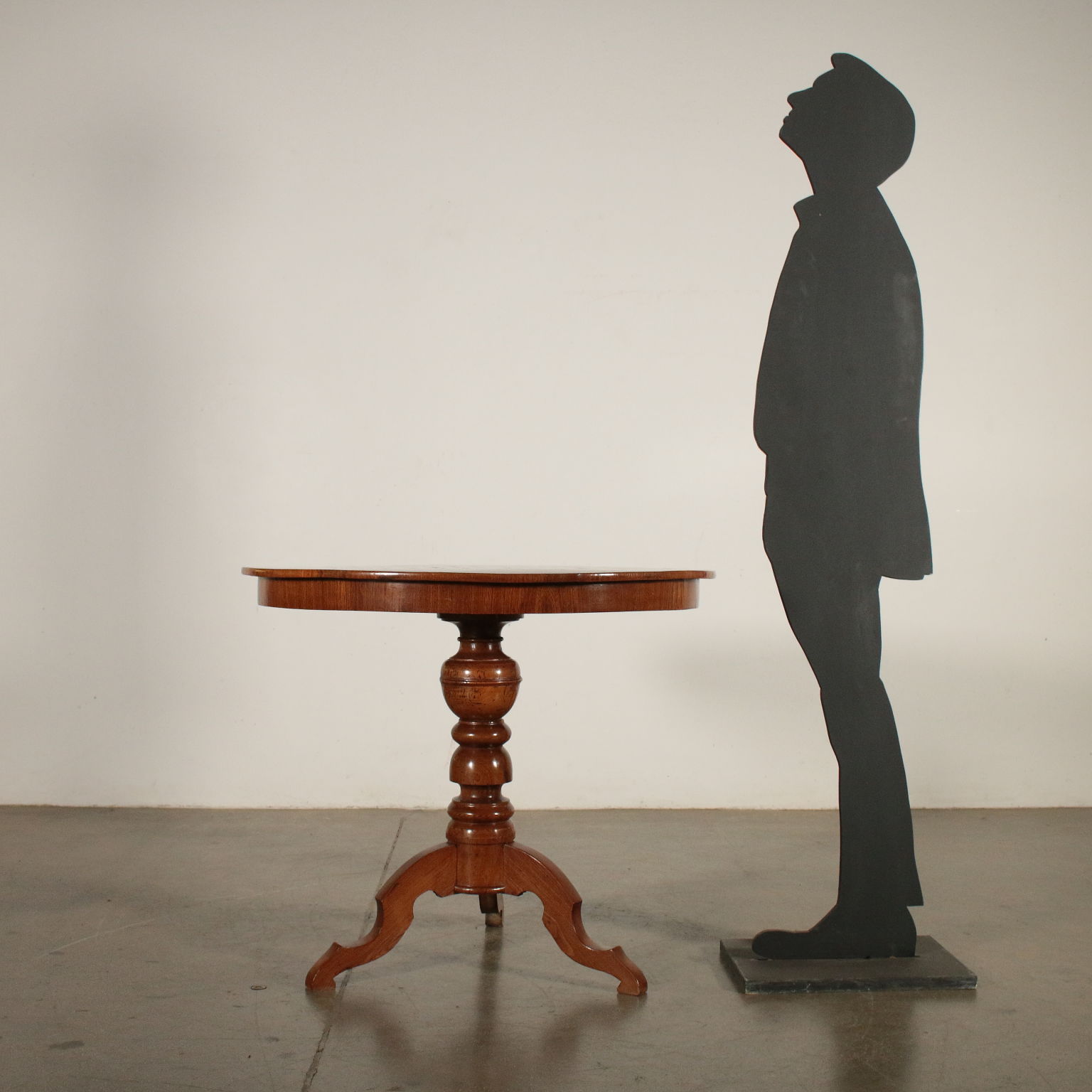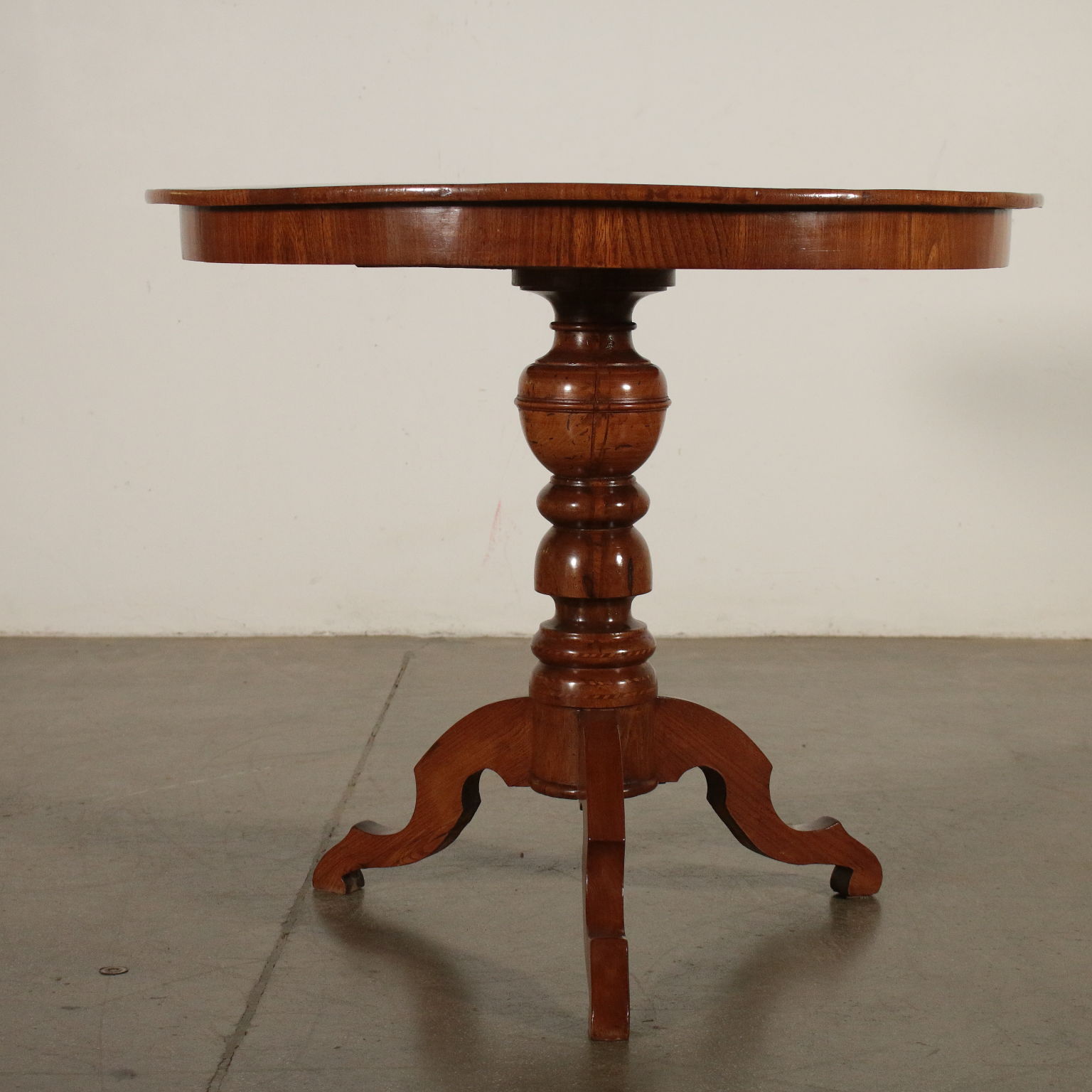 Retto da balaustro terminante con piedi mossi. Presenta piano tondo intarsiato a marqueterie.