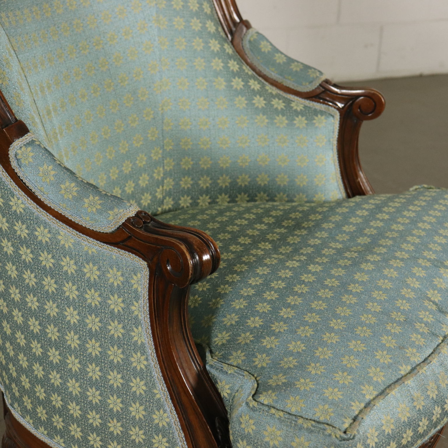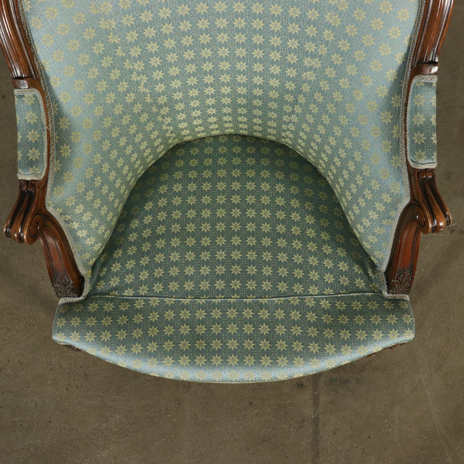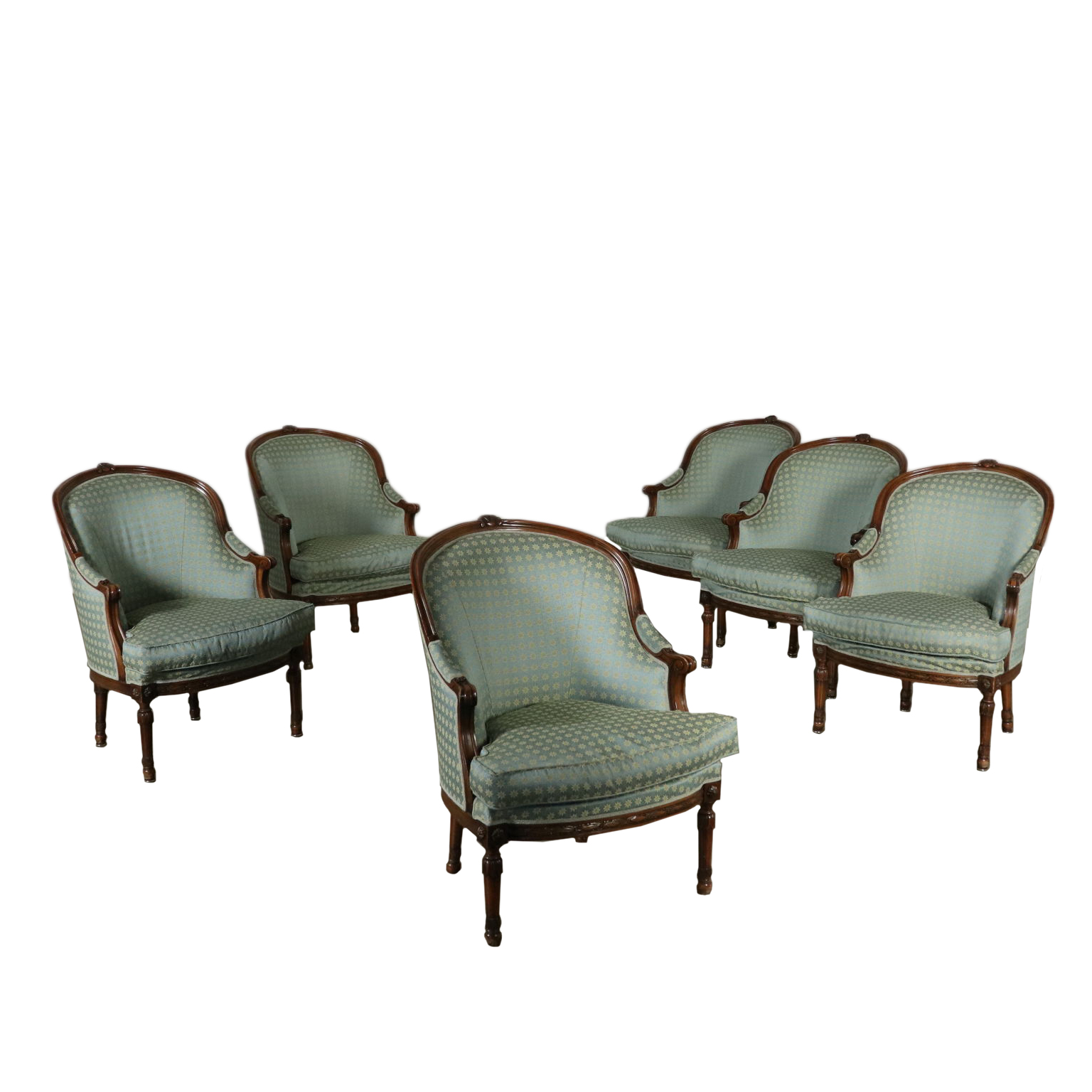 Gruppo di sei poltrone in stile rette da gambe tornite ed intagliate. Braccioli a ricciolo. Seduta e schienale imbottiti.