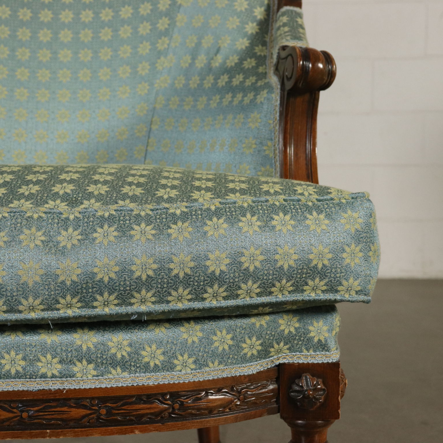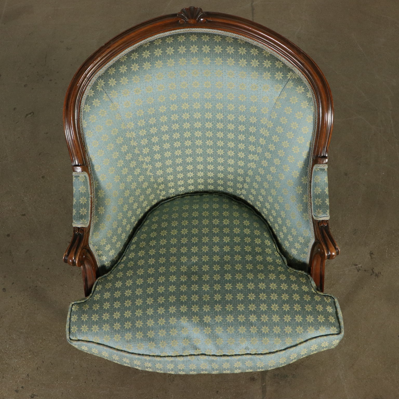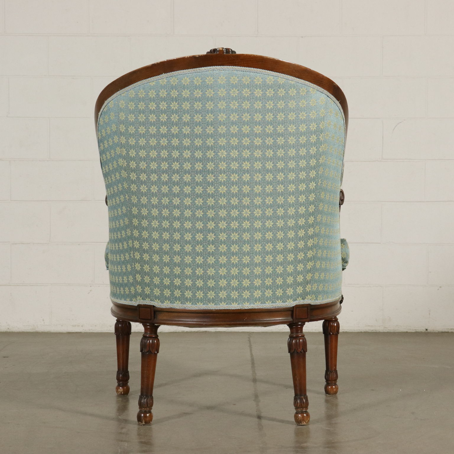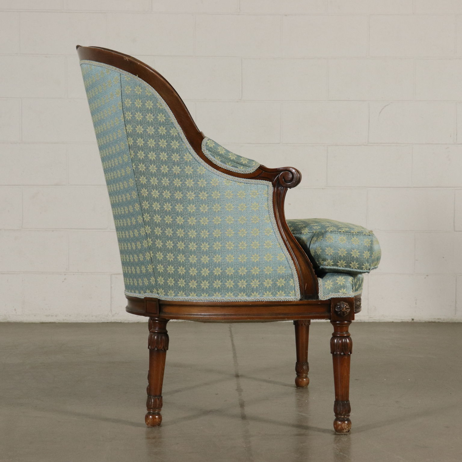 Gruppo di sei poltrone in stile rette da gambe tornite ed intagliate. Braccioli a ricciolo. Seduta e schienale imbottiti.