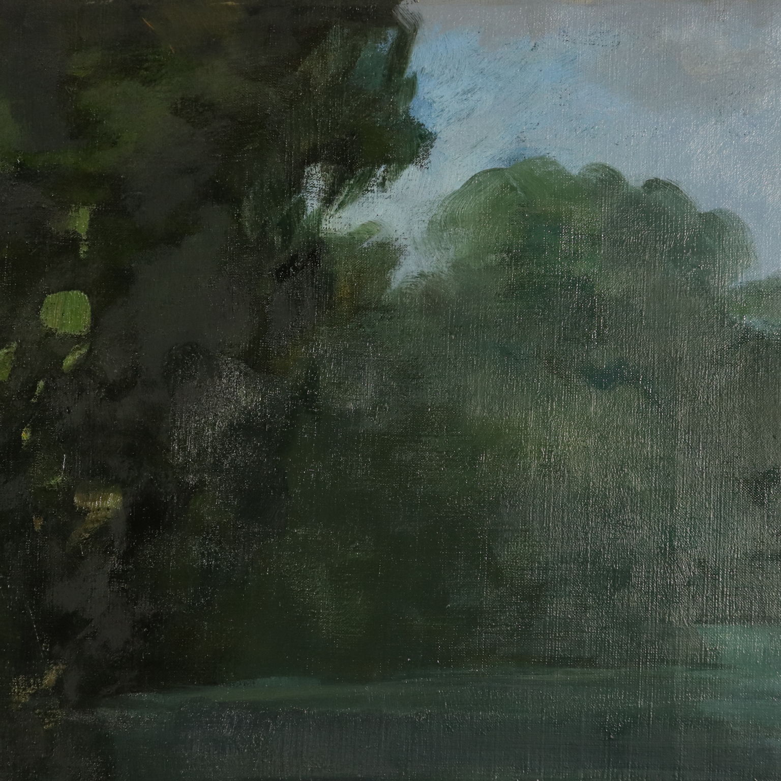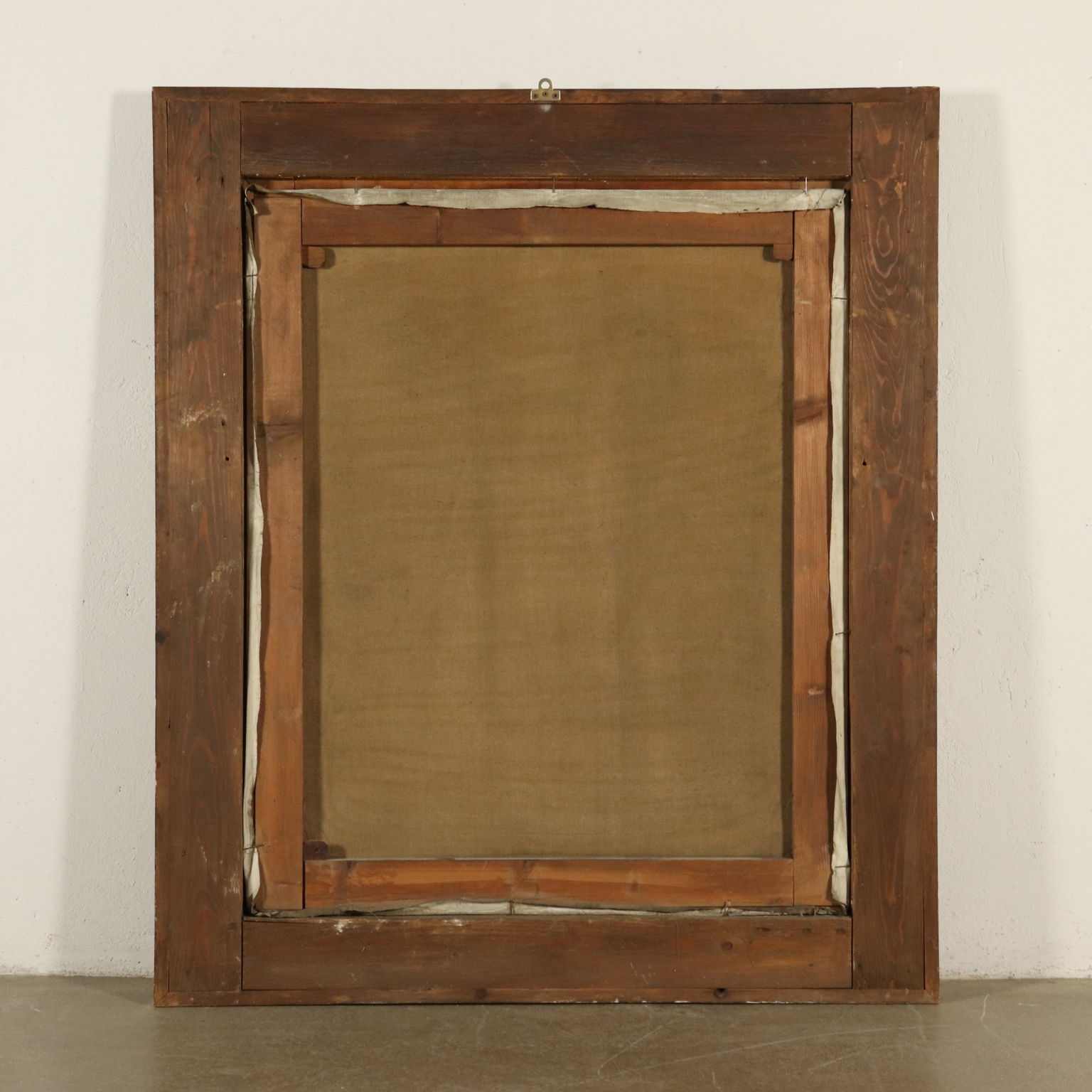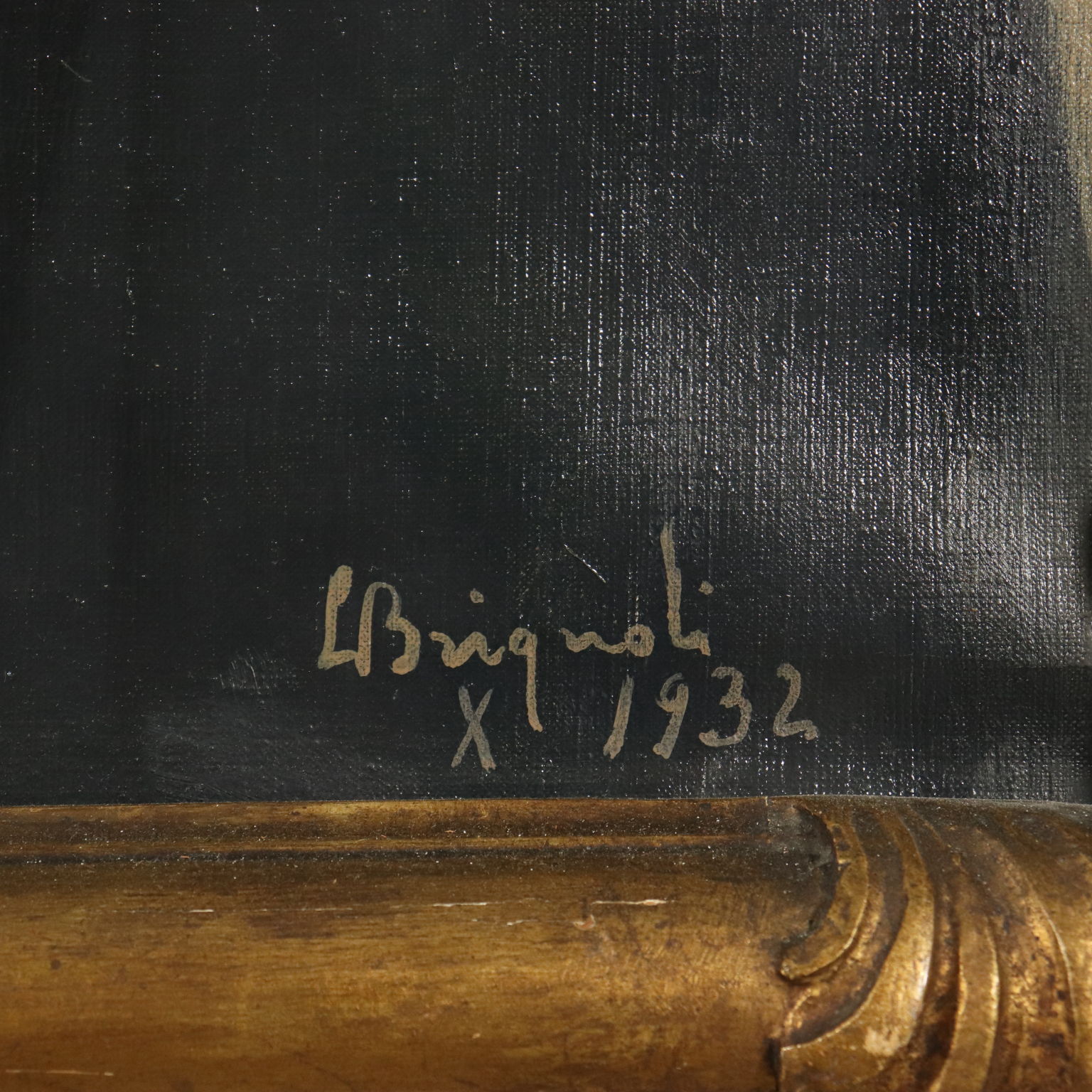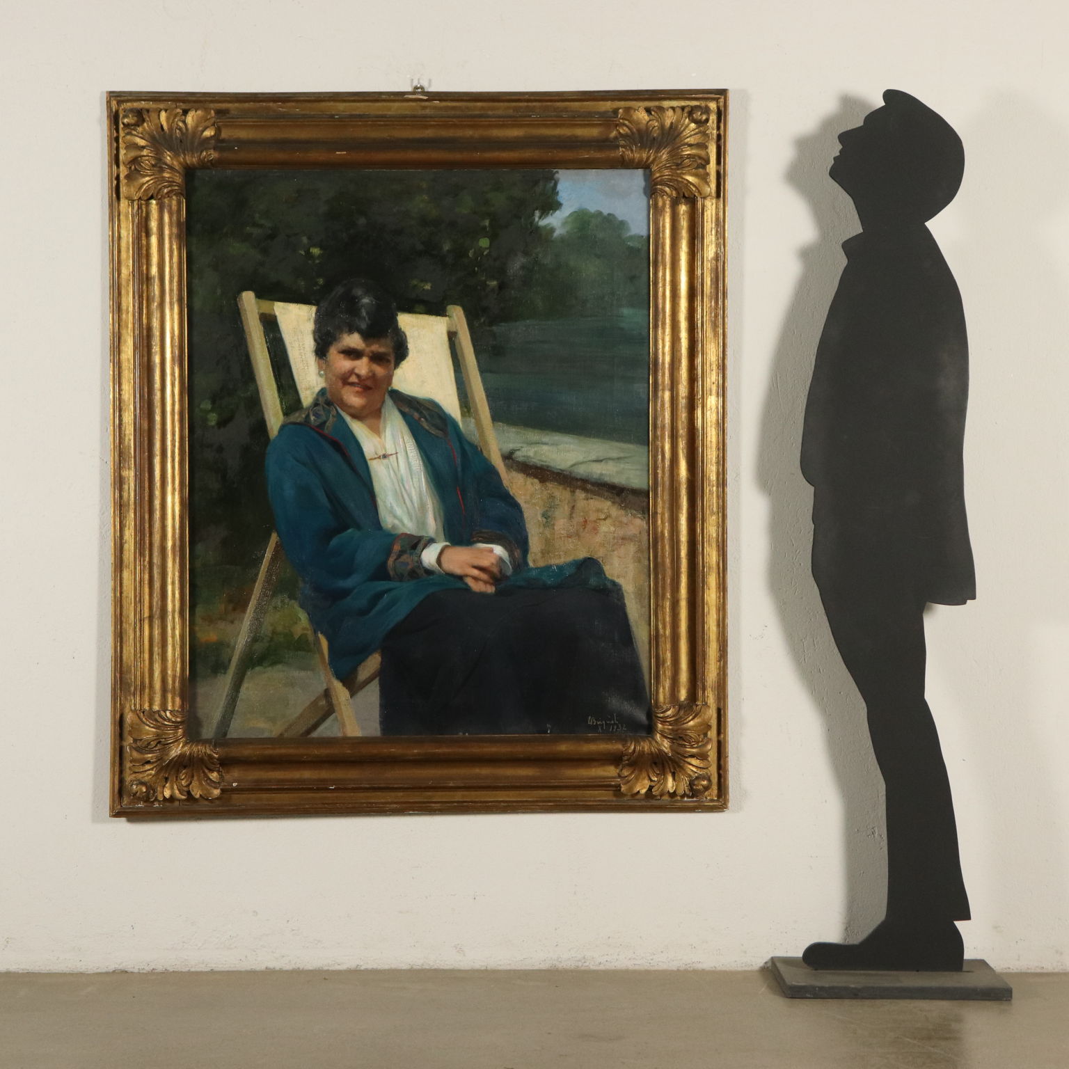 Olio su tela. Firmato in basso a destra e datato, con la doppia datazione in numero romano X dell'era fascista e in cifre arabe 1932. E' un gradevole ritratto di un'anziana signora, sorridente e compostamente seduta su una sdraio di una terrazza che si affaccia su un paesaggio fluviale. L'opera rientra pienamente nella produzione di Luigi Brignoli, pittore bergamasco formatosi prima all'Accademia Carrara con Tallone e poi all'Accademia di Brera, che fu apprezzato per i suoi paesaggi di tradizione lombarda e fu molto stimato come ritrattista. Il dipinto è presentato in bella cornice dorata coeva.