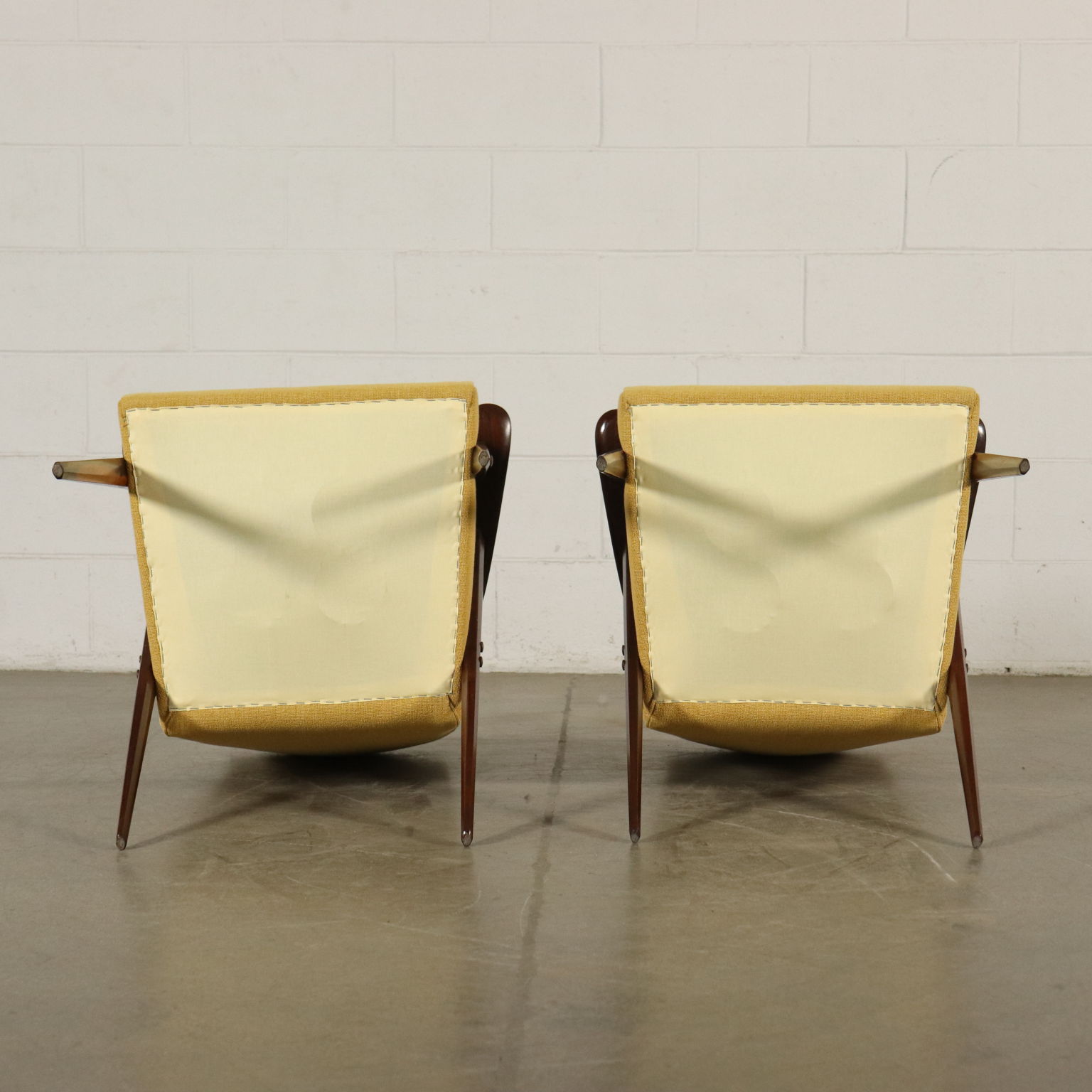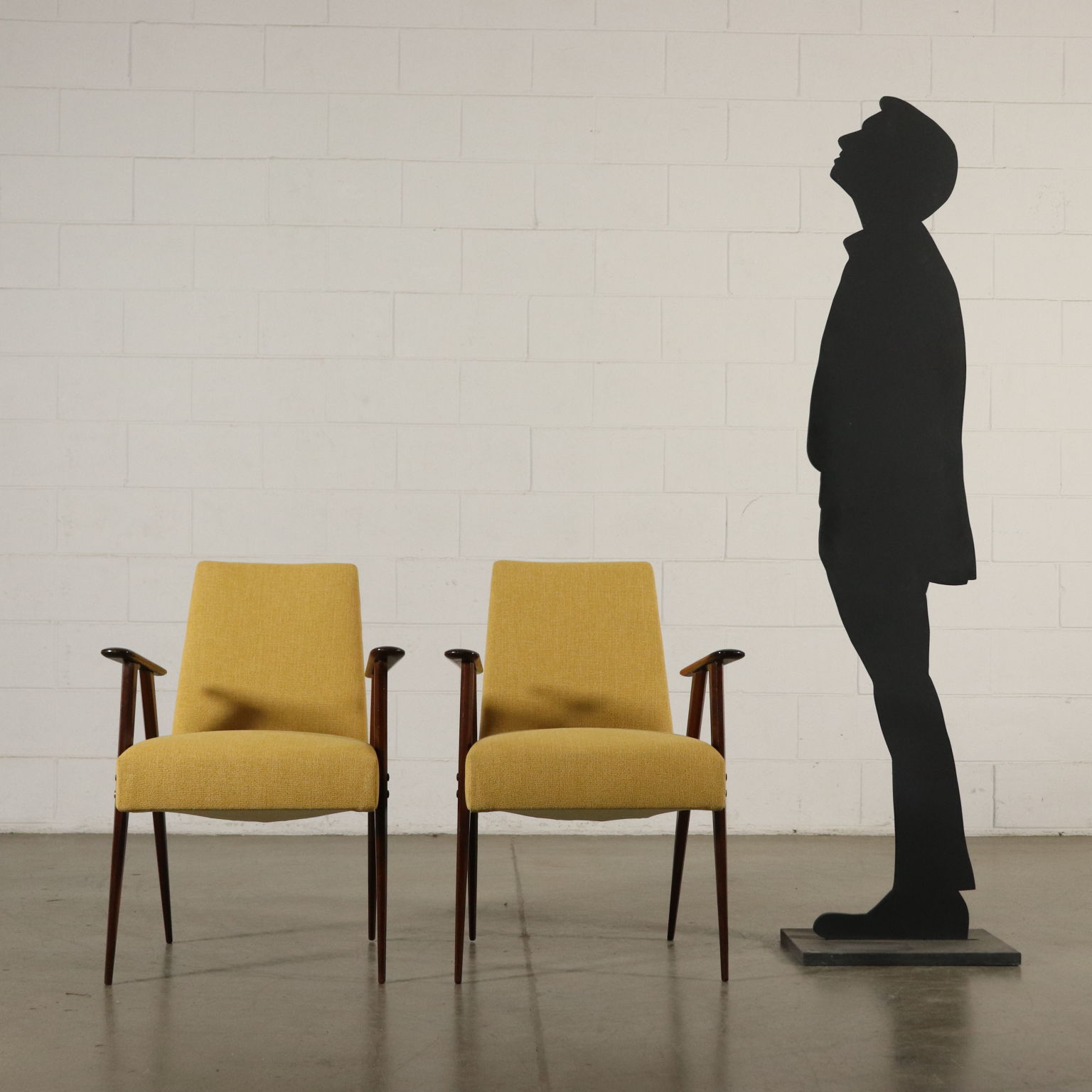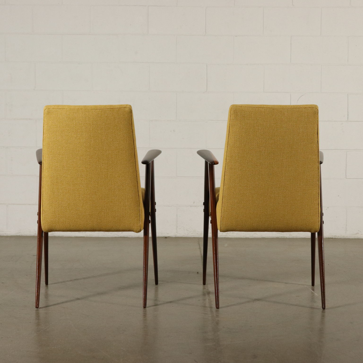 Coppia di poltrone; legno di mogano, imbottitura in espanso, rivestimento in tessuto.