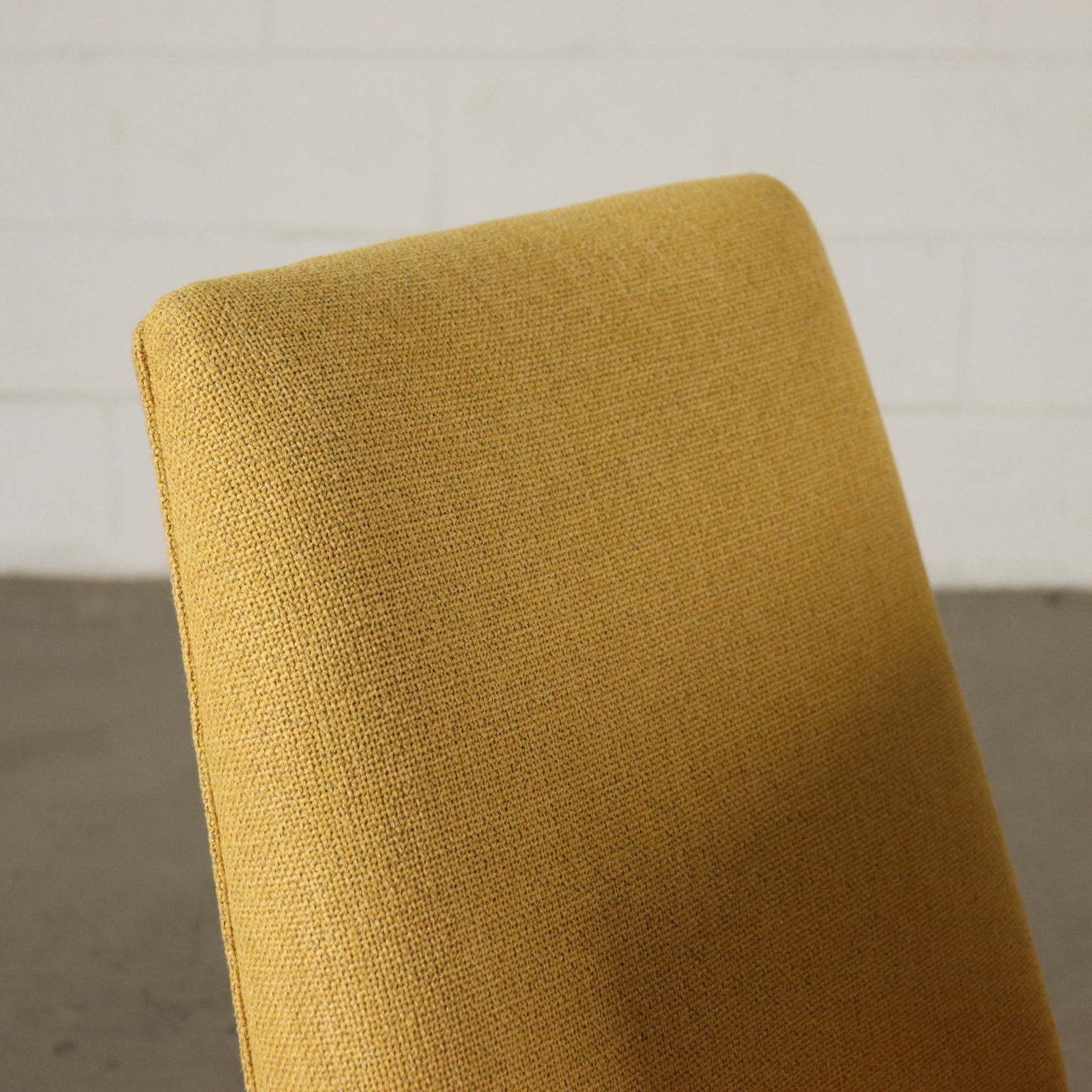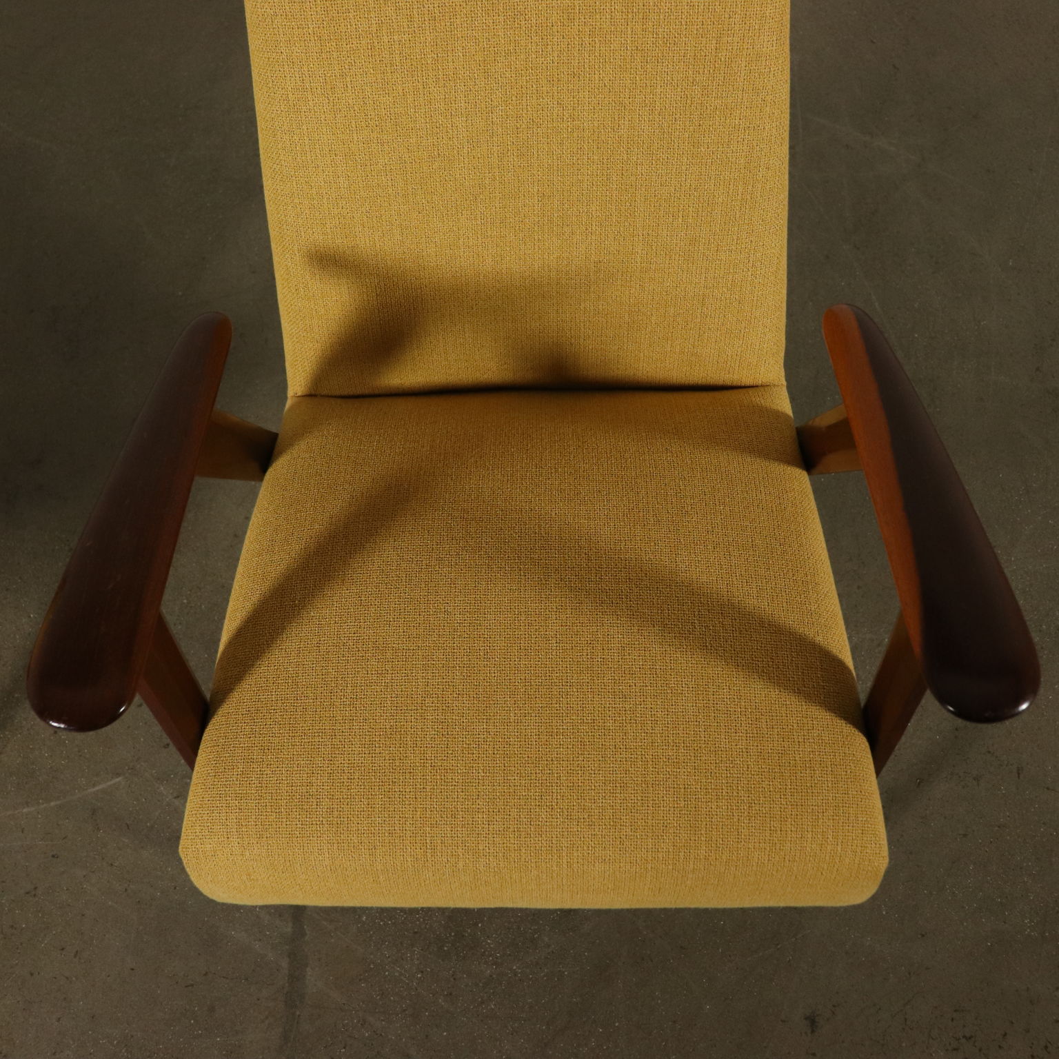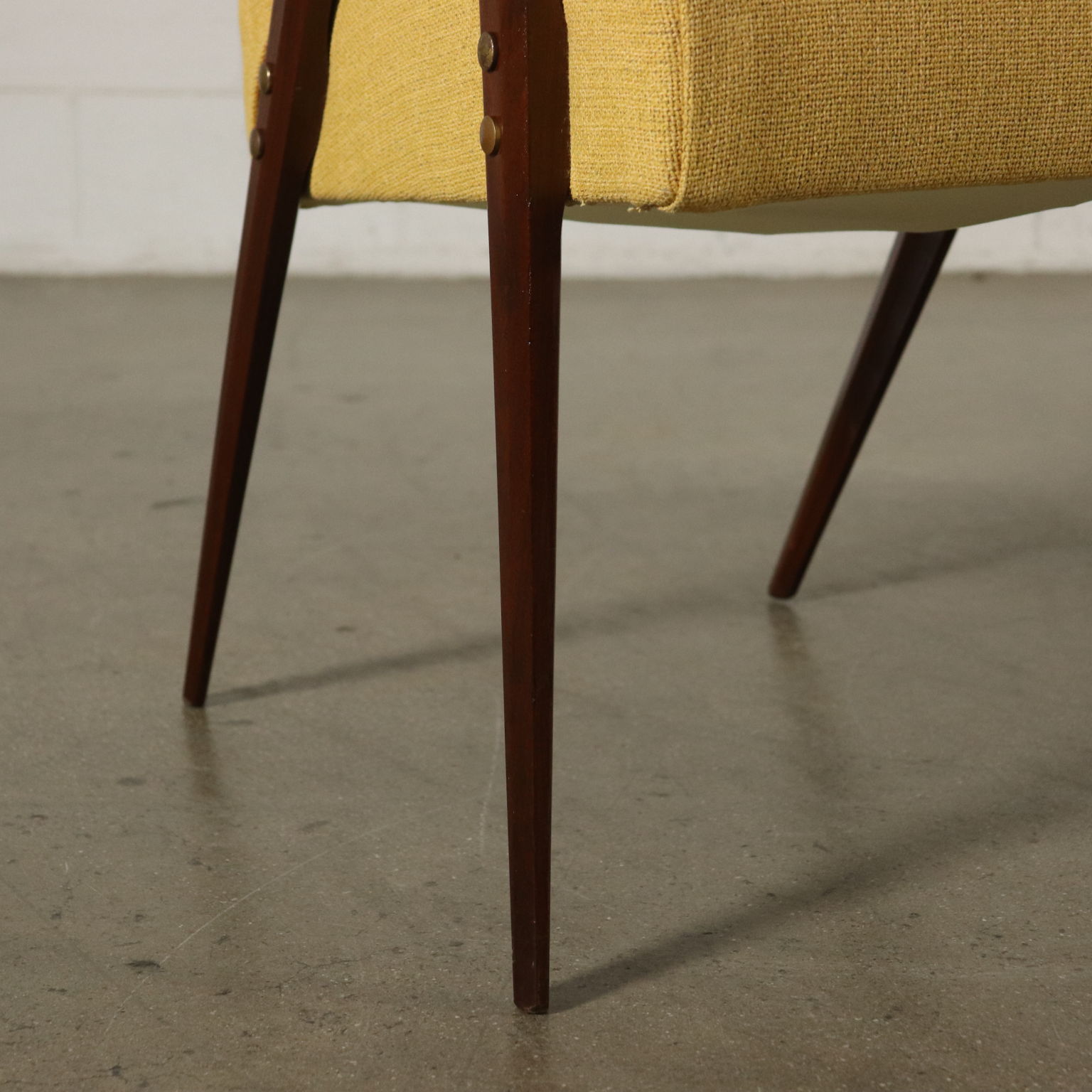 Coppia di poltrone; legno di mogano, imbottitura in espanso, rivestimento in tessuto.