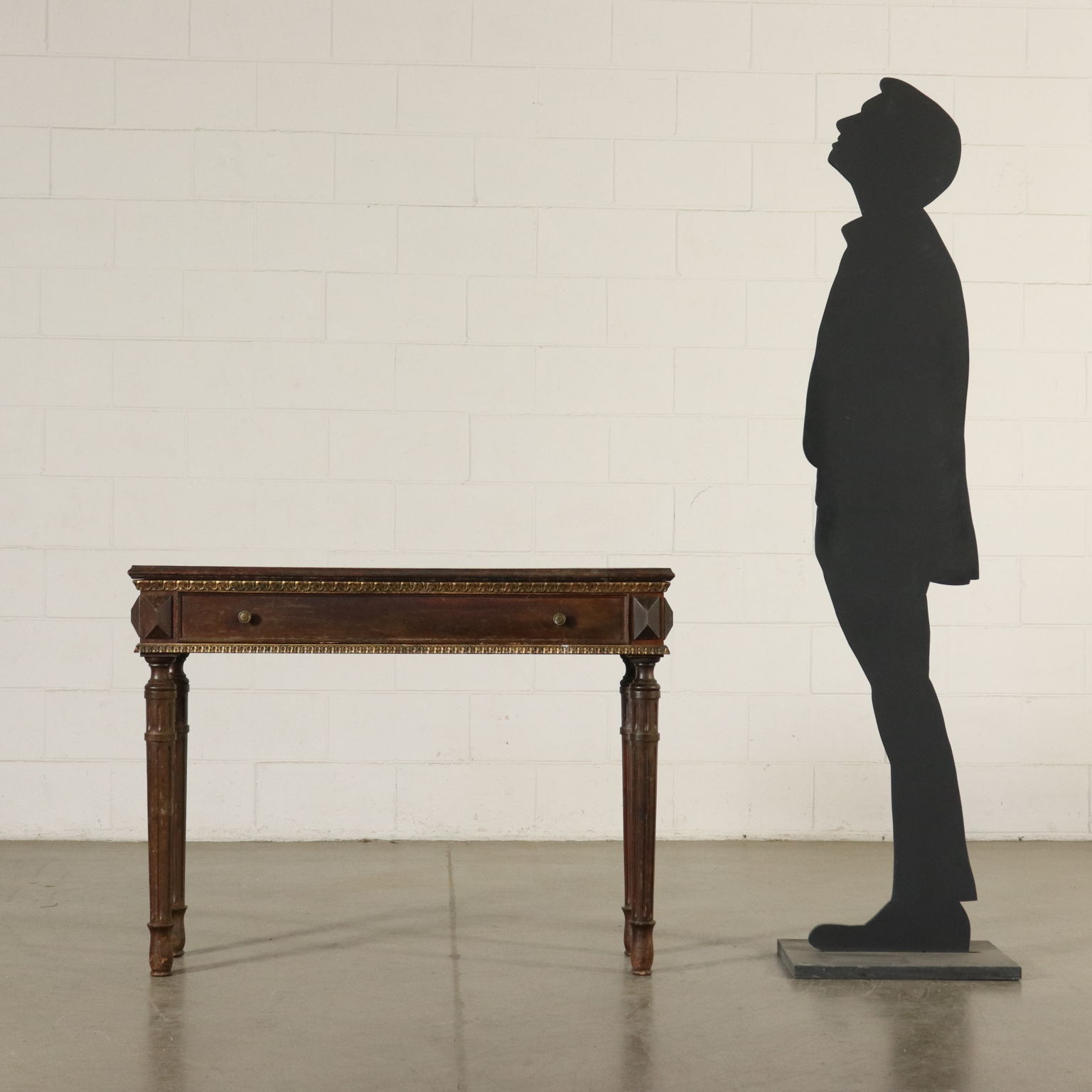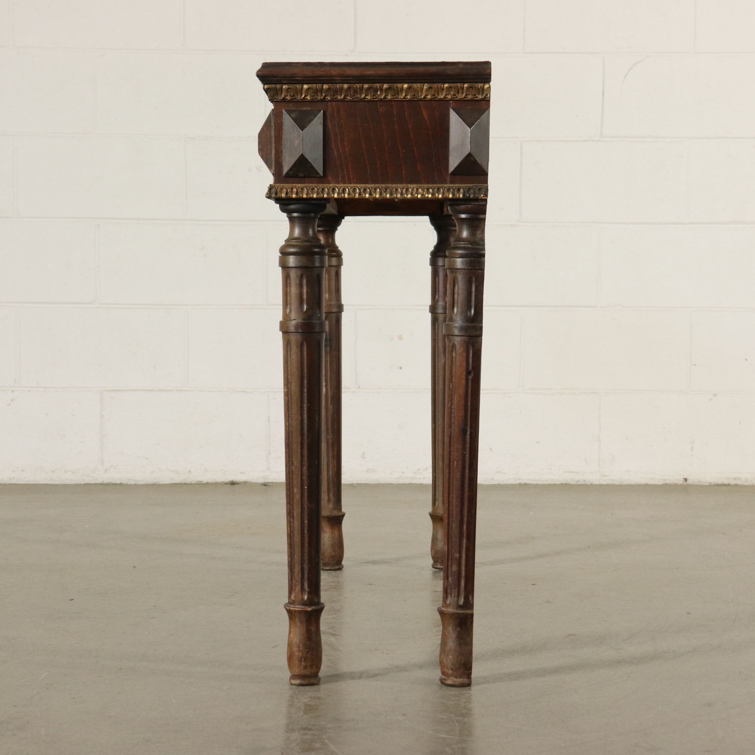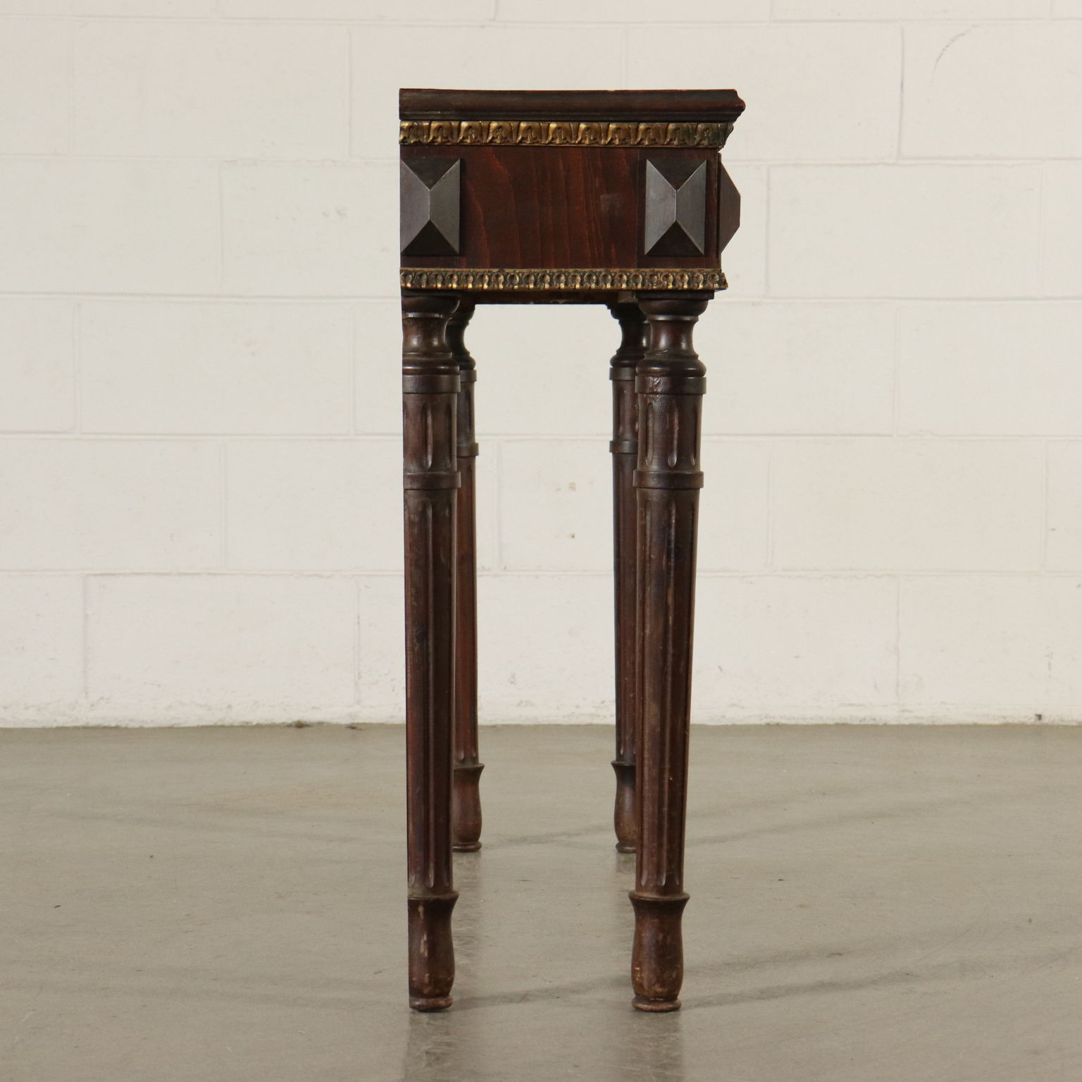 Piccola consolle retta da gambe troncoconiche. Presenta cornici intagliate e dorate e un cassetto nella fascia.