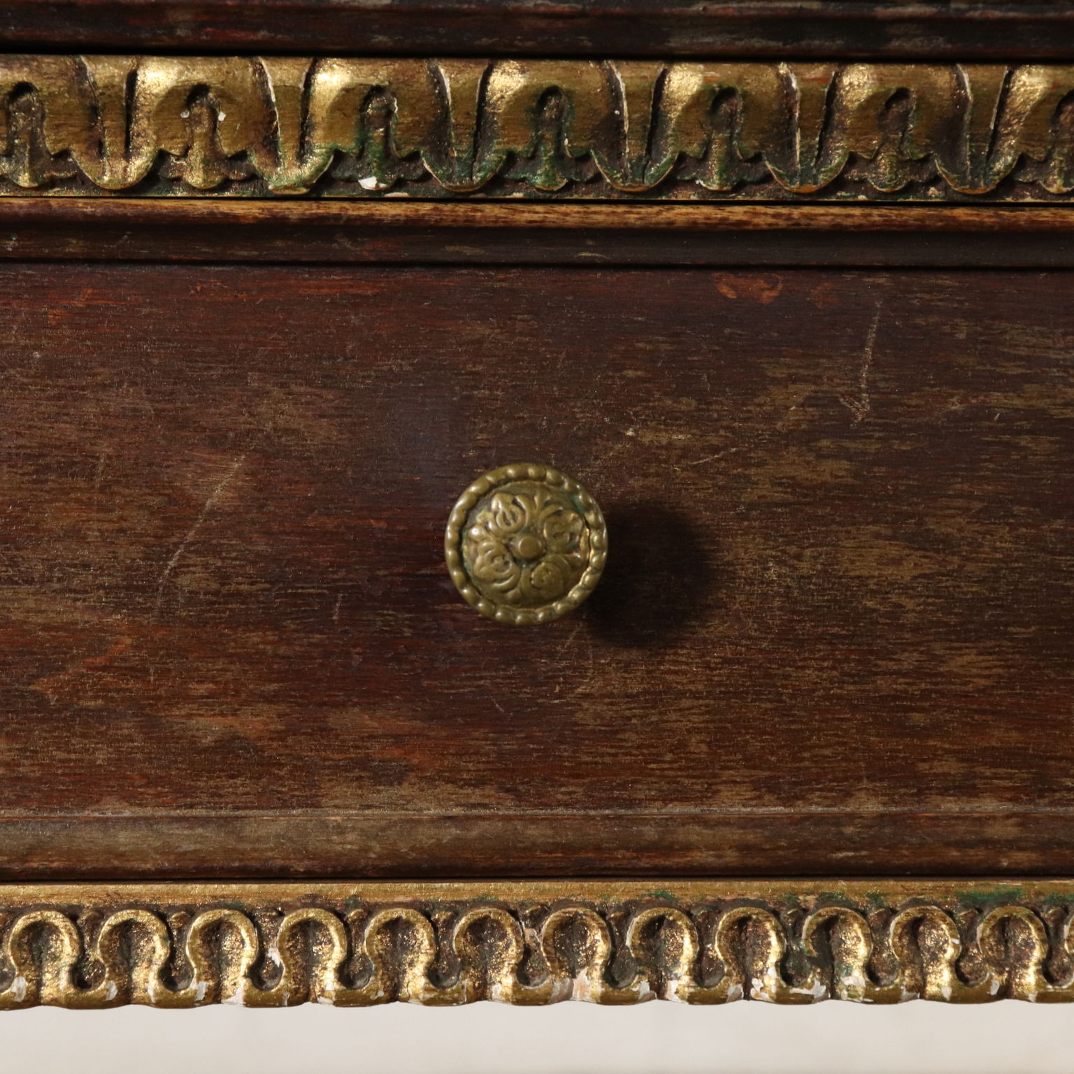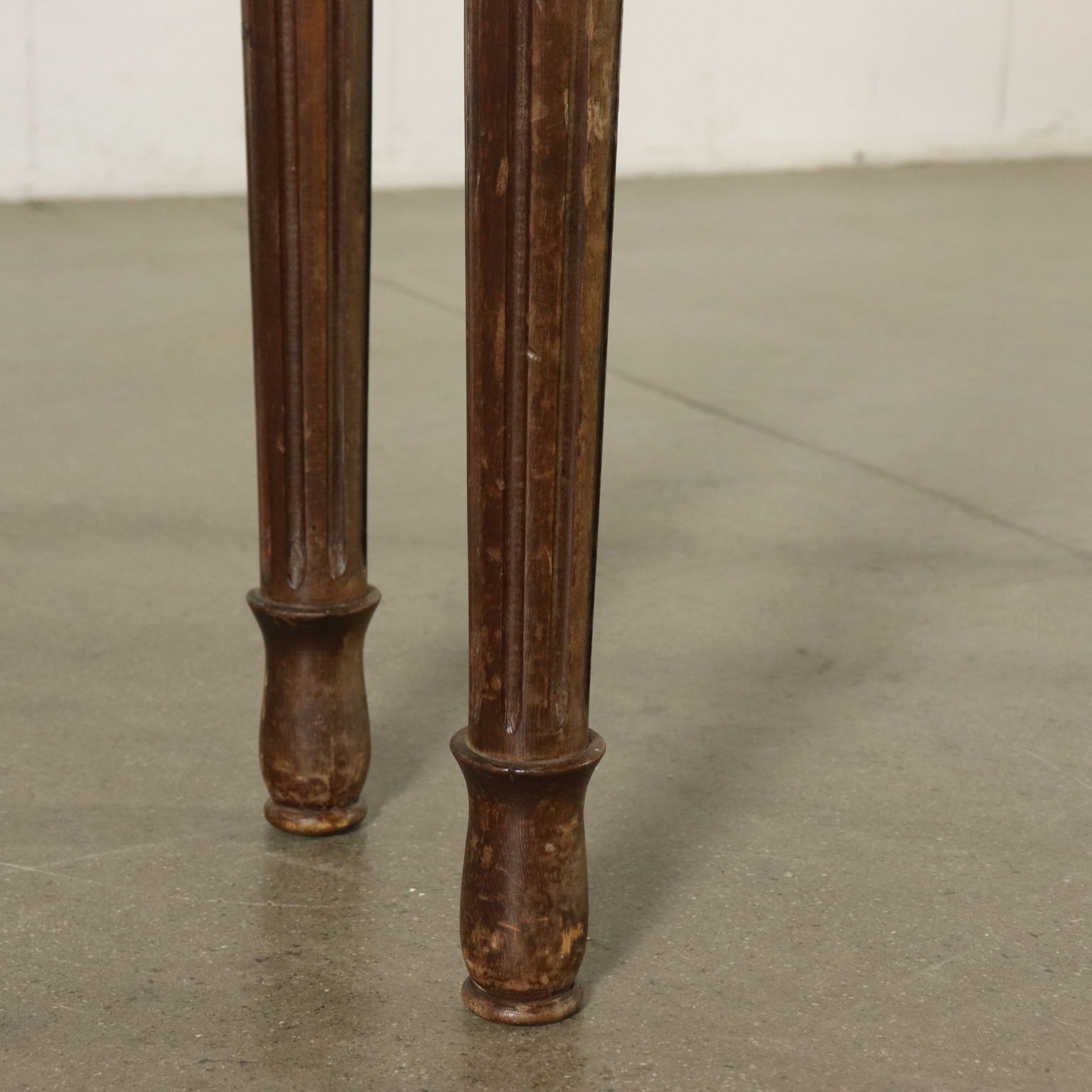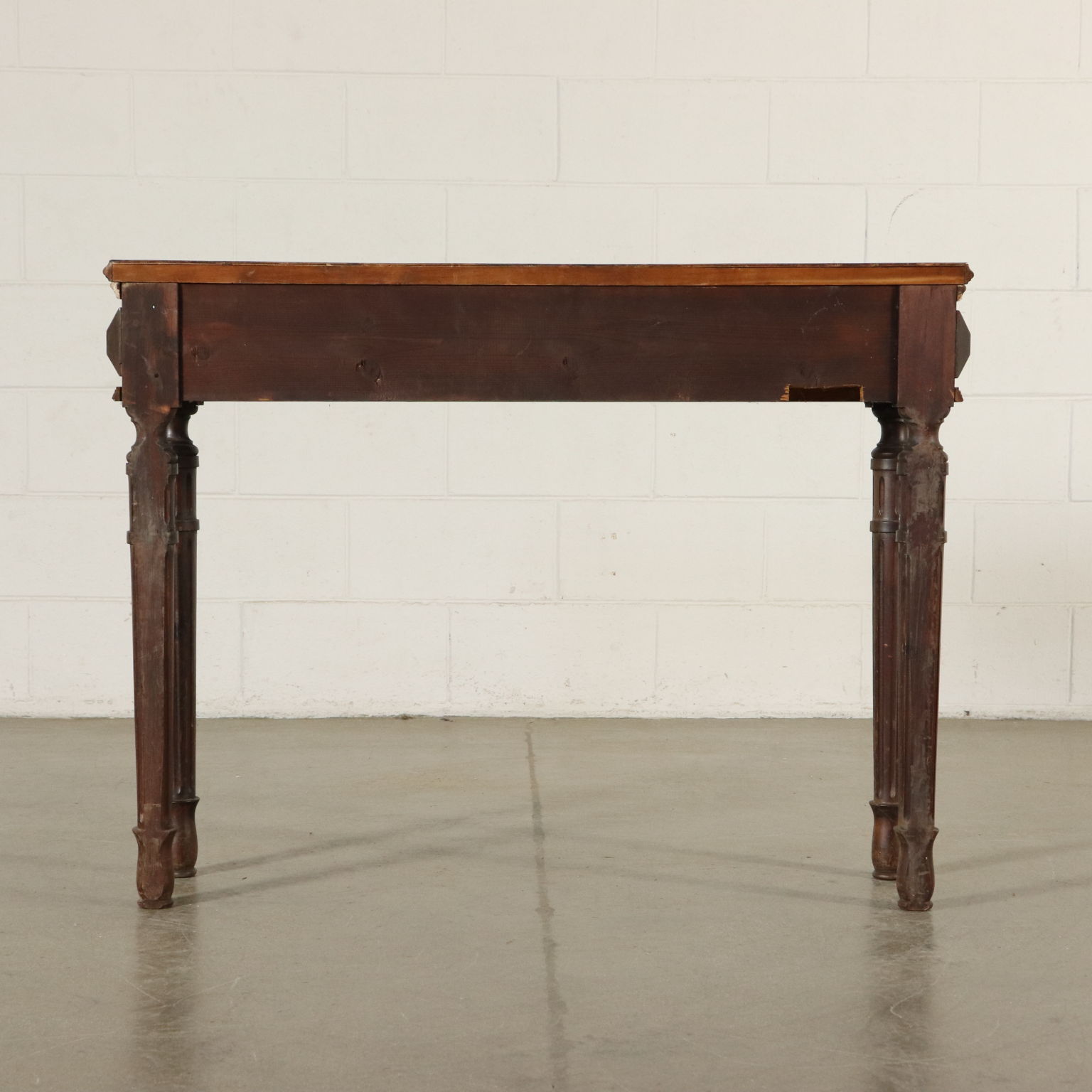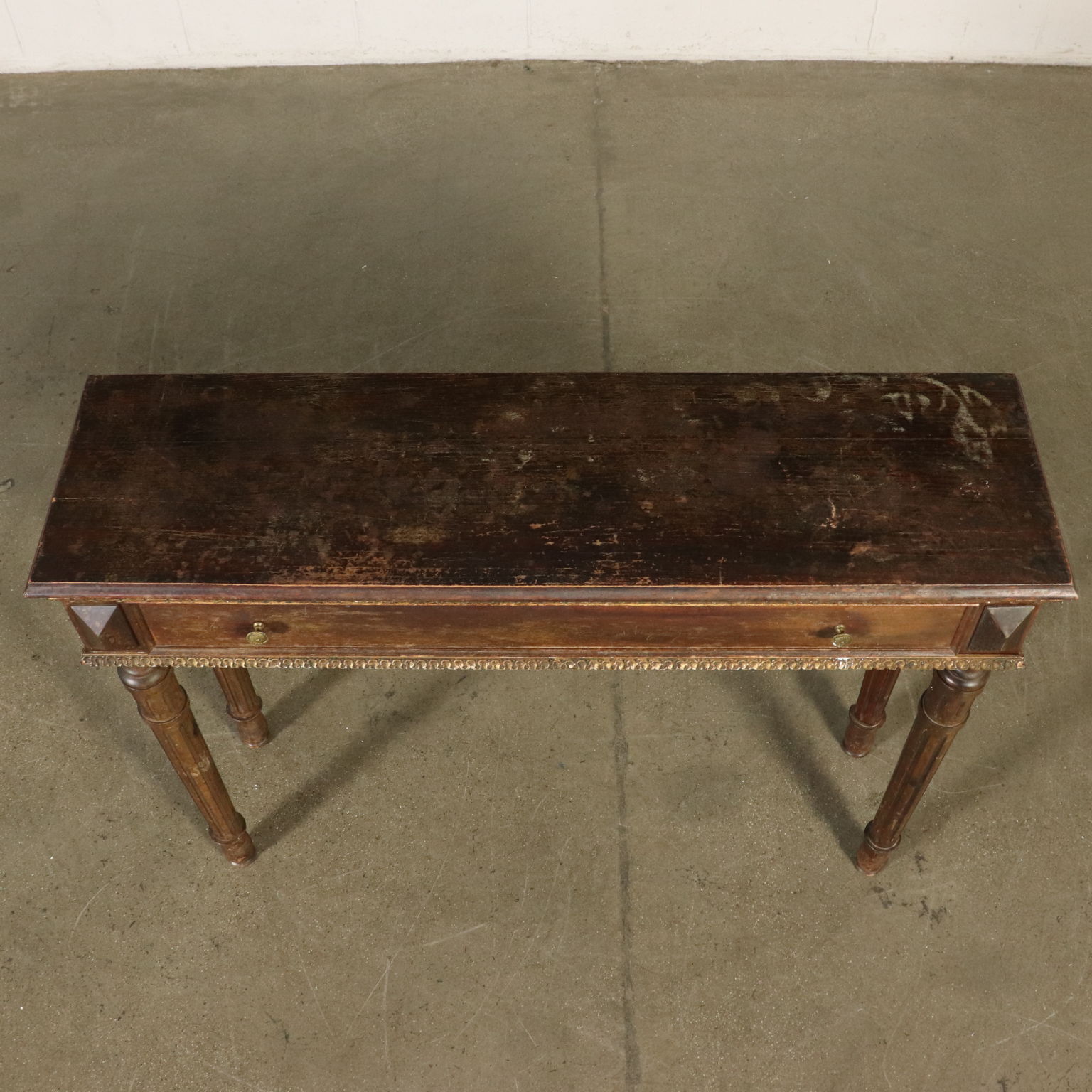 Piccola consolle retta da gambe troncoconiche. Presenta cornici intagliate e dorate e un cassetto nella fascia.