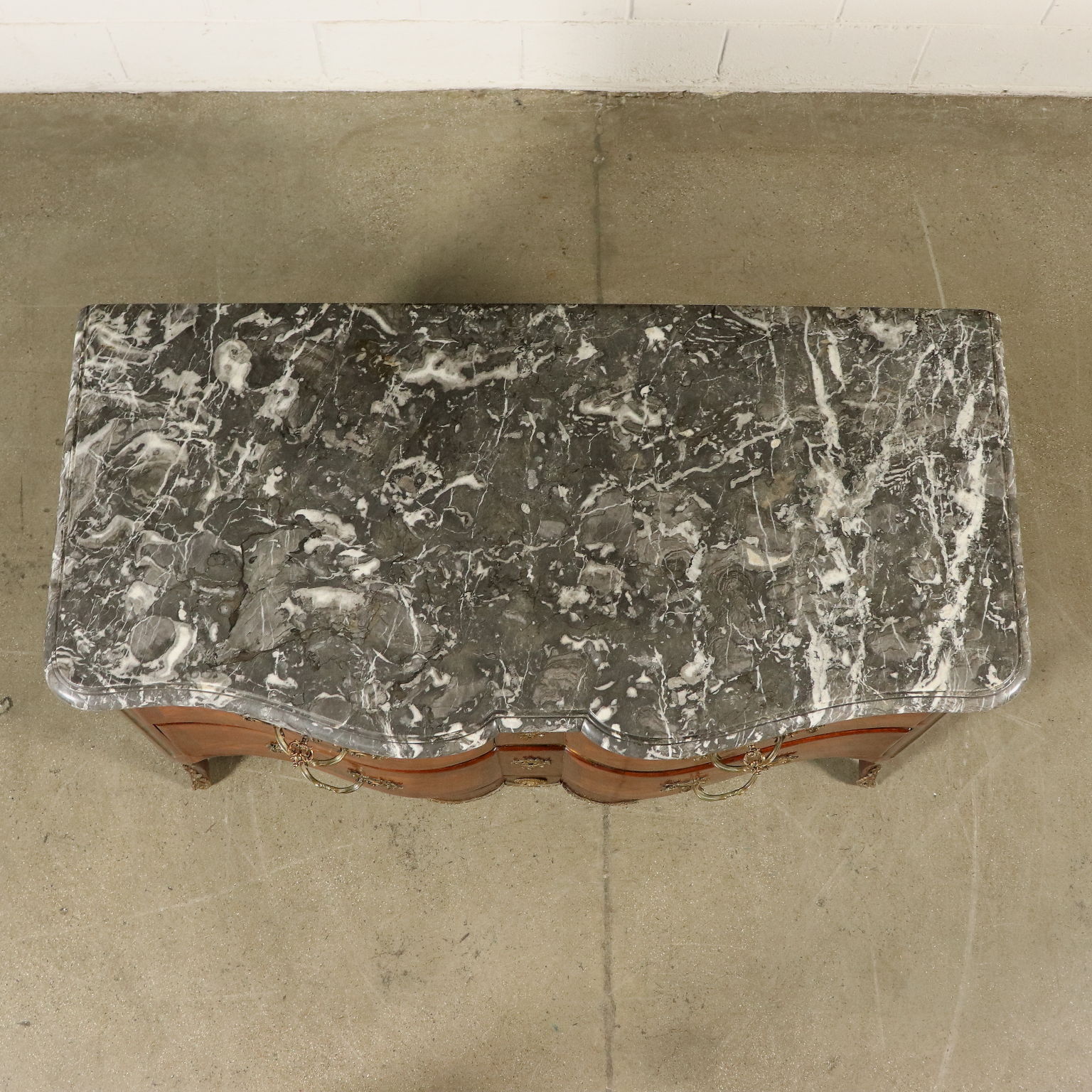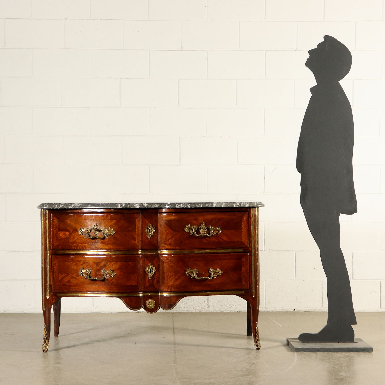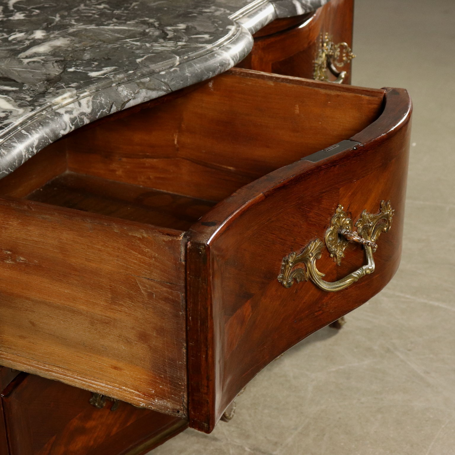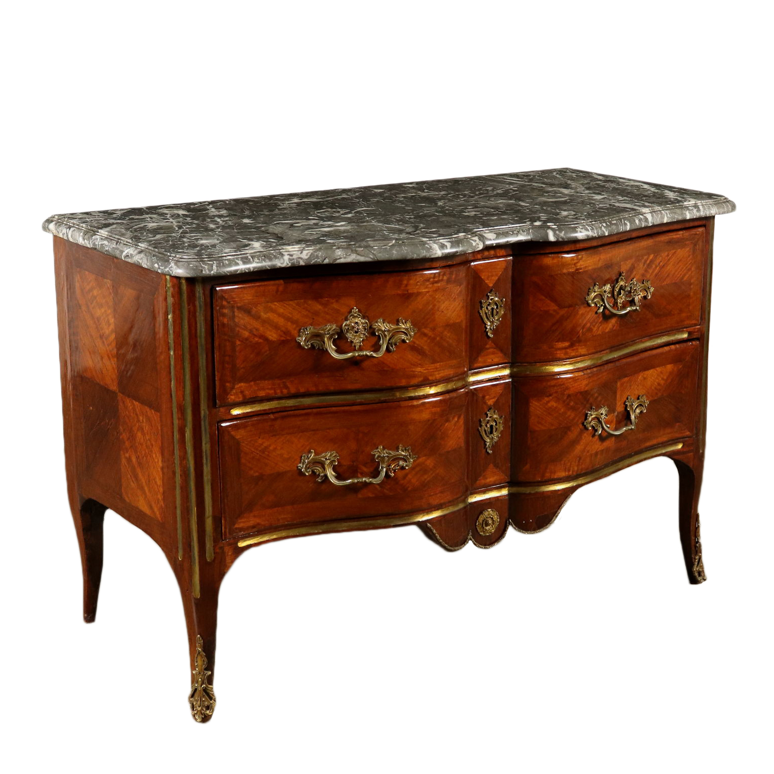 Elegante comò a tre cassetti di cui due allineati sottopiano. Presenta fronte a balestra com grembiale sagomato ed incisioni a "carta di Spagna". Piano in marmo sagomato e fregi in bronzo.
