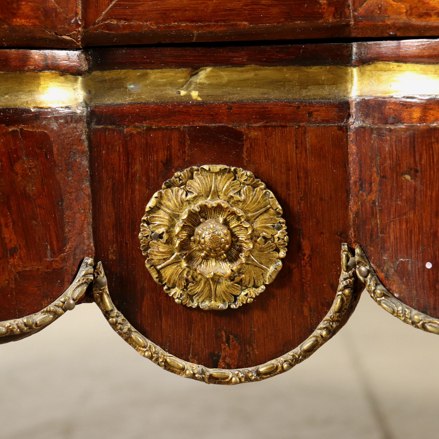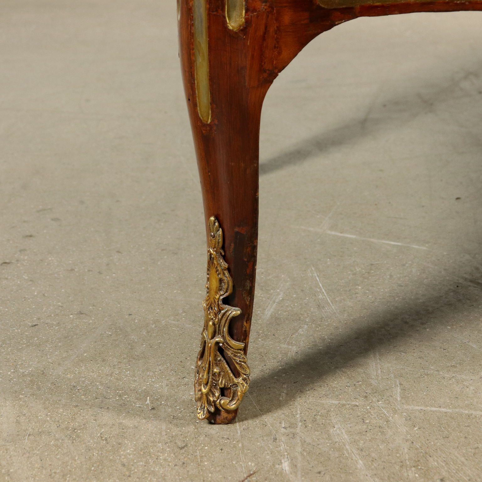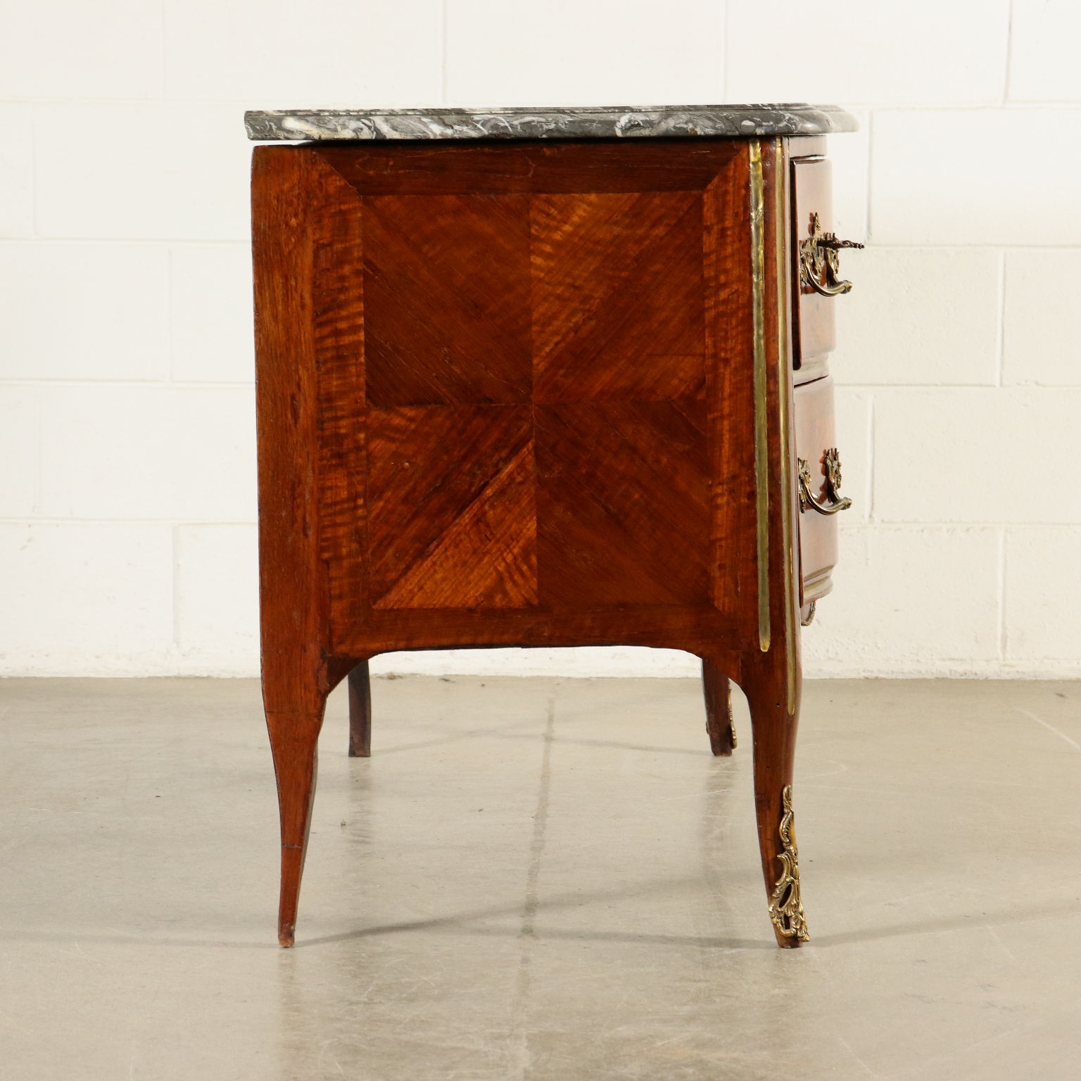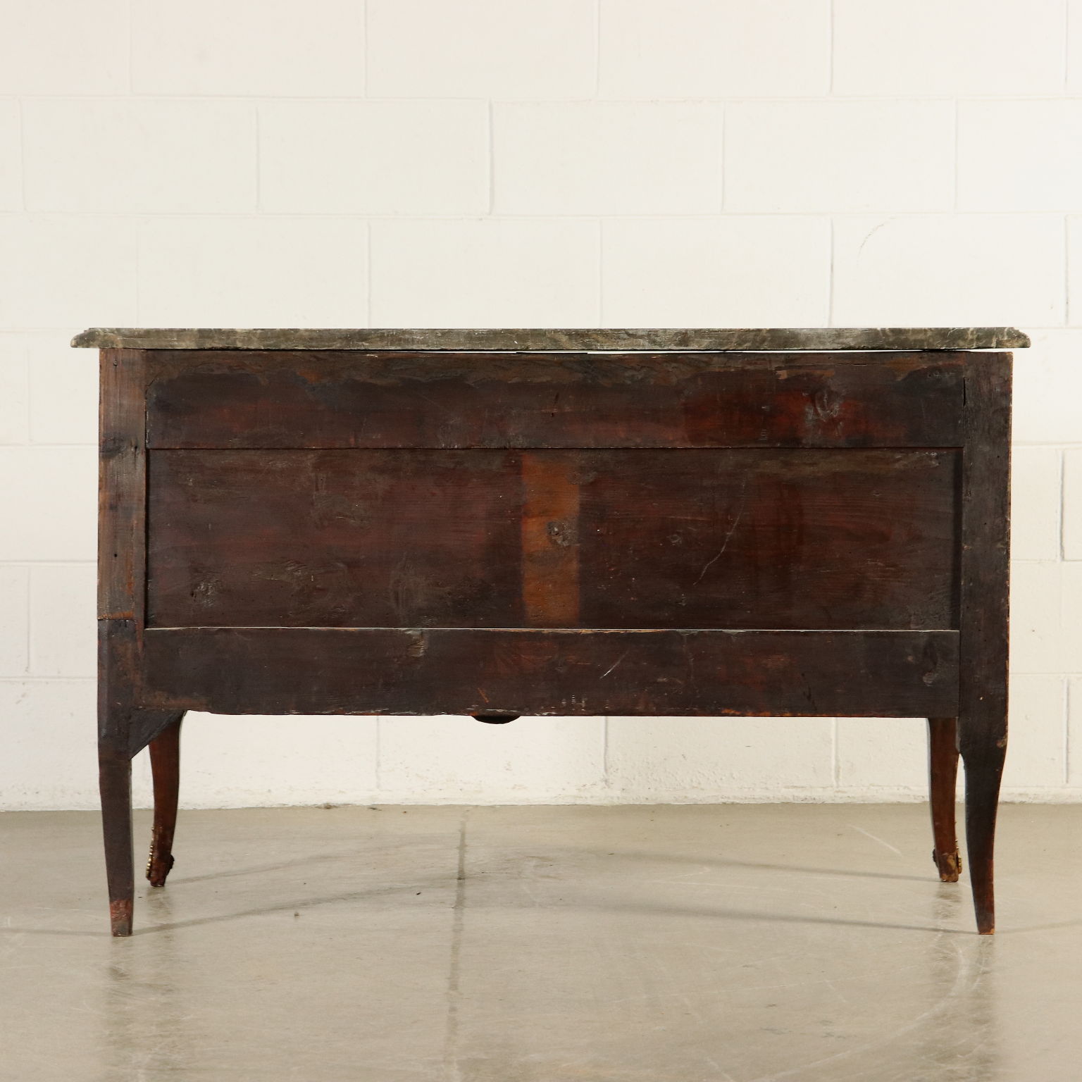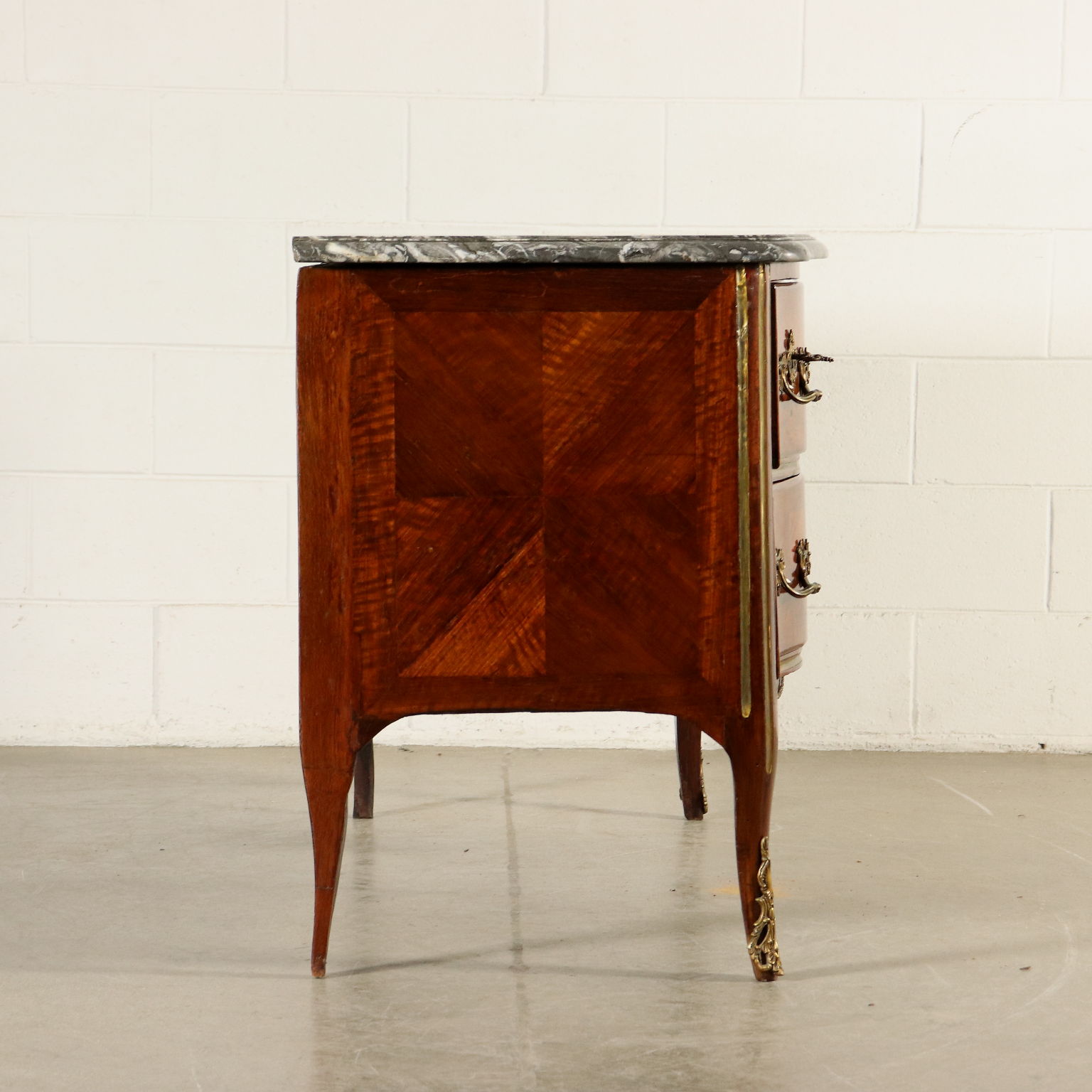 Elegante comò a tre cassetti di cui due allineati sottopiano. Presenta fronte a balestra com grembiale sagomato ed incisioni a "carta di Spagna". Piano in marmo sagomato e fregi in bronzo.