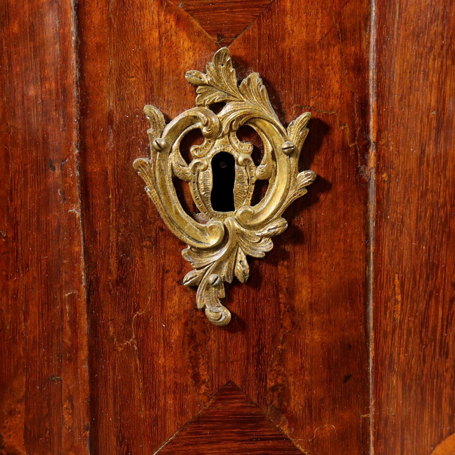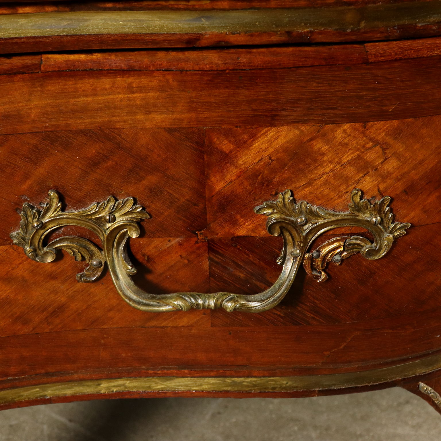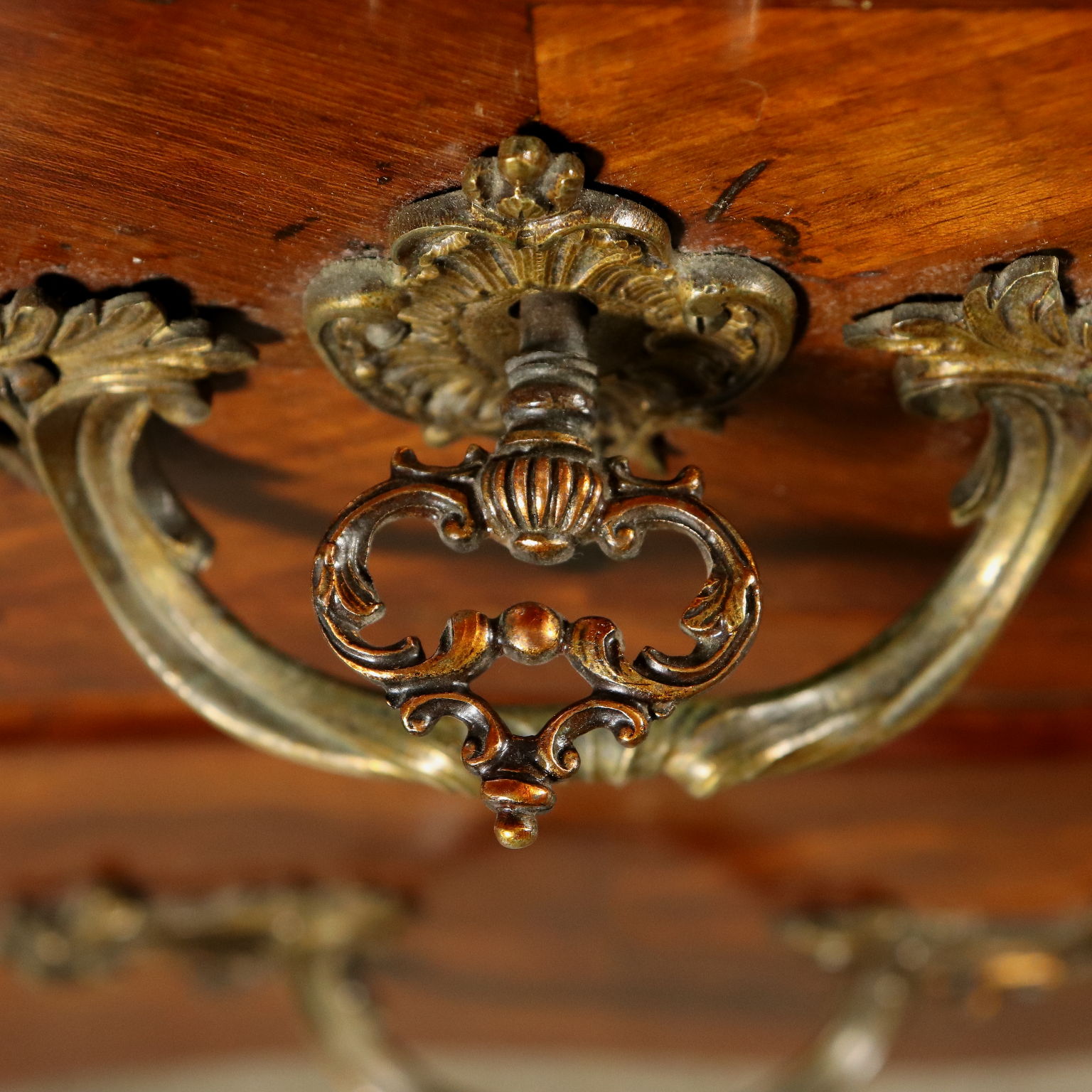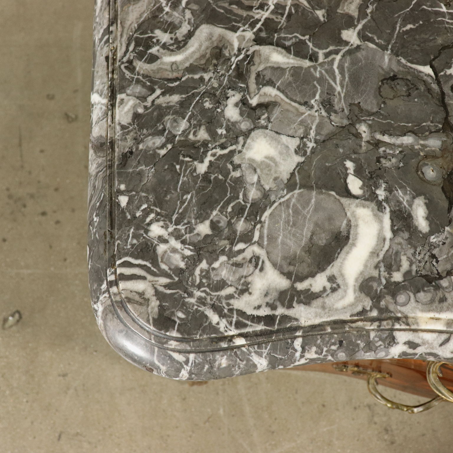 Elegante comò a tre cassetti di cui due allineati sottopiano. Presenta fronte a balestra com grembiale sagomato ed incisioni a "carta di Spagna". Piano in marmo sagomato e fregi in bronzo.