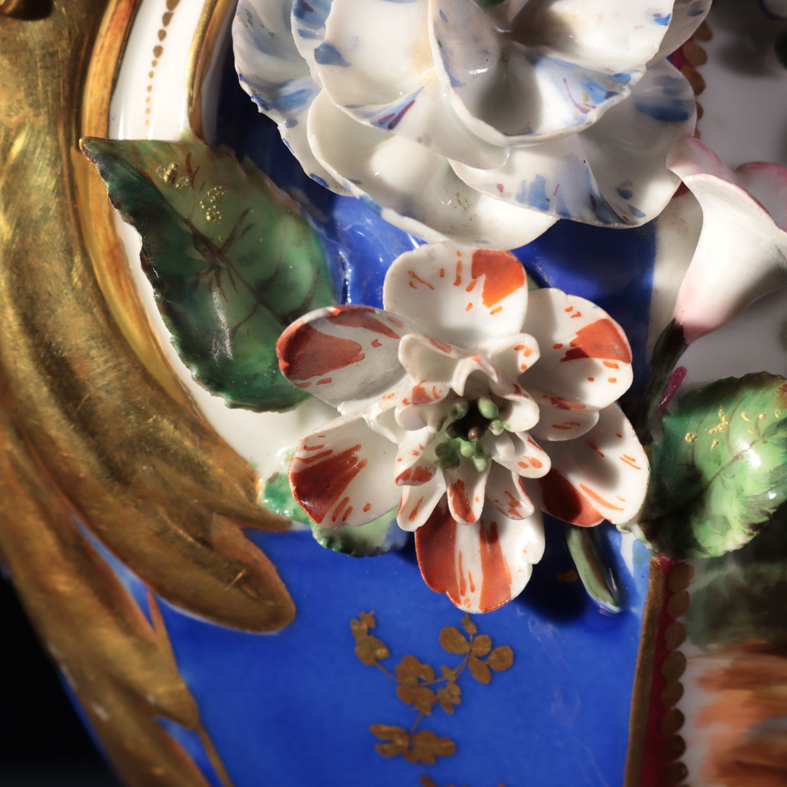 Coppia di vasi dalla forma di fiasca a collo stretto su base ottagonale; due draghi alati formano le anse dei vasi, sul fronte, racchiuse entro una corona di fiori, si trovano le due riserve dipinte con scene galanti di gusto orientale raffiguranti arabi in giardini di palme; il corpo del vaso vede l'alternarsi di fasce blu e rosse, con ricami dorati. La dimensione plastica è affidata ai fiori e ai draghi, i primi dipinti mentre i secondi sono dorati.