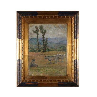 Olio su tela. Firmato in basso a sinistra. Sul retro è presente etichetta cartacea della galleria d'arte di Milano, un numero di inventario e il titolo scritto a mano. Panerai è stato pittore, docente e illustratore italiano, originario di Firenze, ove studiò all'Accademia di Belle Arti avendo come maestro Giovanni Fattori che lo introdusse alla pittura naturalistica di paesaggi della Maremma toscana. Fu attratto anche dalla tematica militare, con scene di vita militare e marinara, e si distinse come pittore animalista, dotato di acuta sensibilità. Il suo stile rimanda ad un impressionismo bozzettistico, facile, fresco, vivace. Il soggetto proposto ben si inserisce nella sua produzione di paesaggi maremmani, e lascia qualche perplessità il titolo attribuito per la localizzazione nella località svizzera. Il dipinto è presentato in bella cornice coeva.