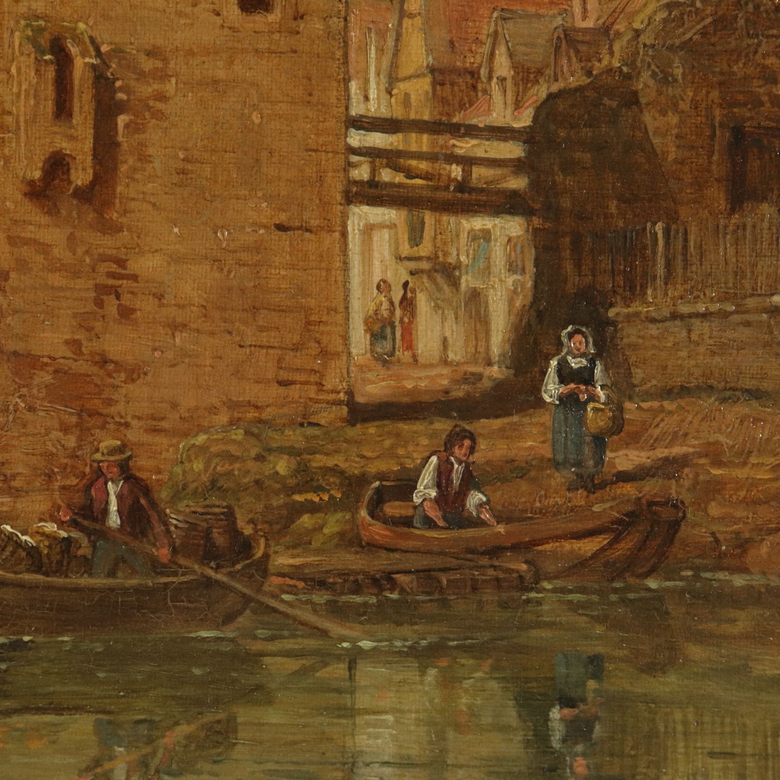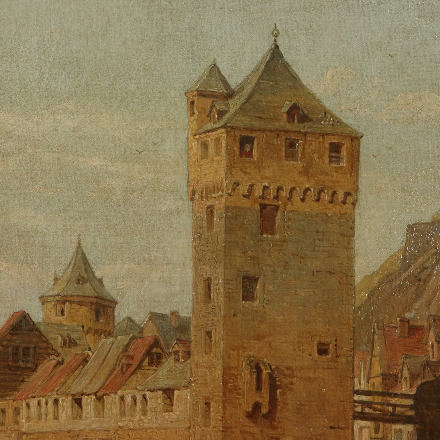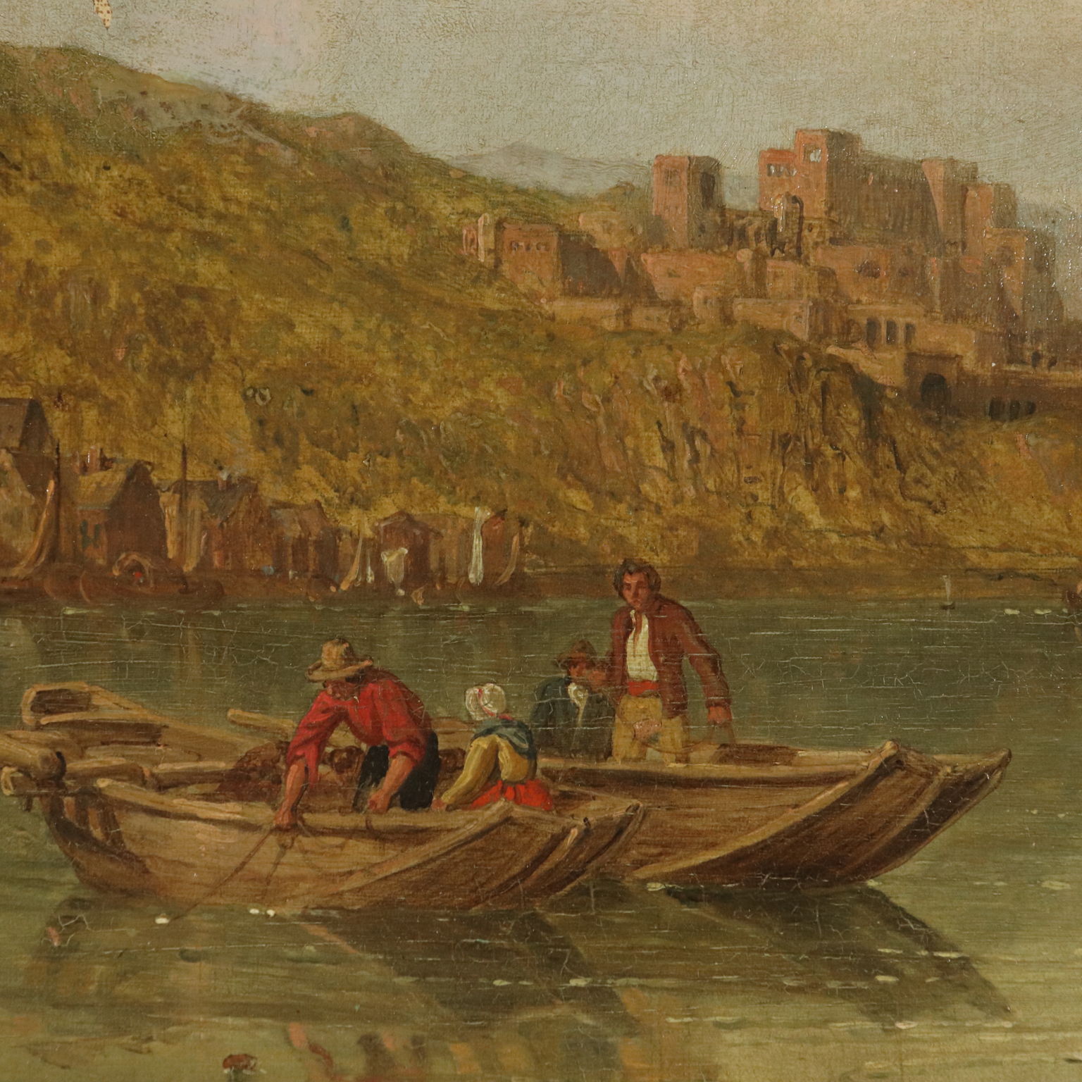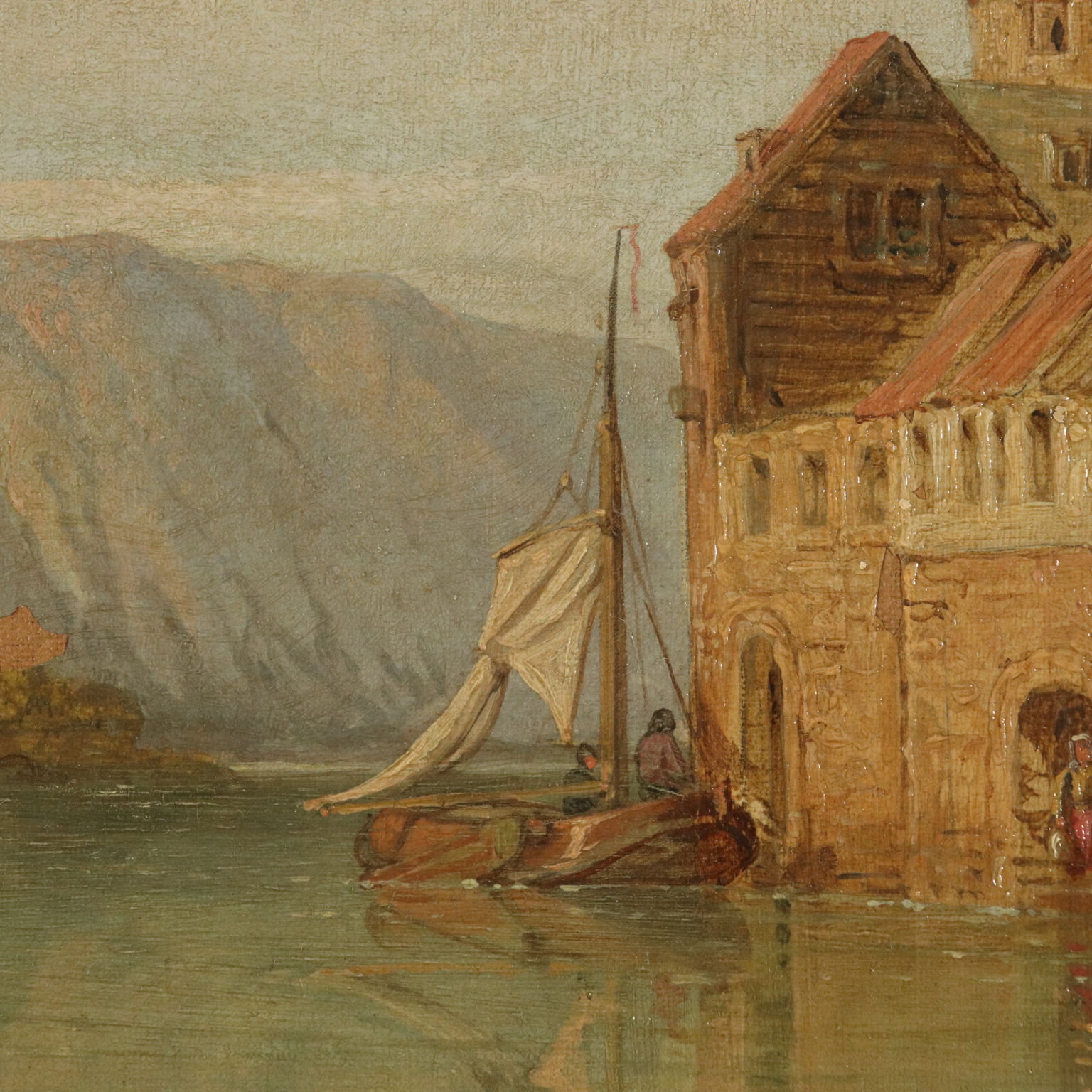 Olio su tela. Firmato in basso a destra. Il pittore inglese George Clarkson Stanfield, specializzato come il padre in paesaggi e marine, si distinse in particolare per le sue vedute topografiche di diversi luoghi dell'Europa da lui visitati: i laghi italiani, la Svizzera, la valle della Mosella e la valle del Reno; appartiene a questa regione la veduta proposta, che ritrae la cittadina tedesca sulle rive del Reno nella Renania-Palatinato. Il dipinto, in discrete condizioni (qualche caduta di colore), è presentato in cornice coeva.