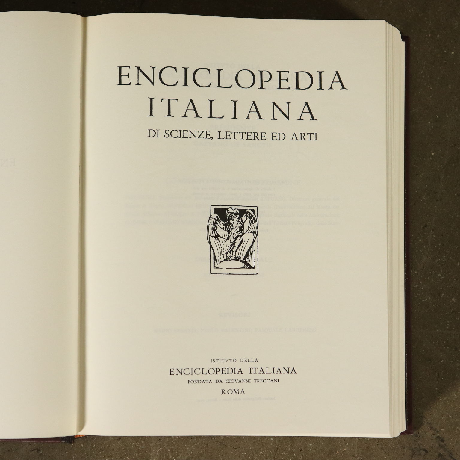 Enciclopedia Italiana, Istituto dell'Enciclopedia Italiana - Treccani, Roma 1949. Quarantun volumi così suddivisi: 35 volumi enciclopedia, 1 volume indici, appendice I, appendice II, appendice III.