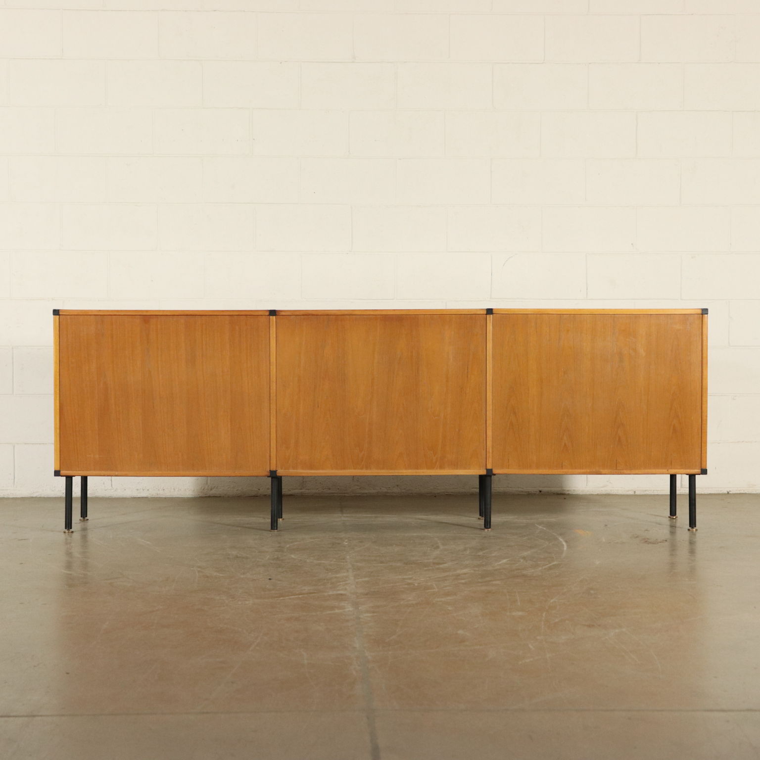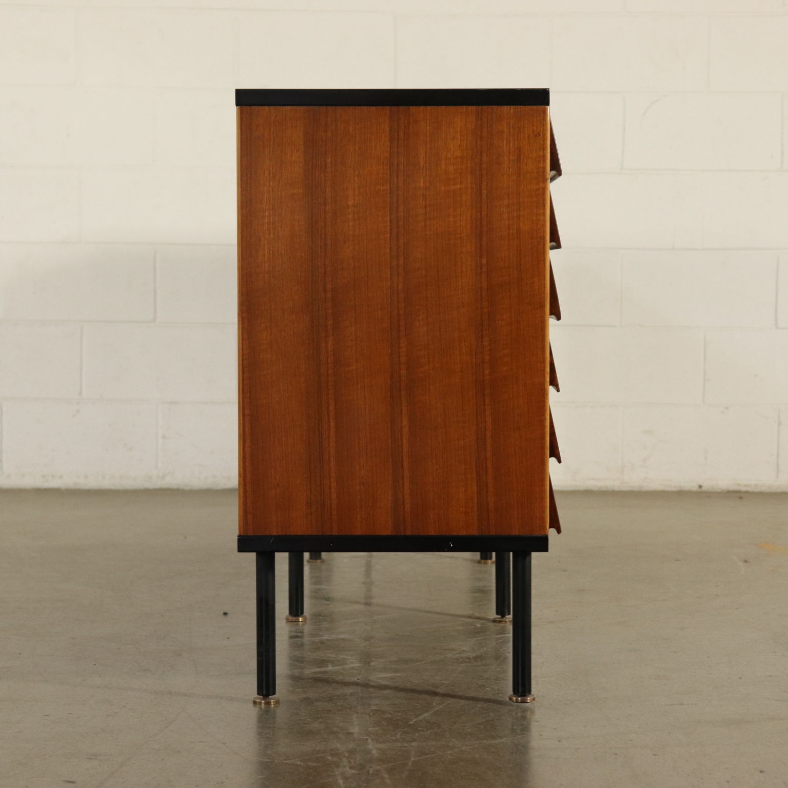 Sideboard in legno impiallacciato Teak, frontali dei cassetti in massello di rovere, profili e gambe in metallo.