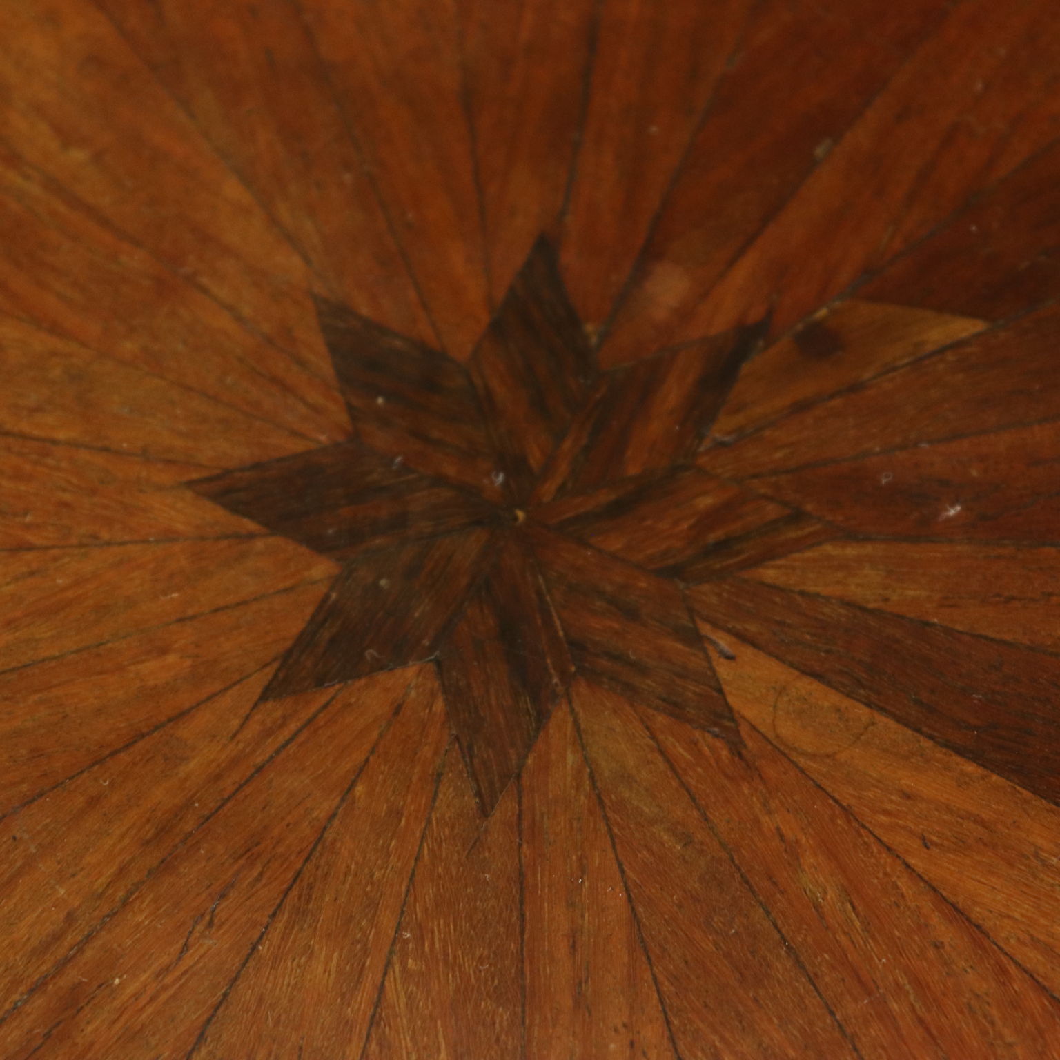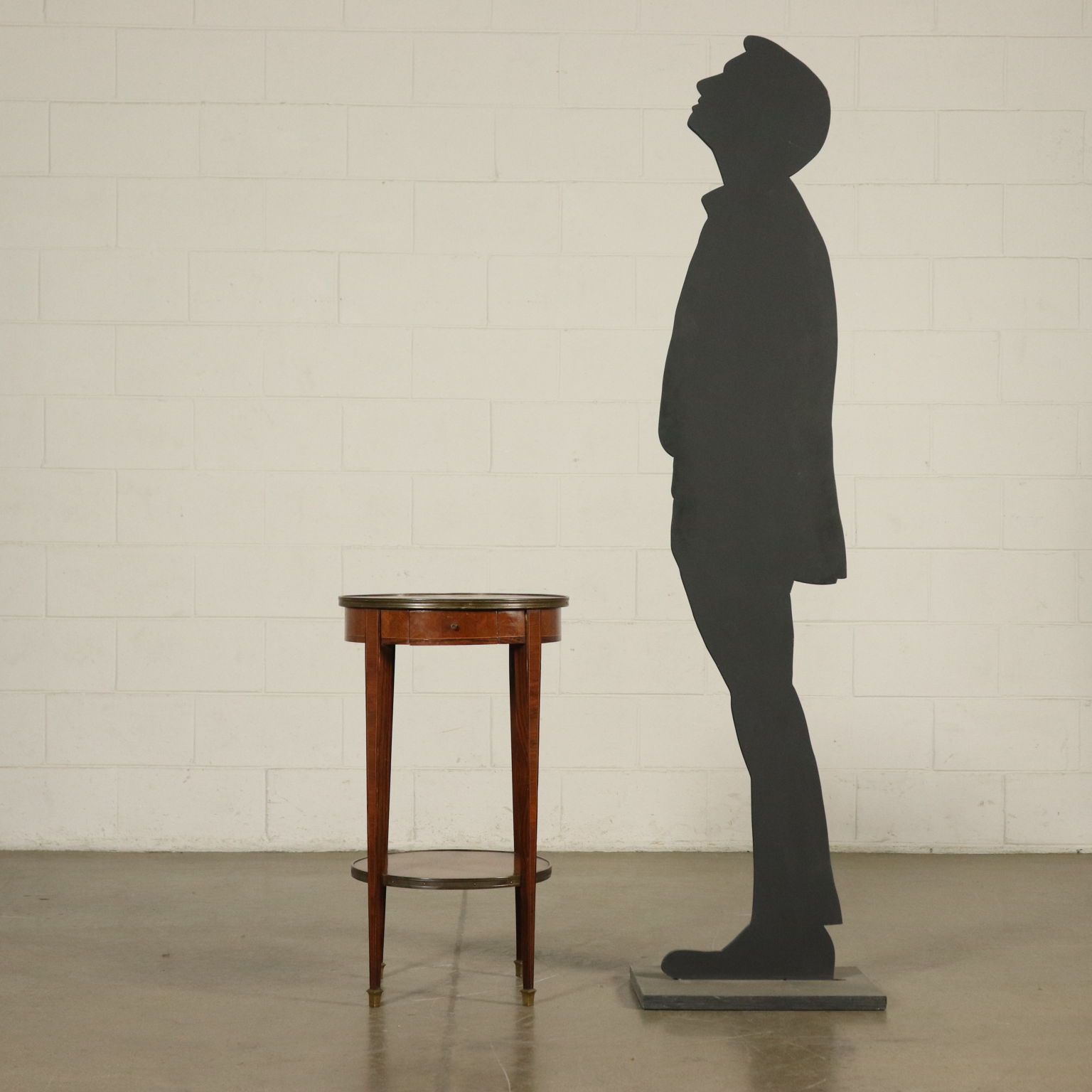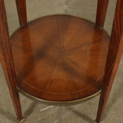 Tavolino retto da gambe troncopiramidali raccordate da ripiano. Piano tondo. Un cassetto nella fascia. Cornici e piedini in ottone.