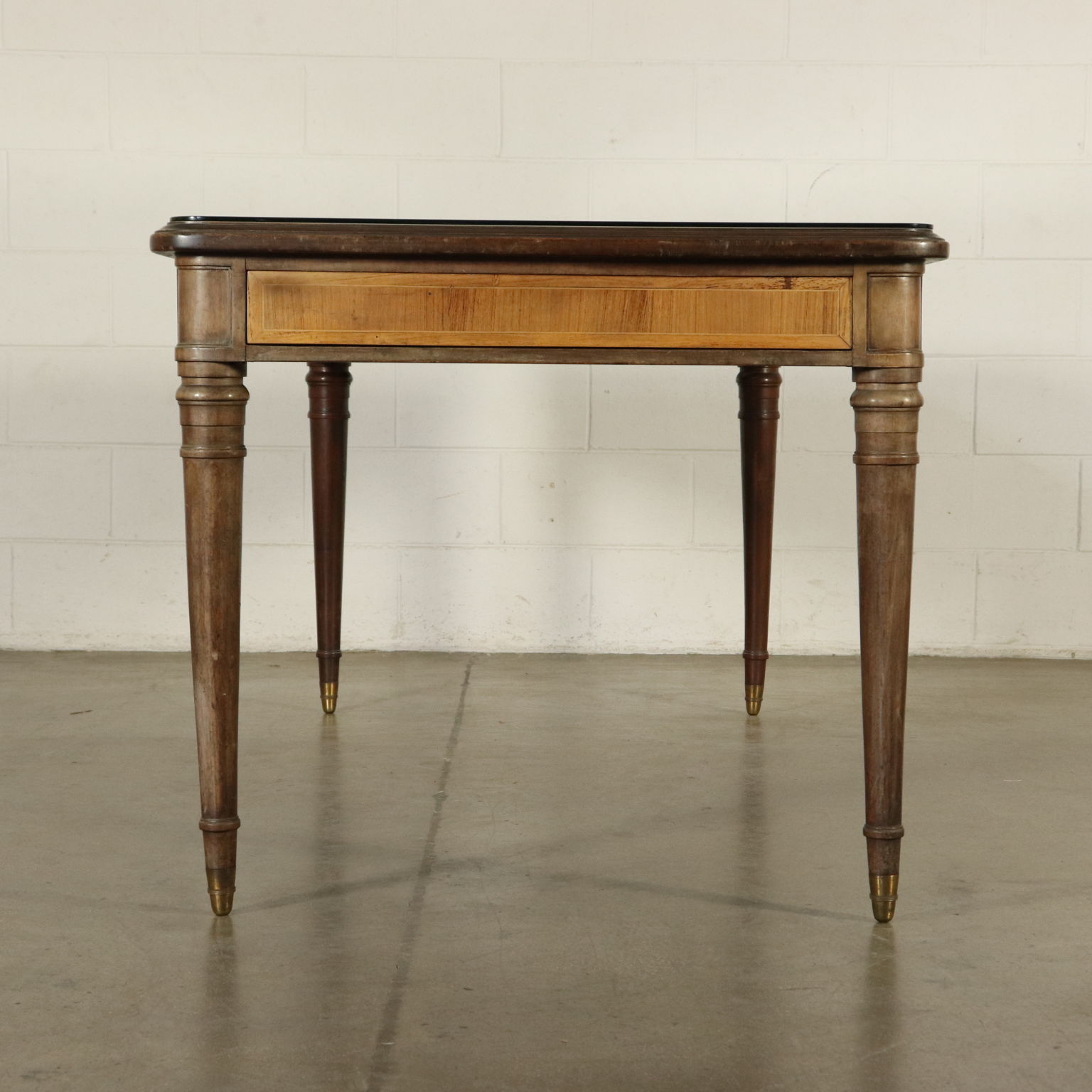 Tavolo; legno impiallacciato palissandro, faggio tinto con puntali in ottone, piano in vetro in appoggio al piano.