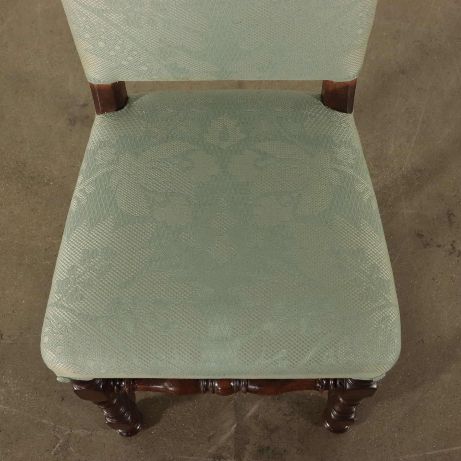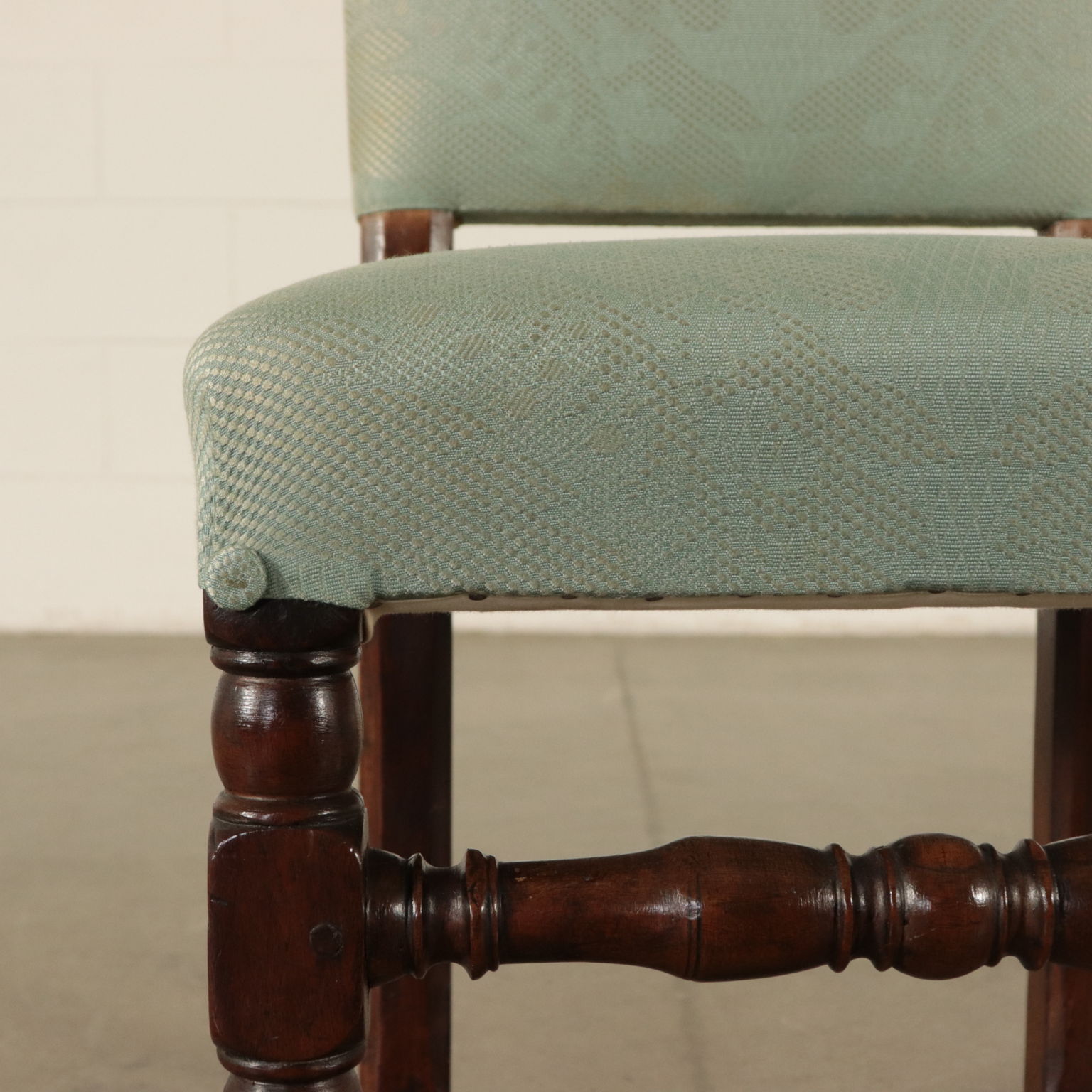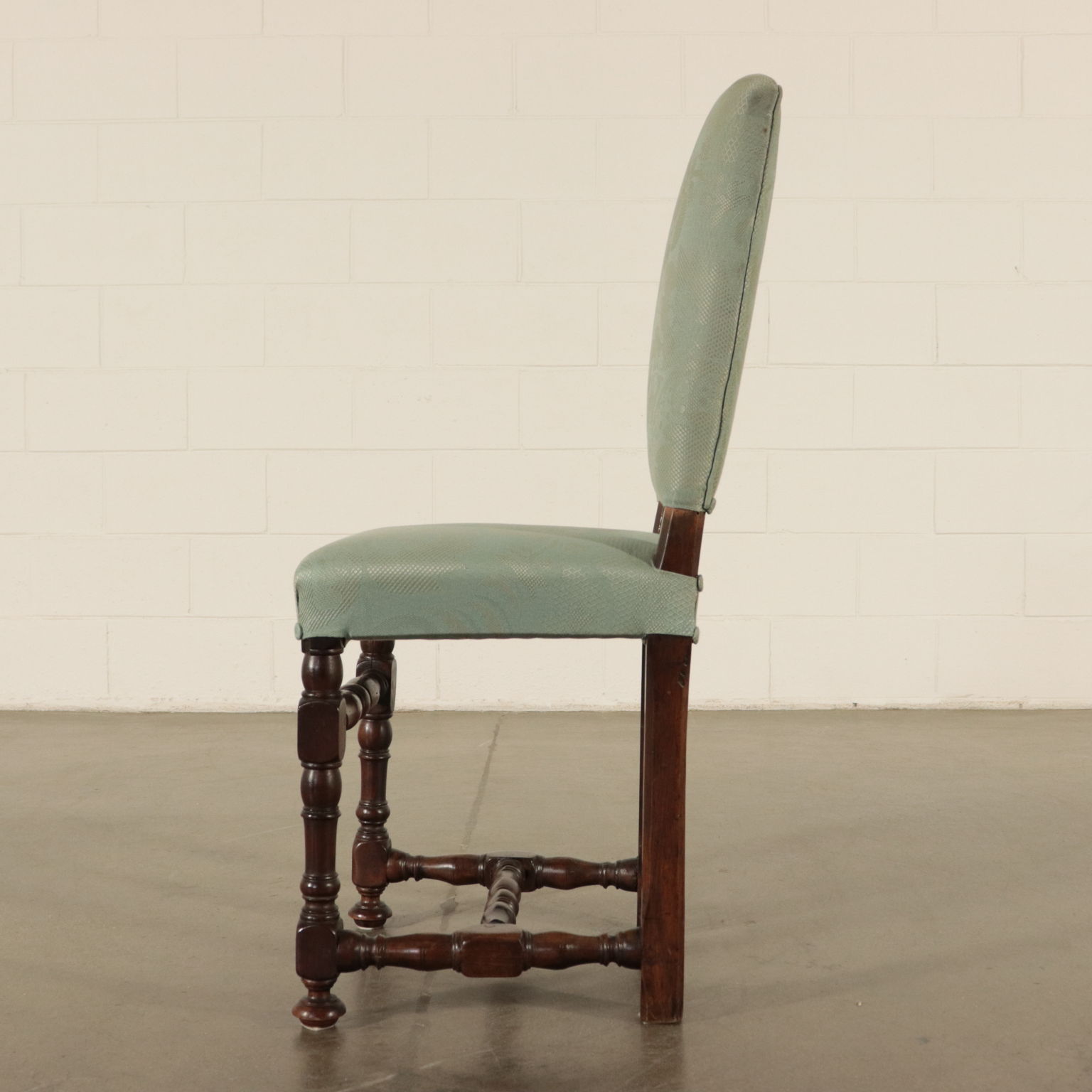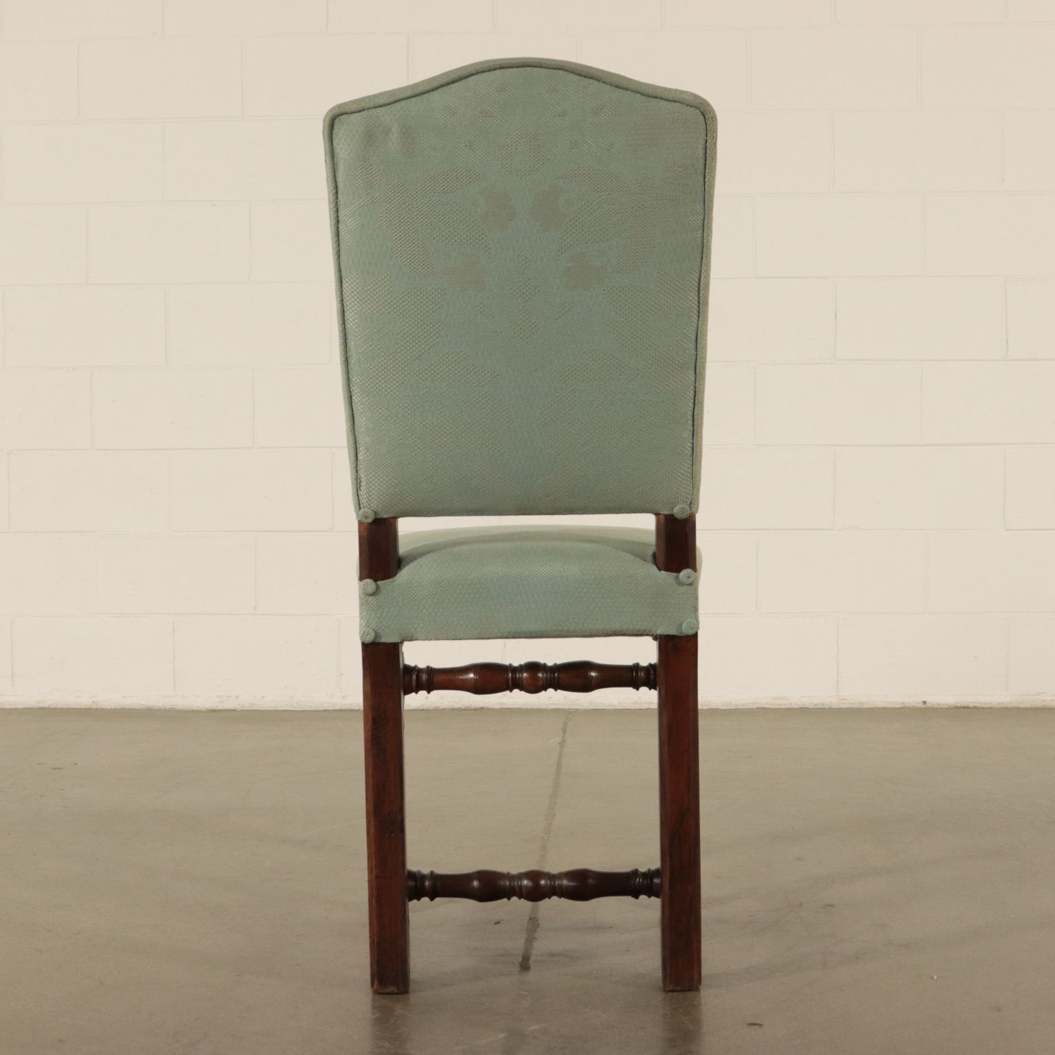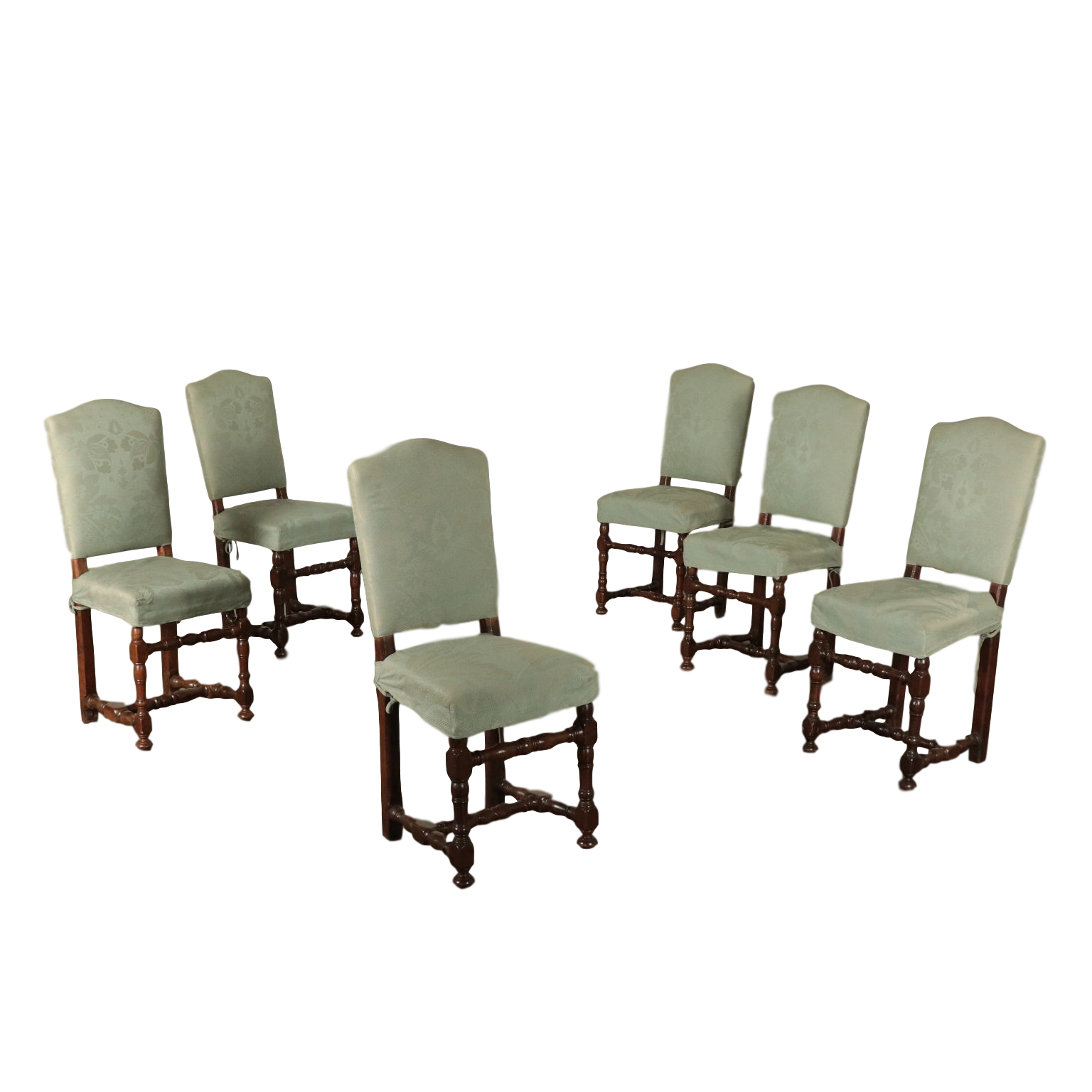 Gruppo di sei sedie a rocchetto. Gambe tornite raccordate da crociera. Seduta e schienale imbottiti.