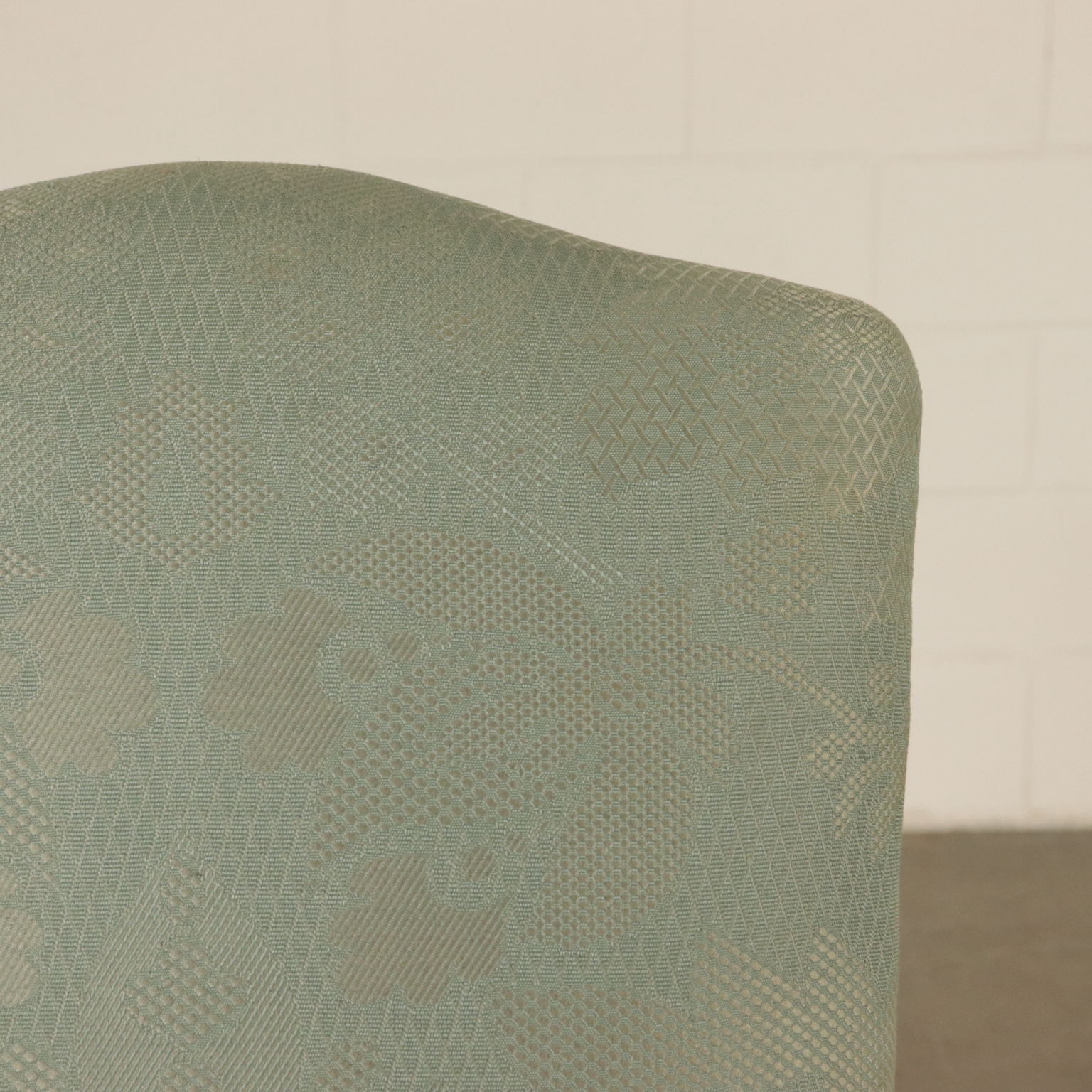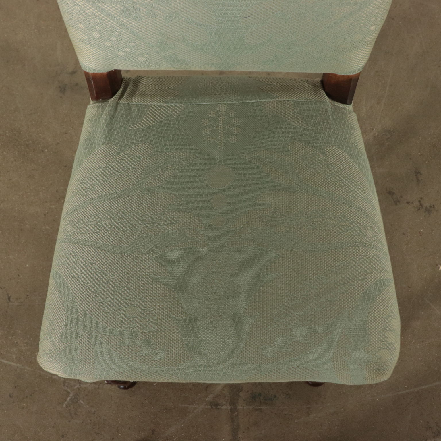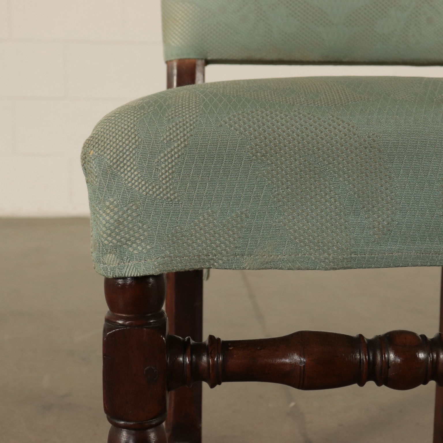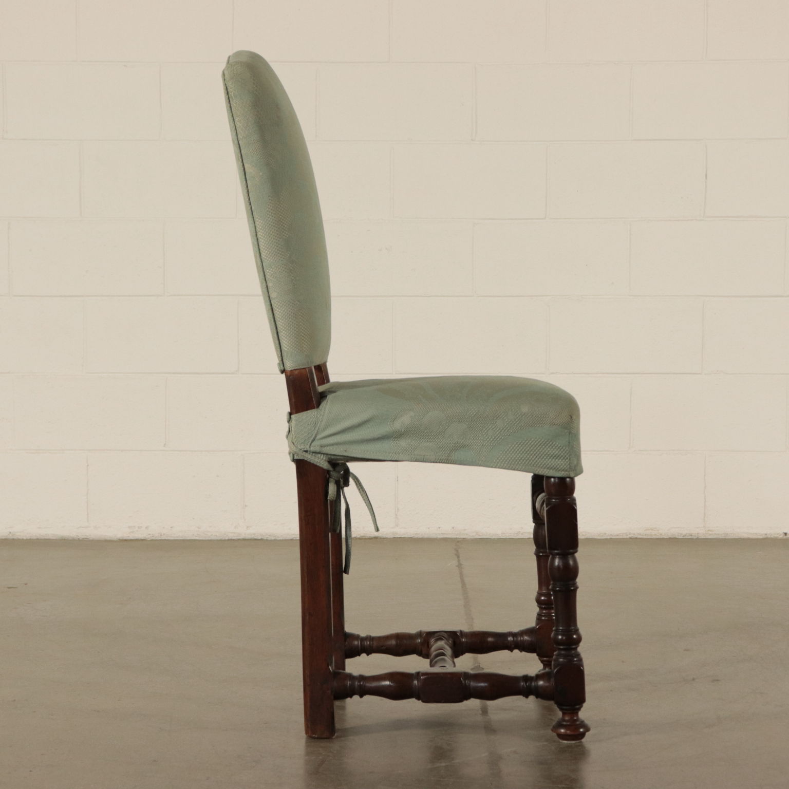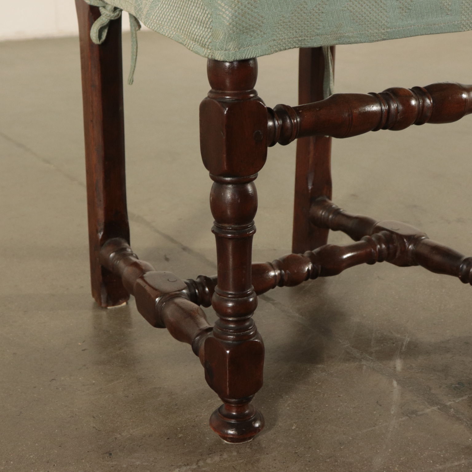 Gruppo di sei sedie a rocchetto. Gambe tornite raccordate da crociera. Seduta e schienale imbottiti.