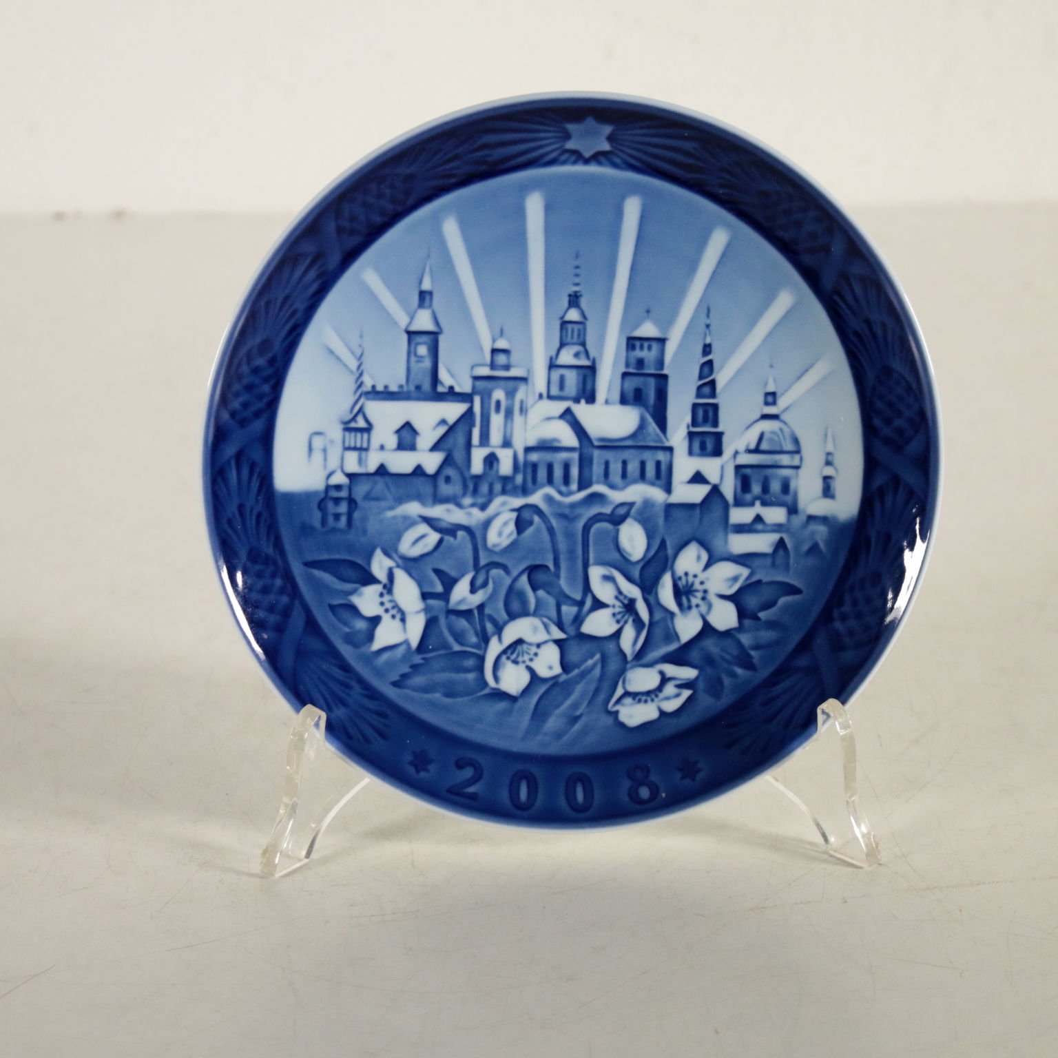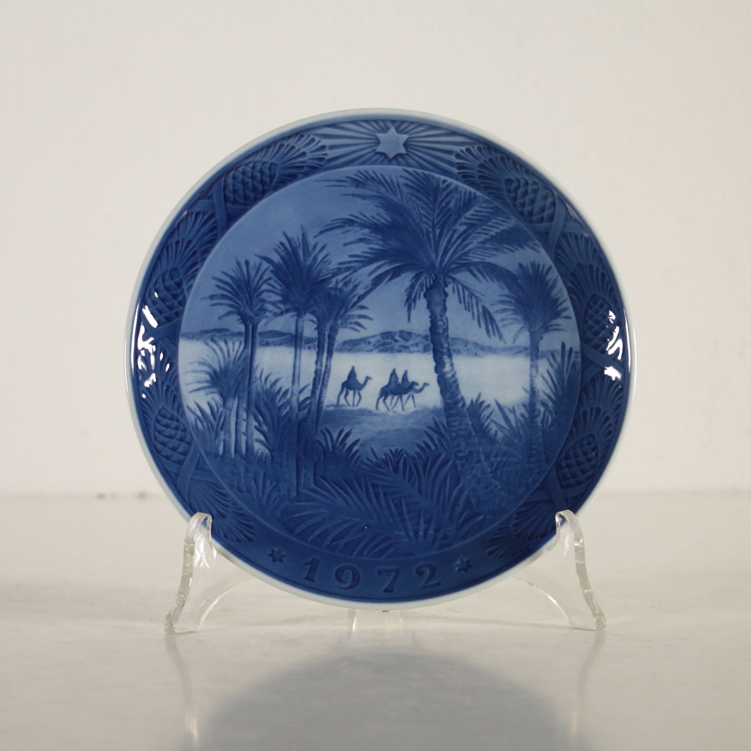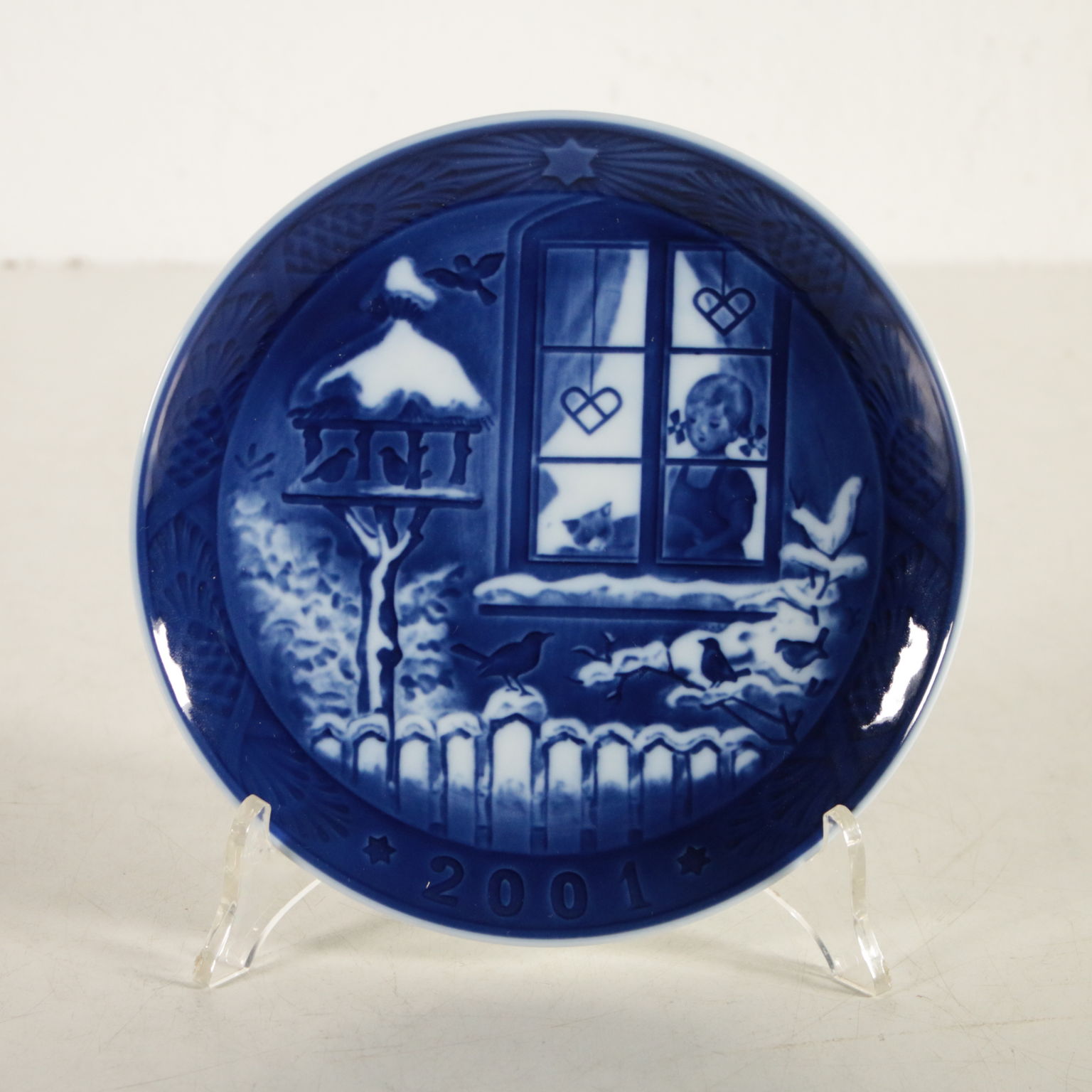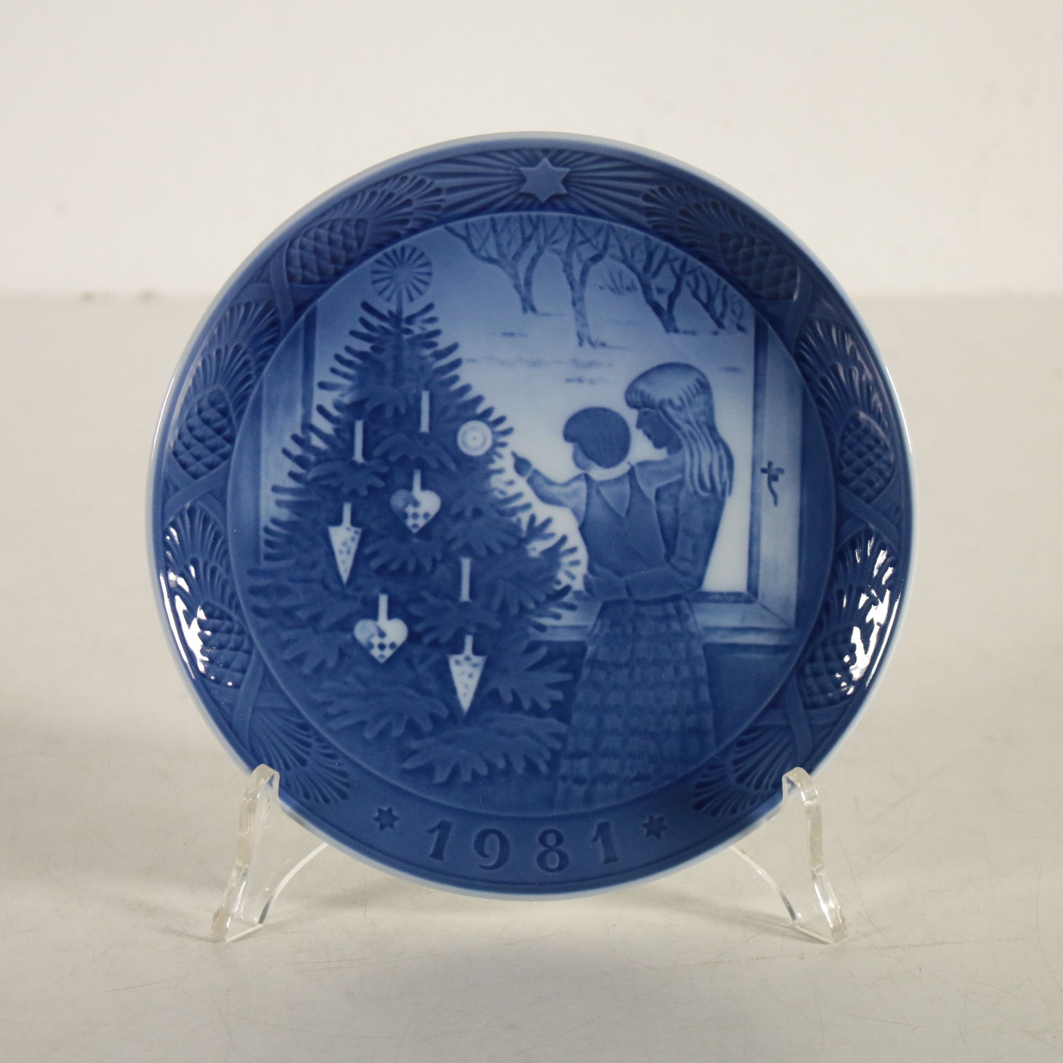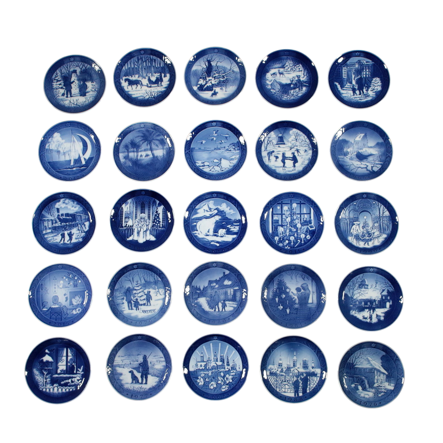 Venticinque piatti in porcellana bianca con decori nelle varie tonalità di blu. I piatti sono di diverse annate e i decori presentano scene diverse. Marchio della manifattura sotto la base.