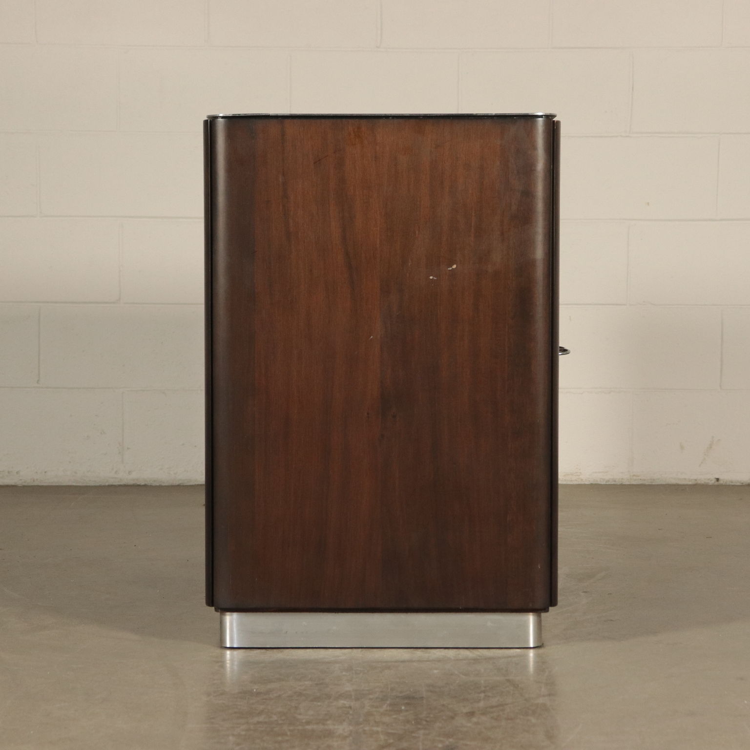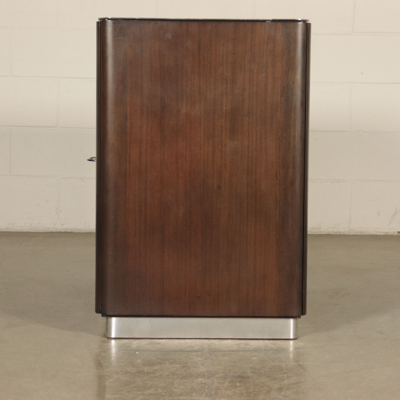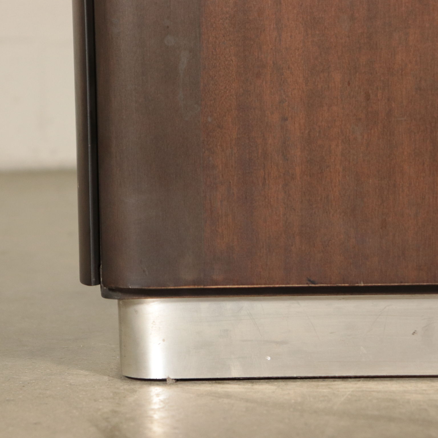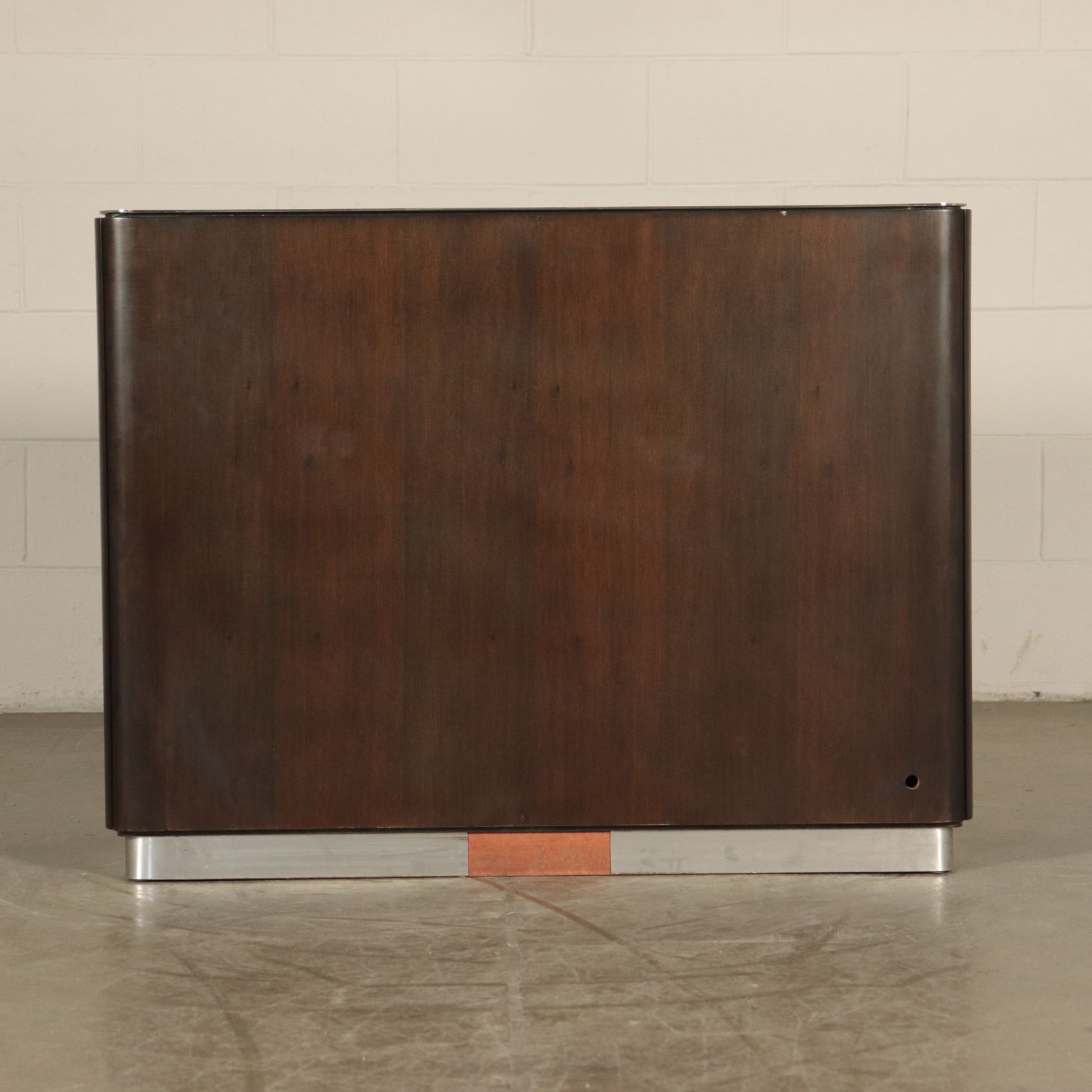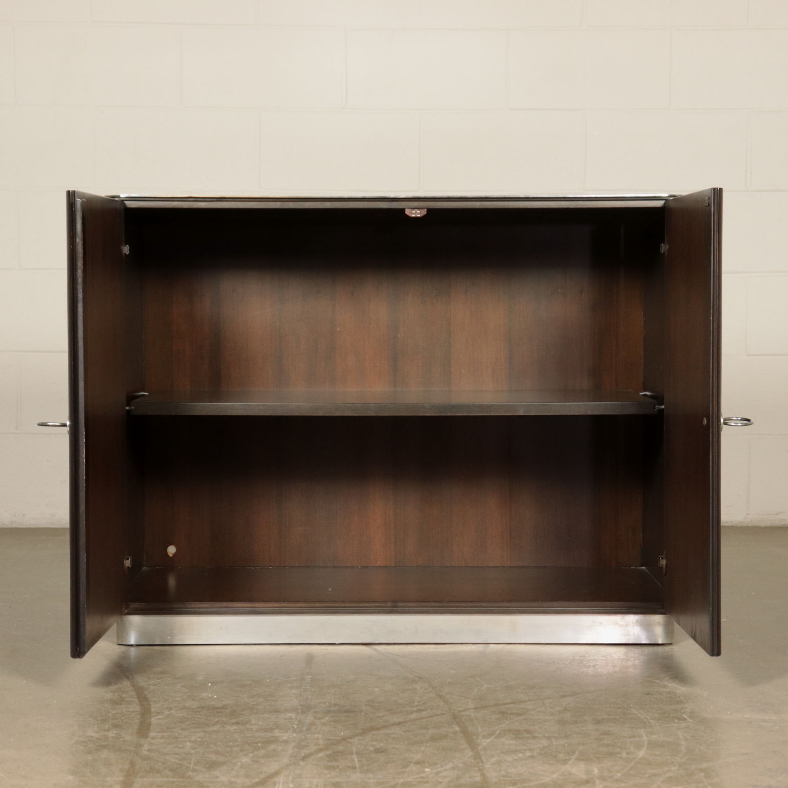 Mobile da centro in legno impiallacciato palissandro, fasce in metallo cromato.