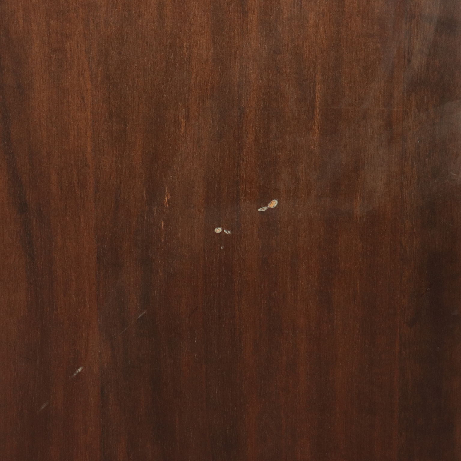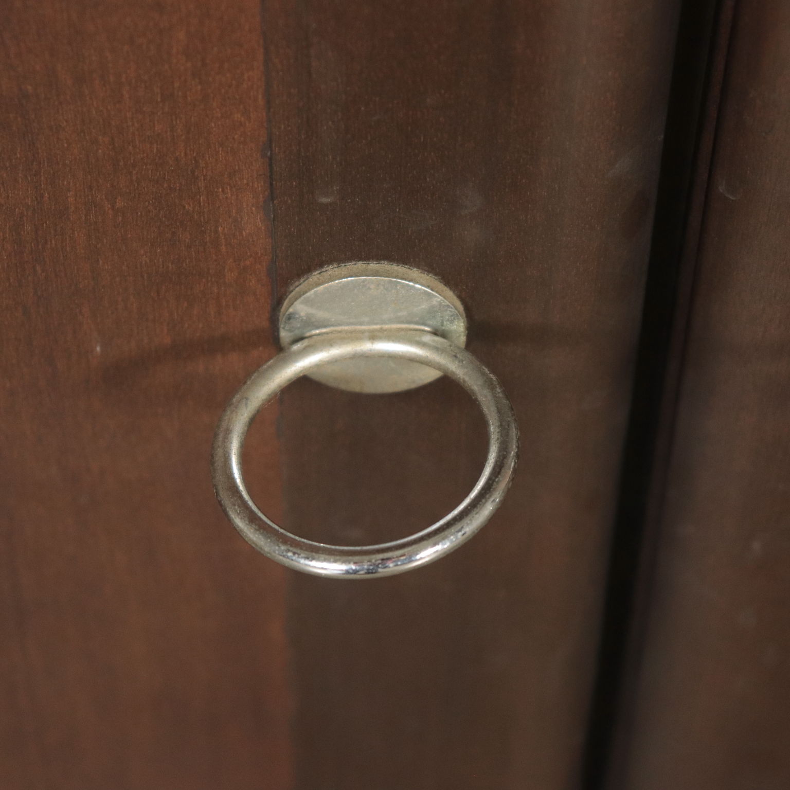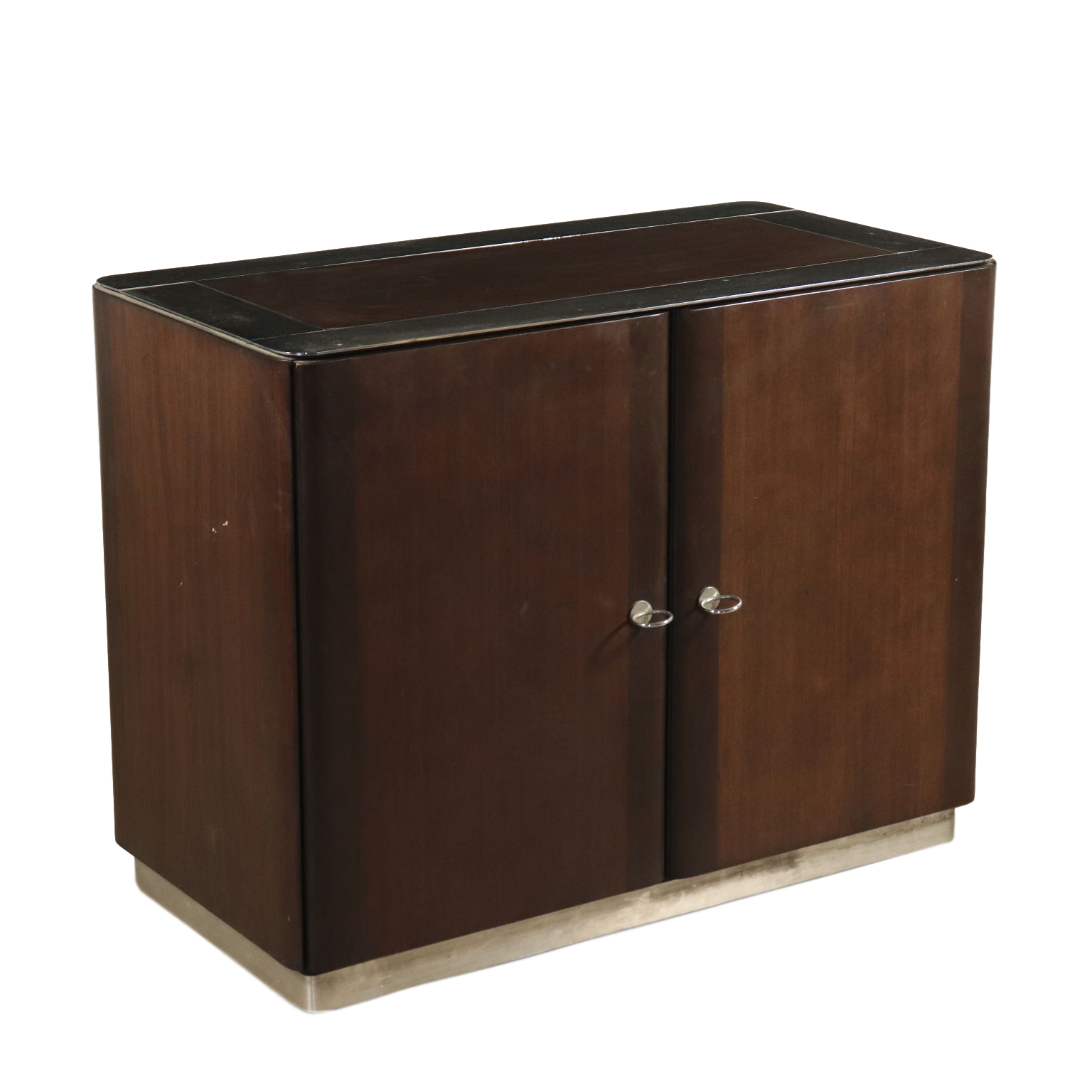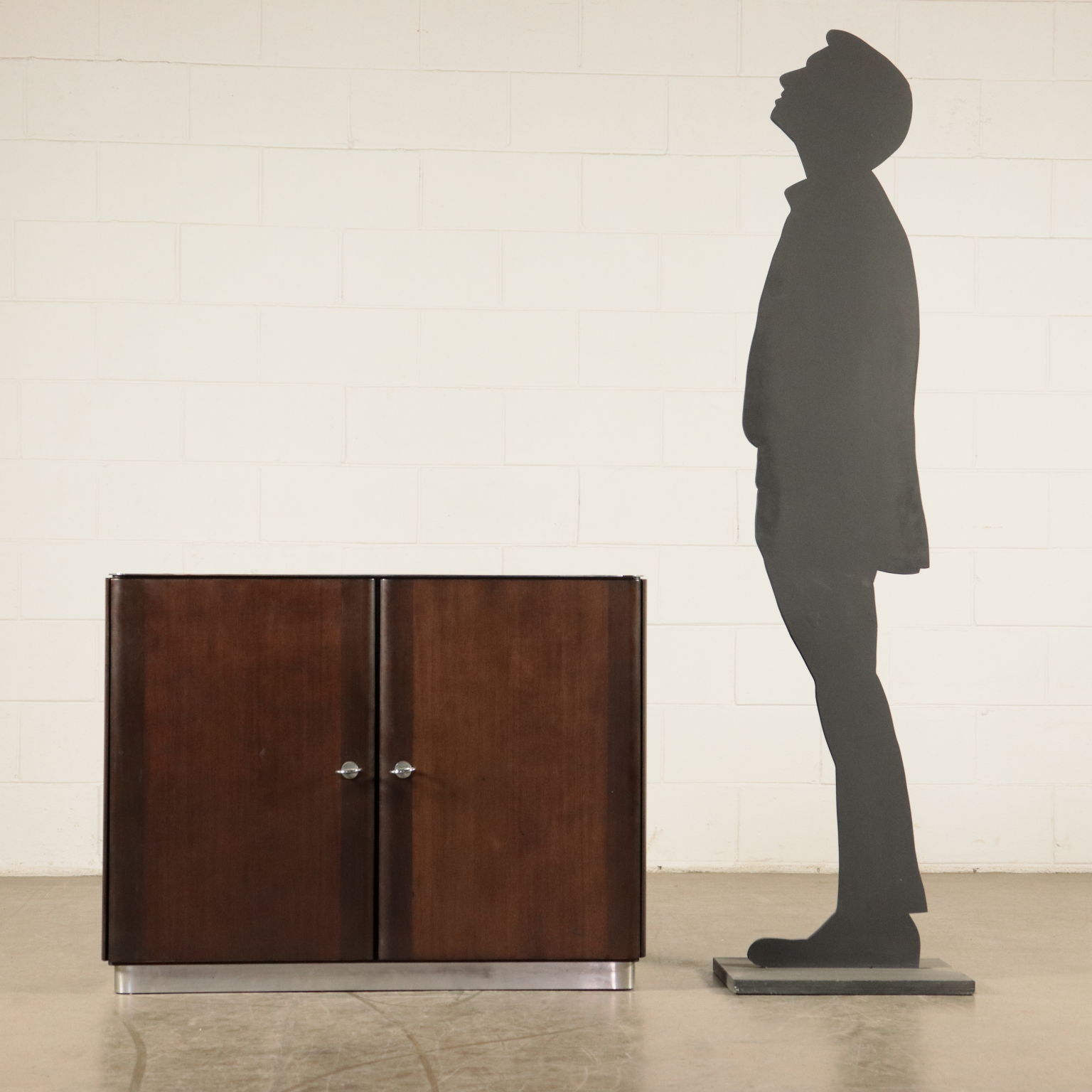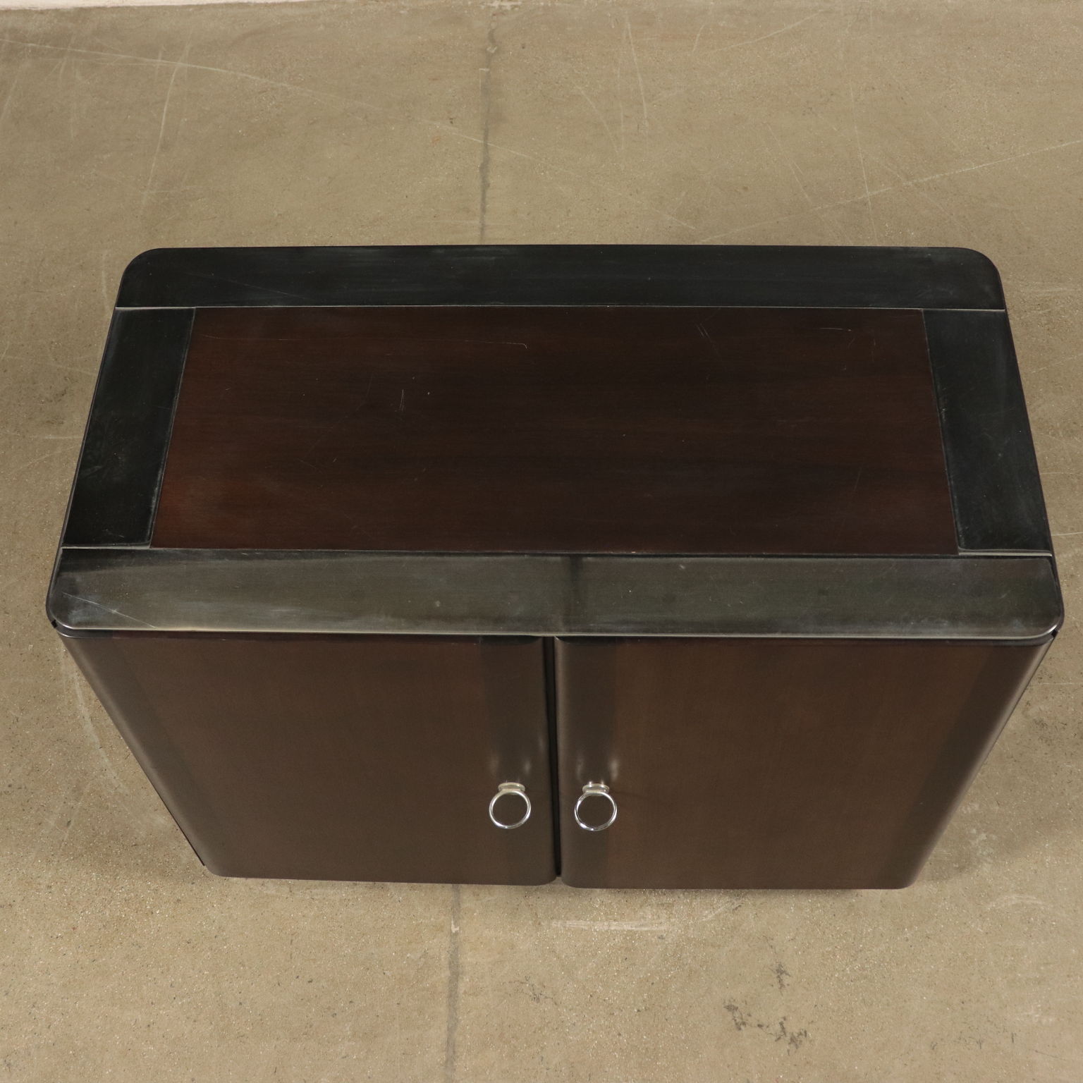 Mobile da centro in legno impiallacciato palissandro, fasce in metallo cromato.
