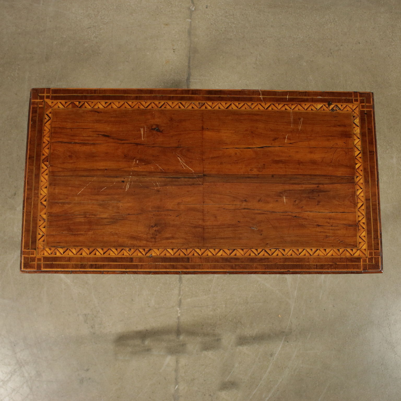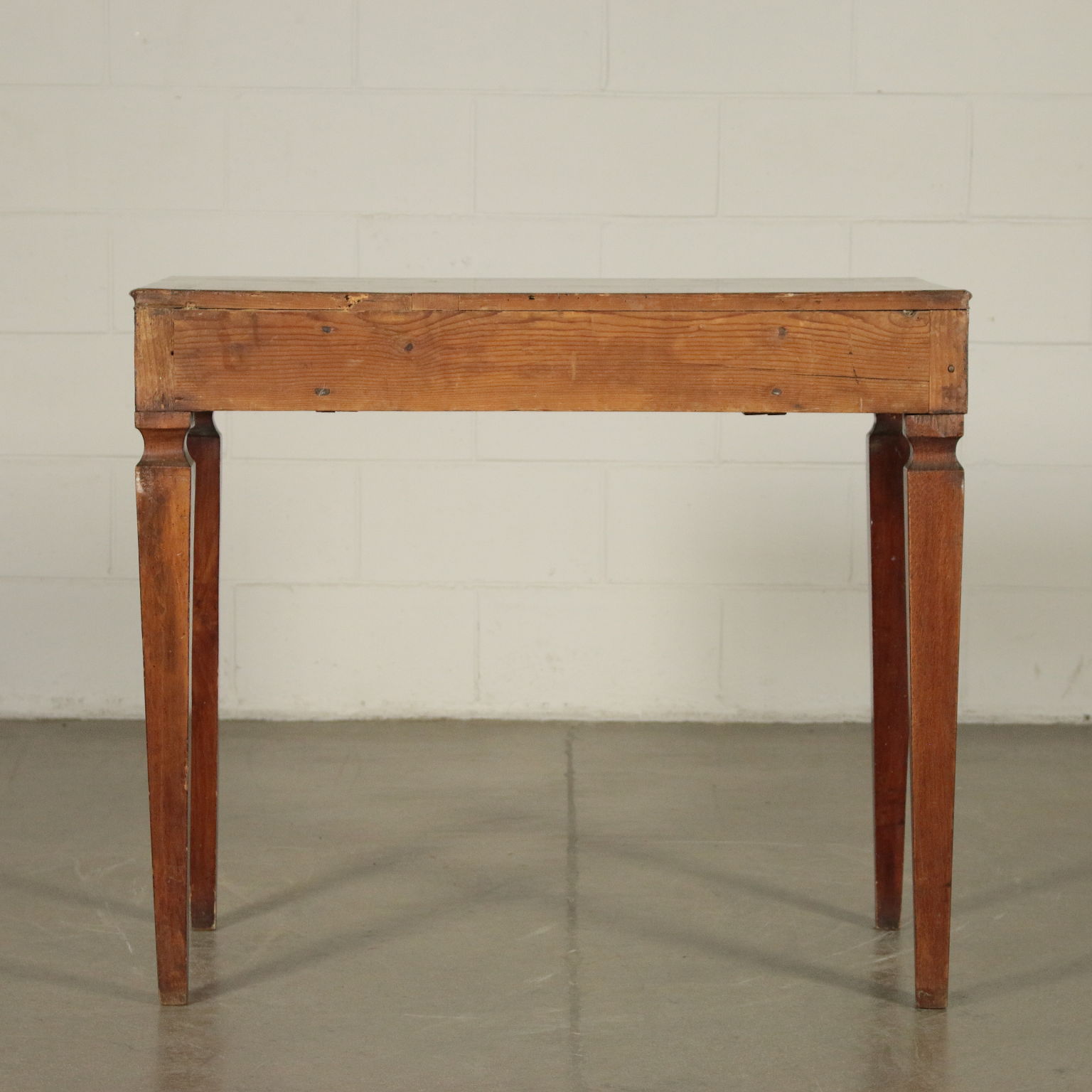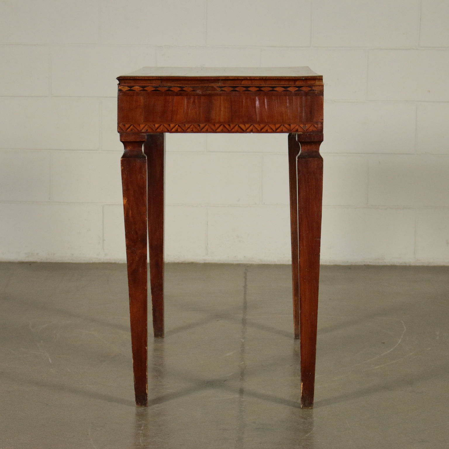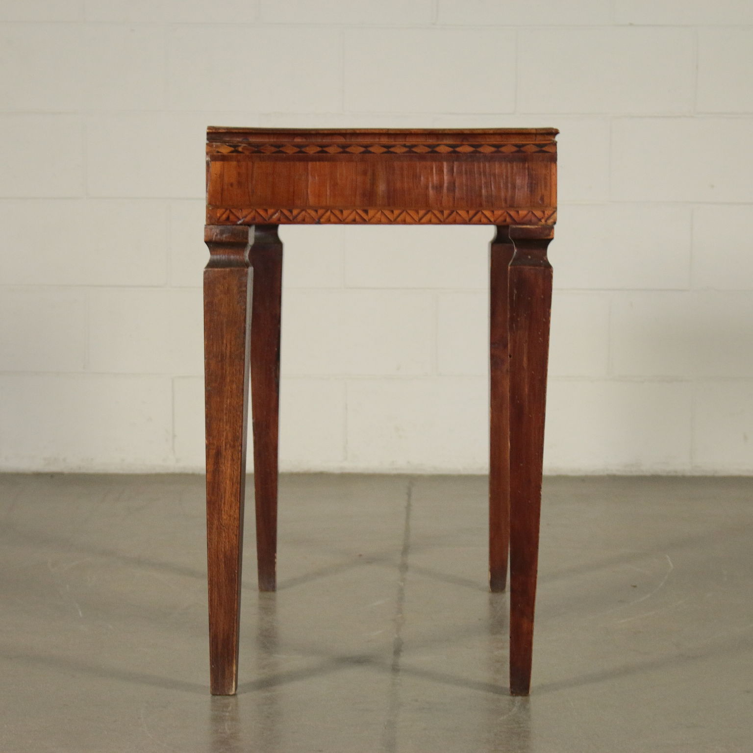 Tavolo parietale retto da gambe troncopiramidali di cui una in rovere sostituita. Un cassetto nella fascia. Presenta filettatura intarsiata con motivi geometrici. Cornice piano in legno di testa.