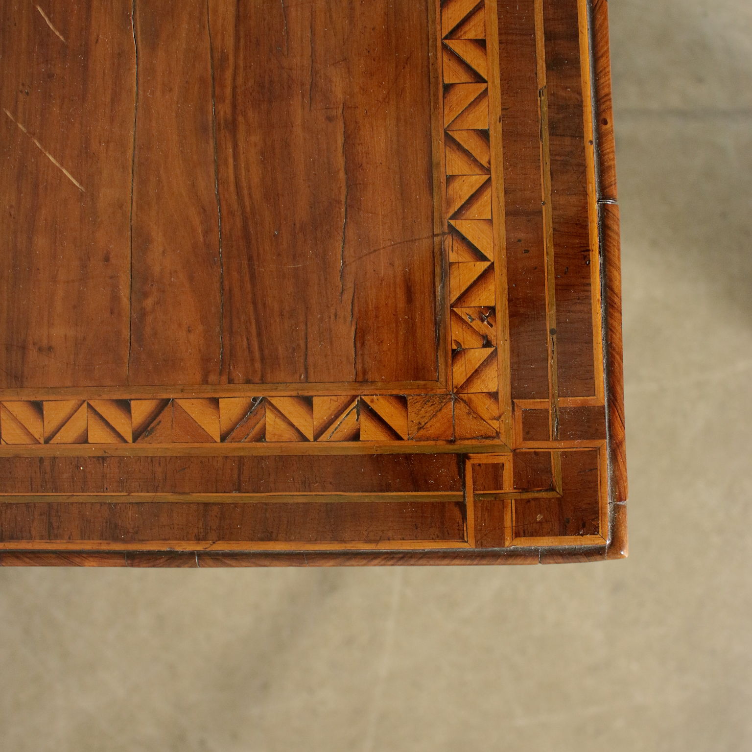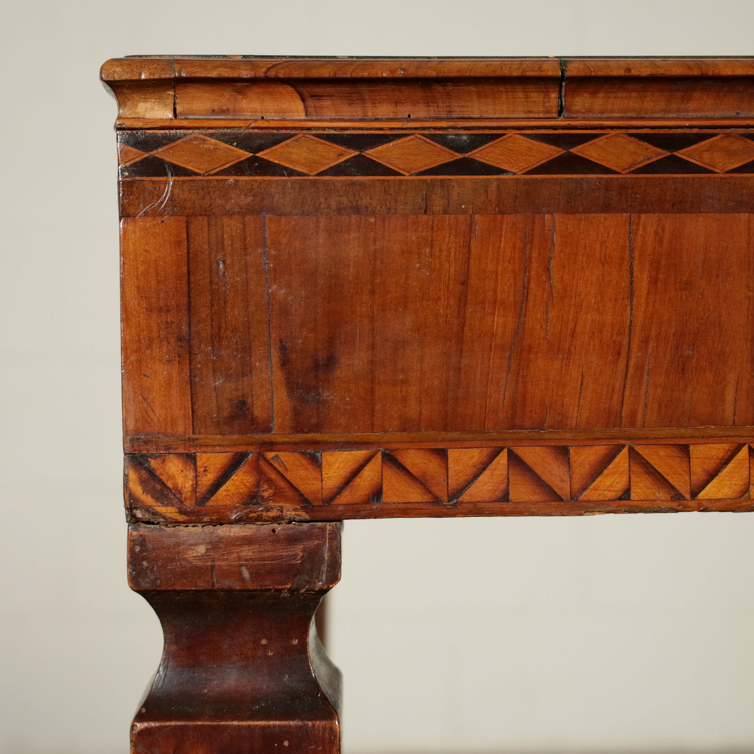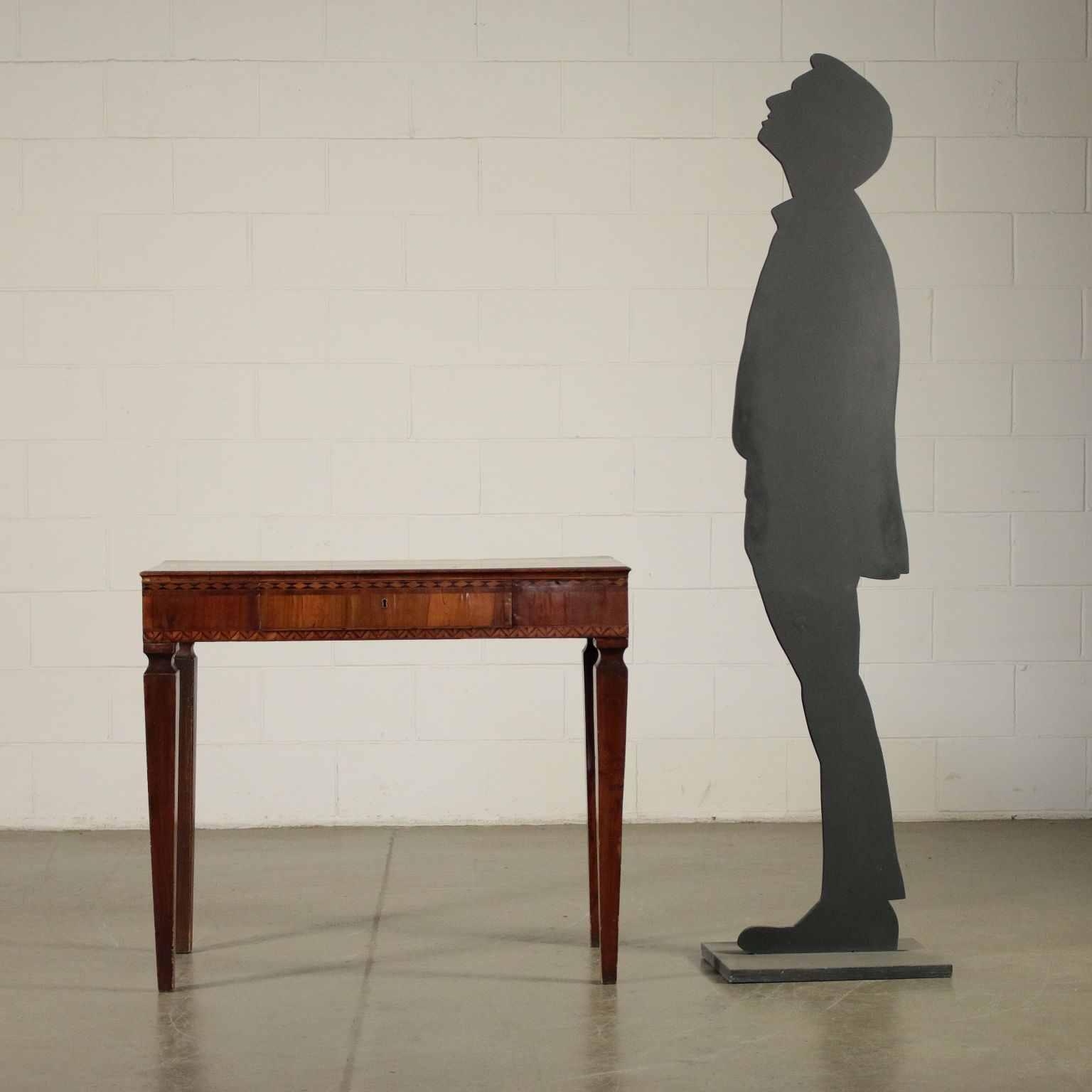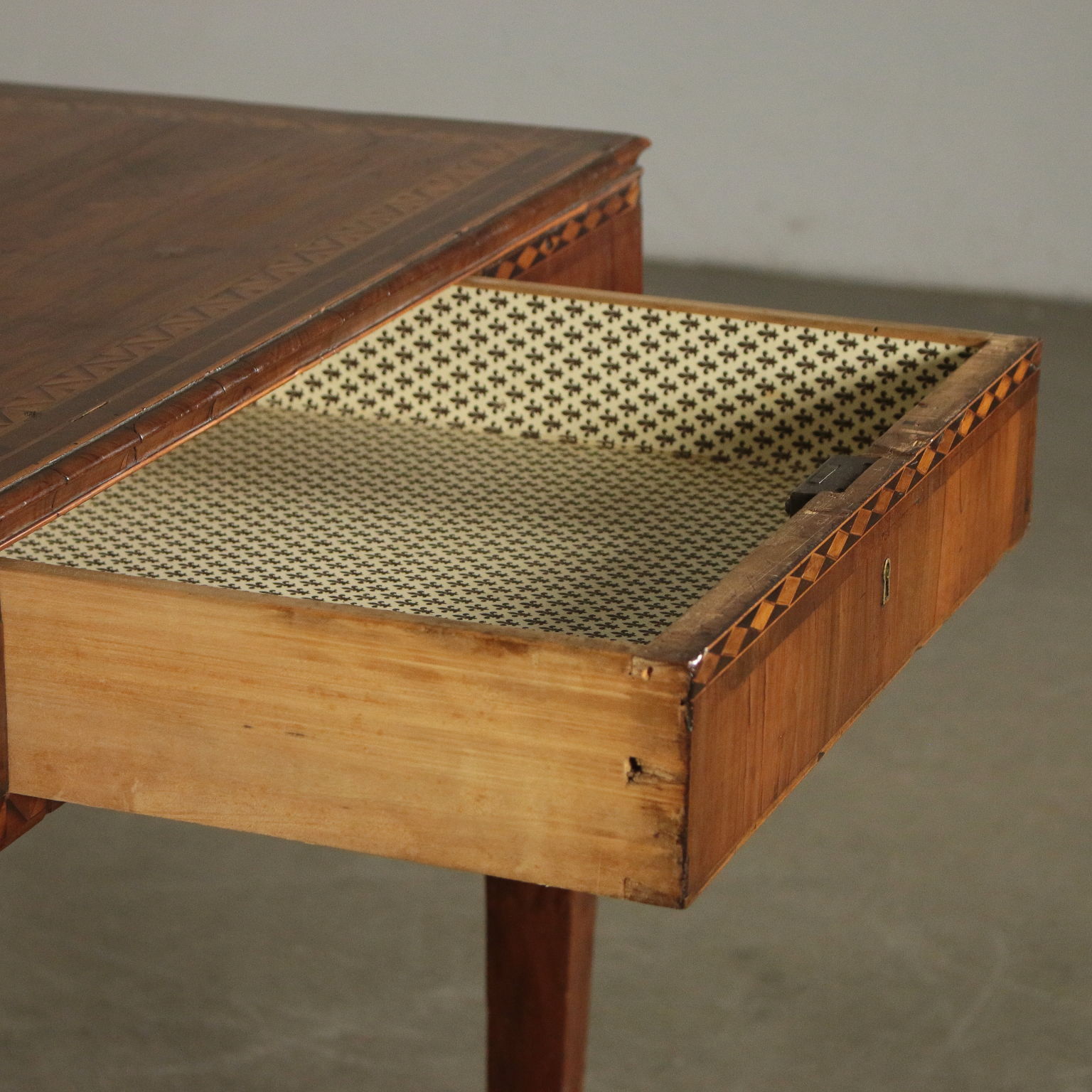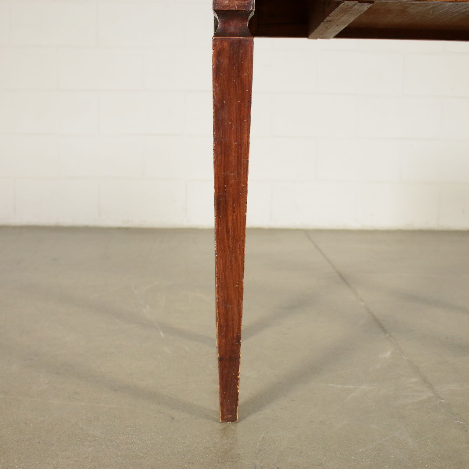 Tavolo parietale retto da gambe troncopiramidali di cui una in rovere sostituita. Un cassetto nella fascia. Presenta filettatura intarsiata con motivi geometrici. Cornice piano in legno di testa.