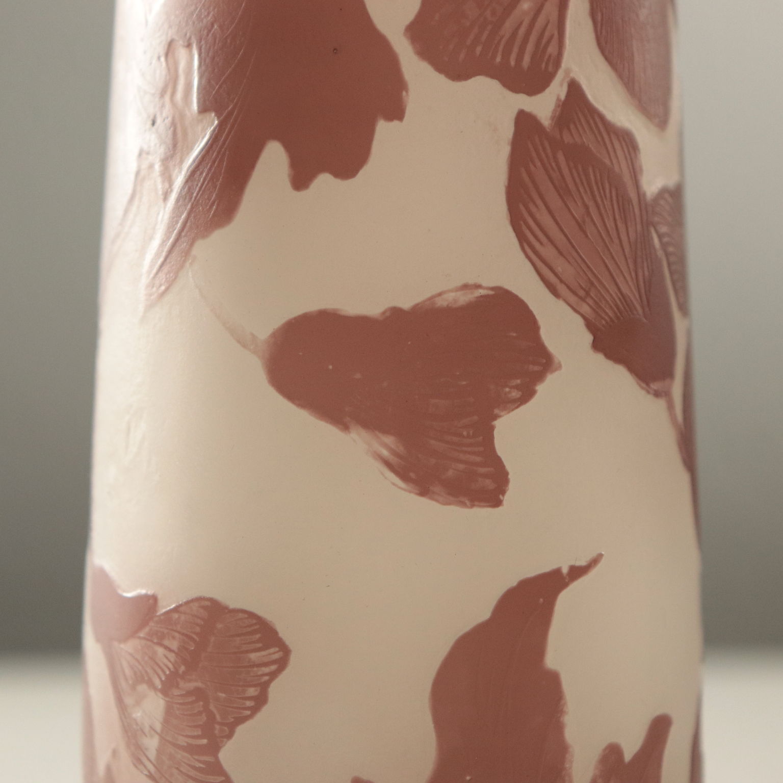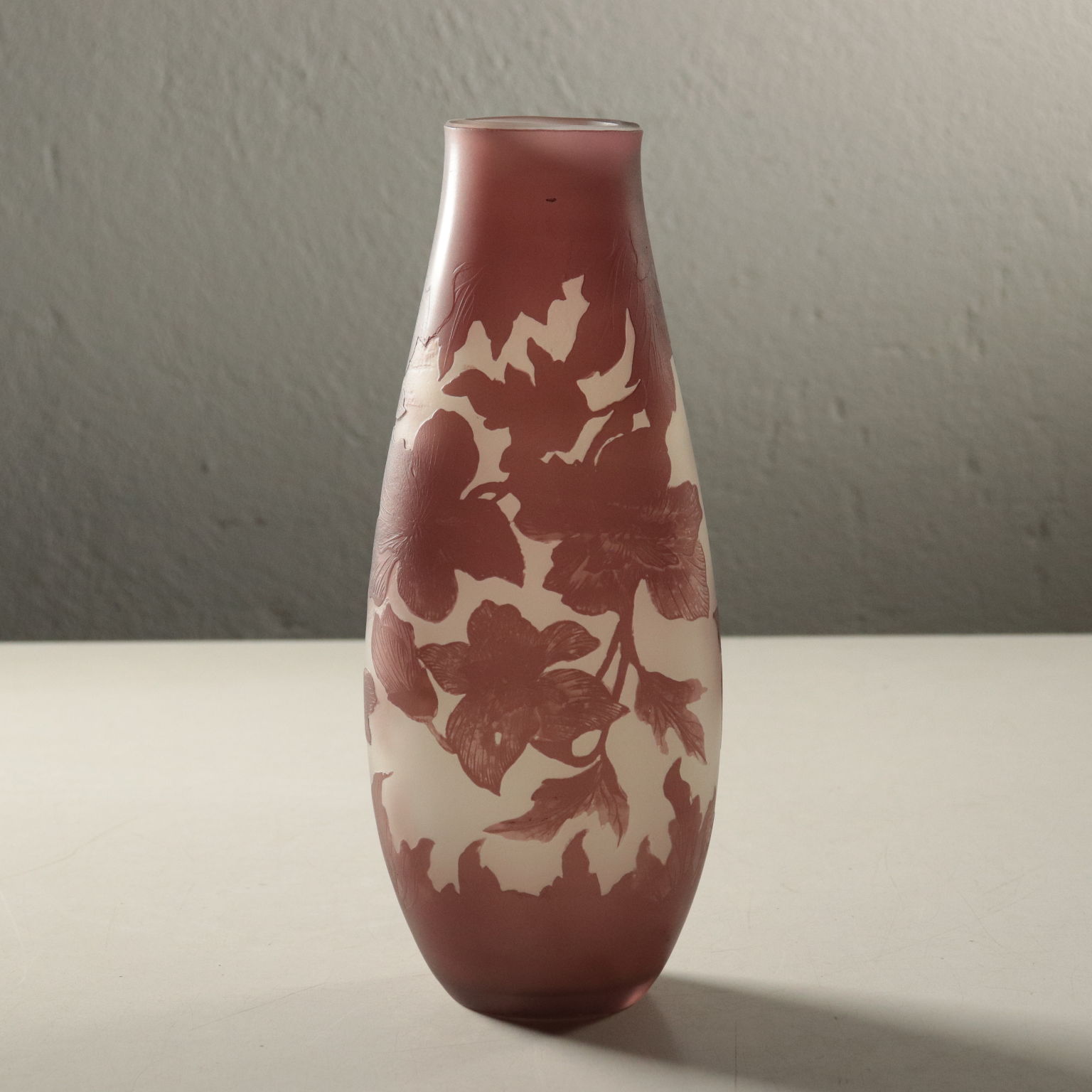 Vaso in vetro policromo decorato a motivi vegetali. Vaso ottenuto aggiungendo lamelle di vetro colorato quando il vetro è ancora incandescente. In seguito, una volta modellato e ricotto, il vaso viene inciso e decorato. Marchio di fabbrica sotto la base.