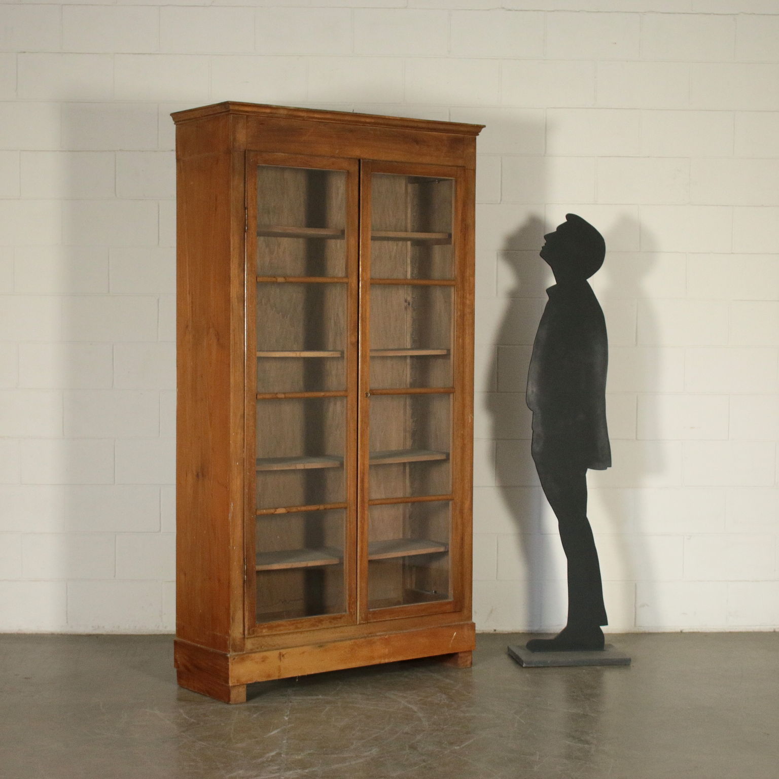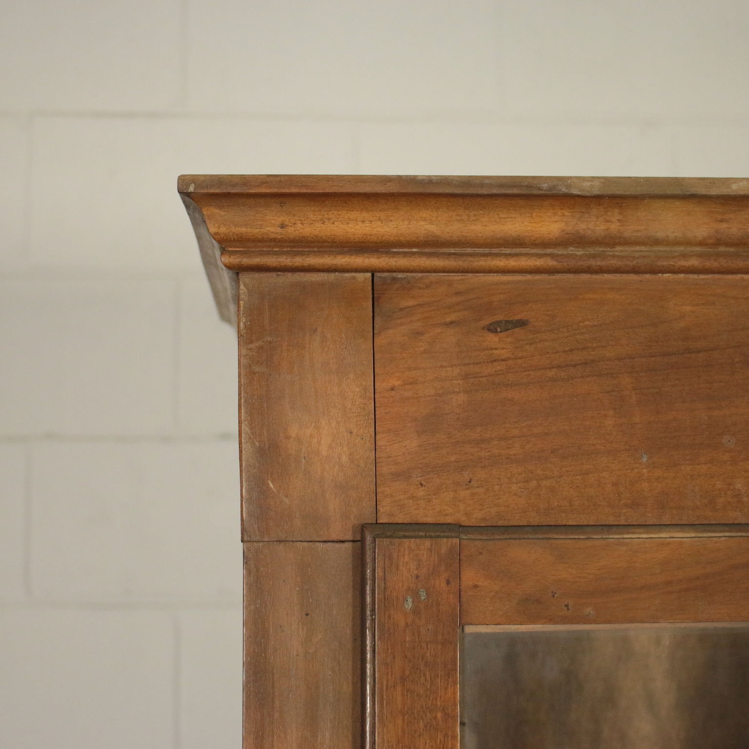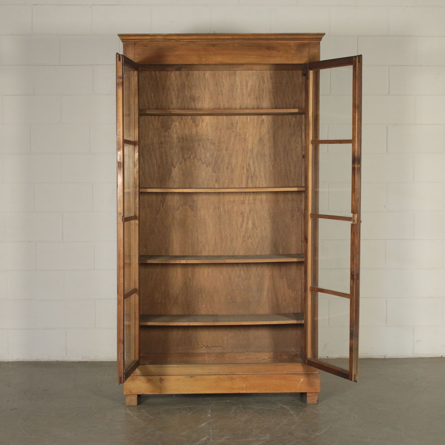 Libreria a due ante con vetri quadripartiti. Cappello con cornice. Quattro ripiani interni.