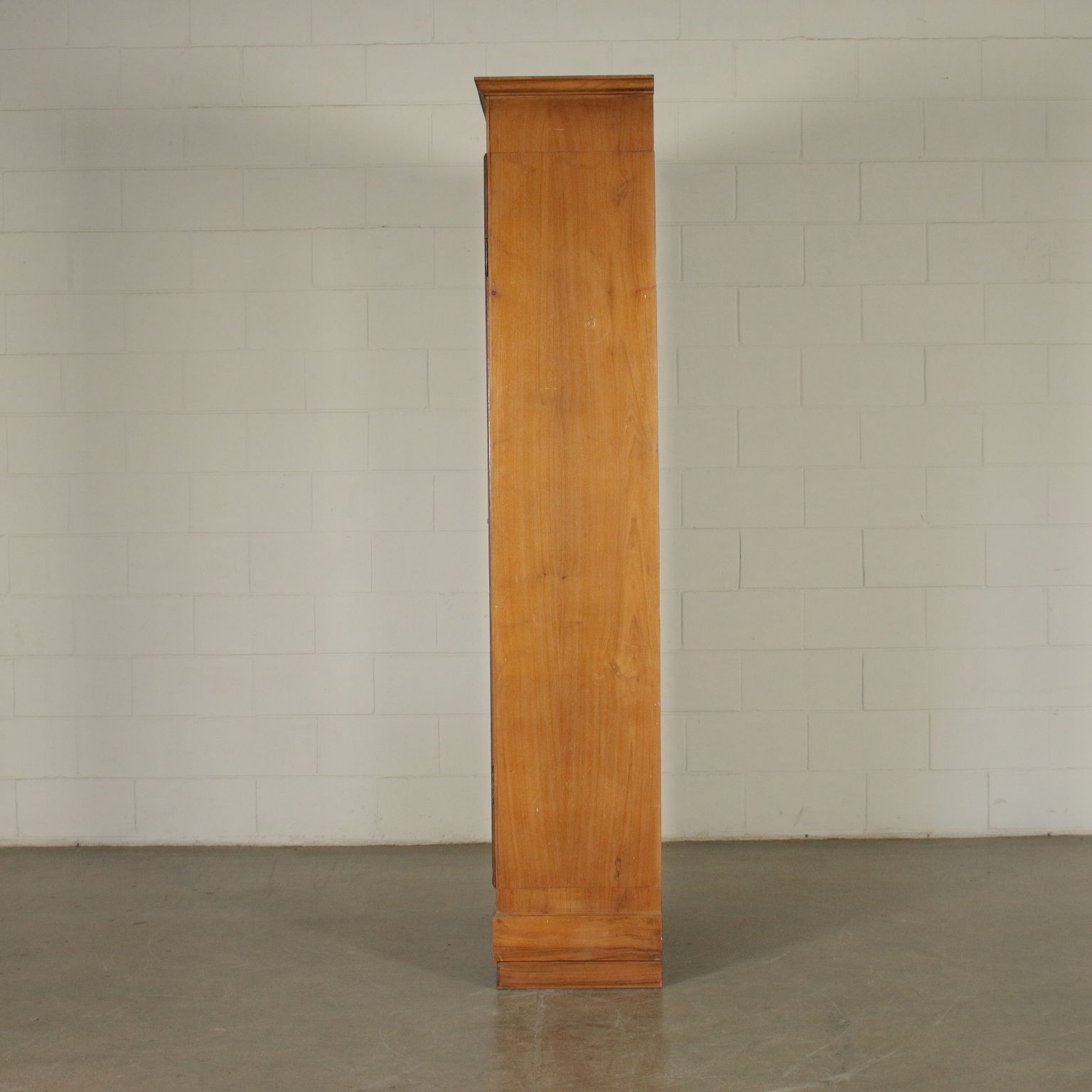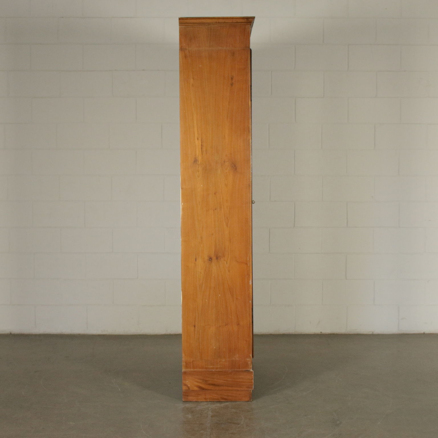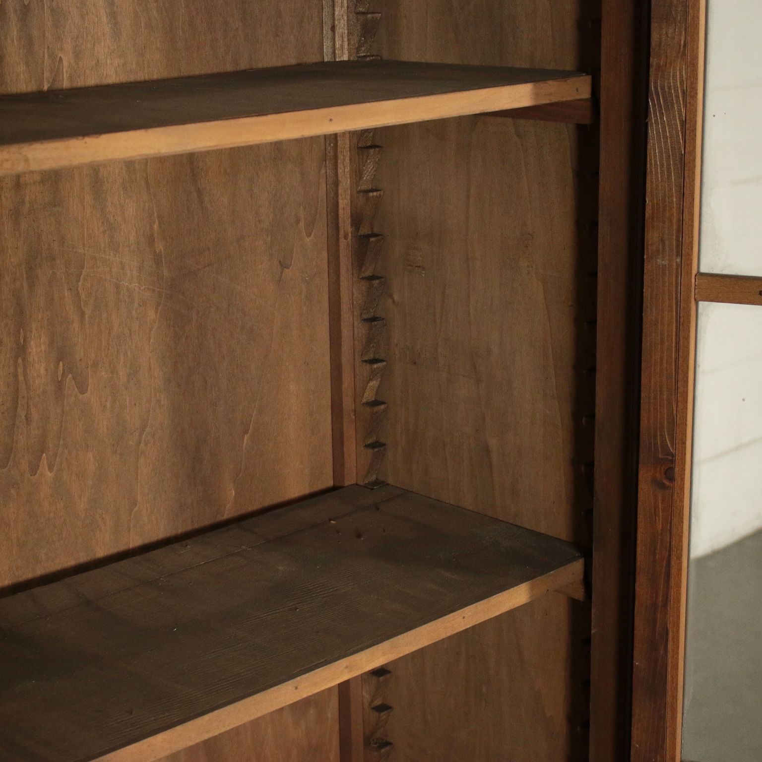 Libreria a due ante con vetri quadripartiti. Cappello con cornice. Quattro ripiani interni.