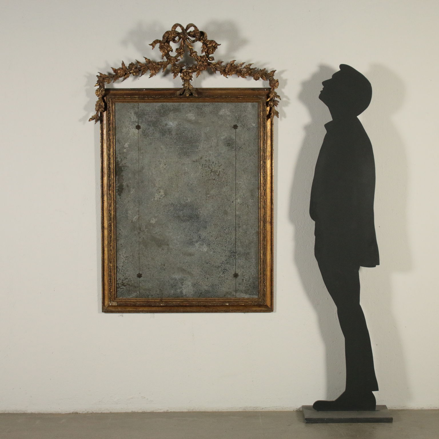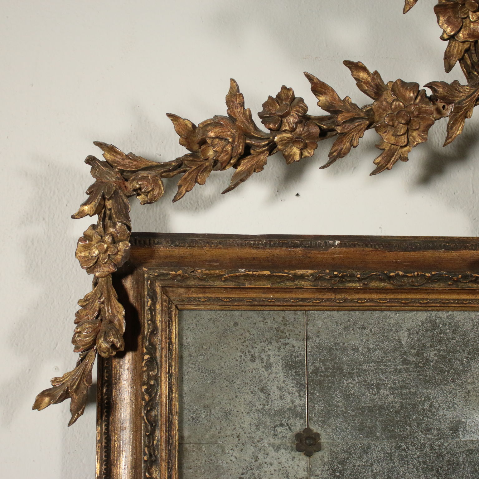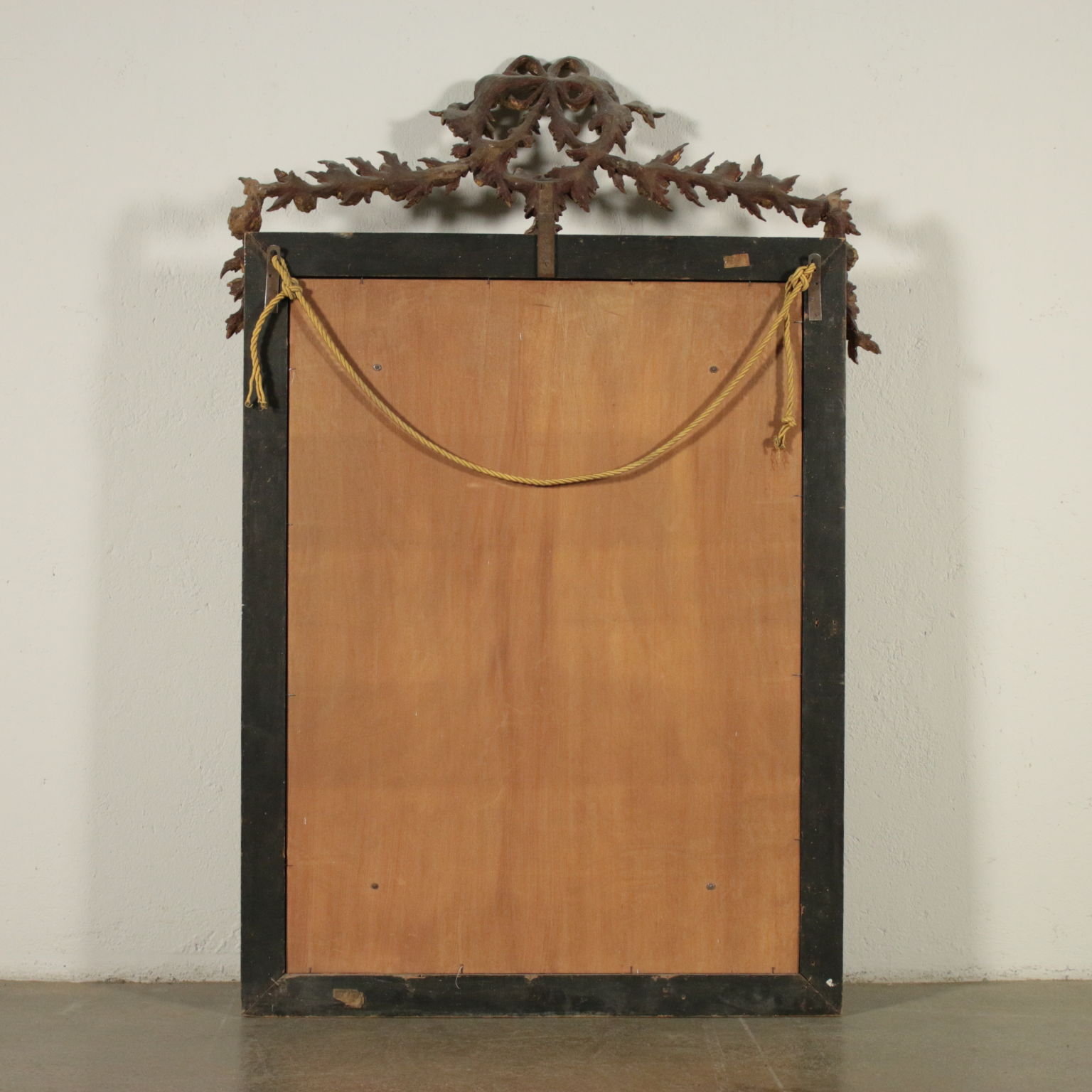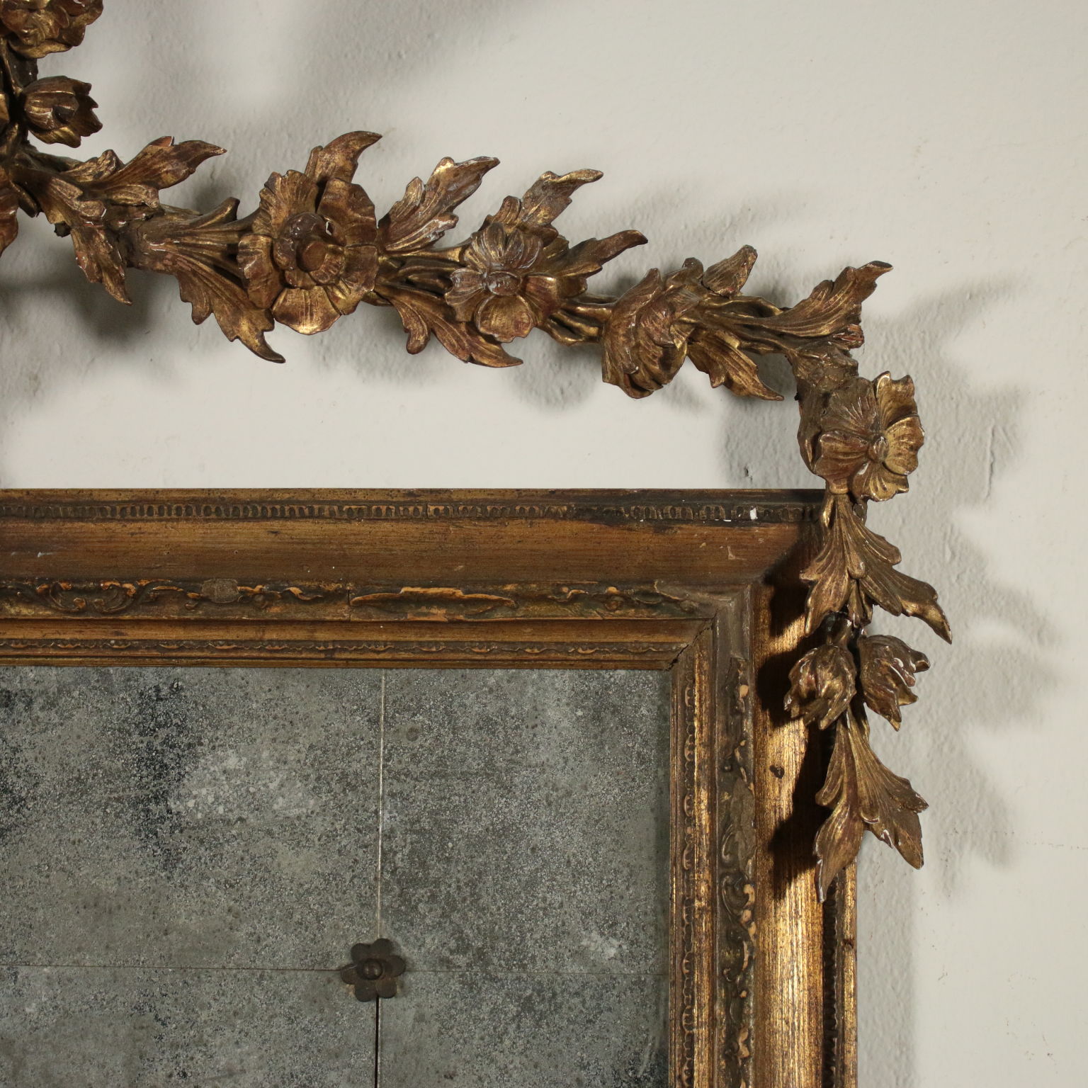 Specchiera dalla cimasa riccamente intagliata e traforata. Specchio composto da più elementi fissati da roselline.