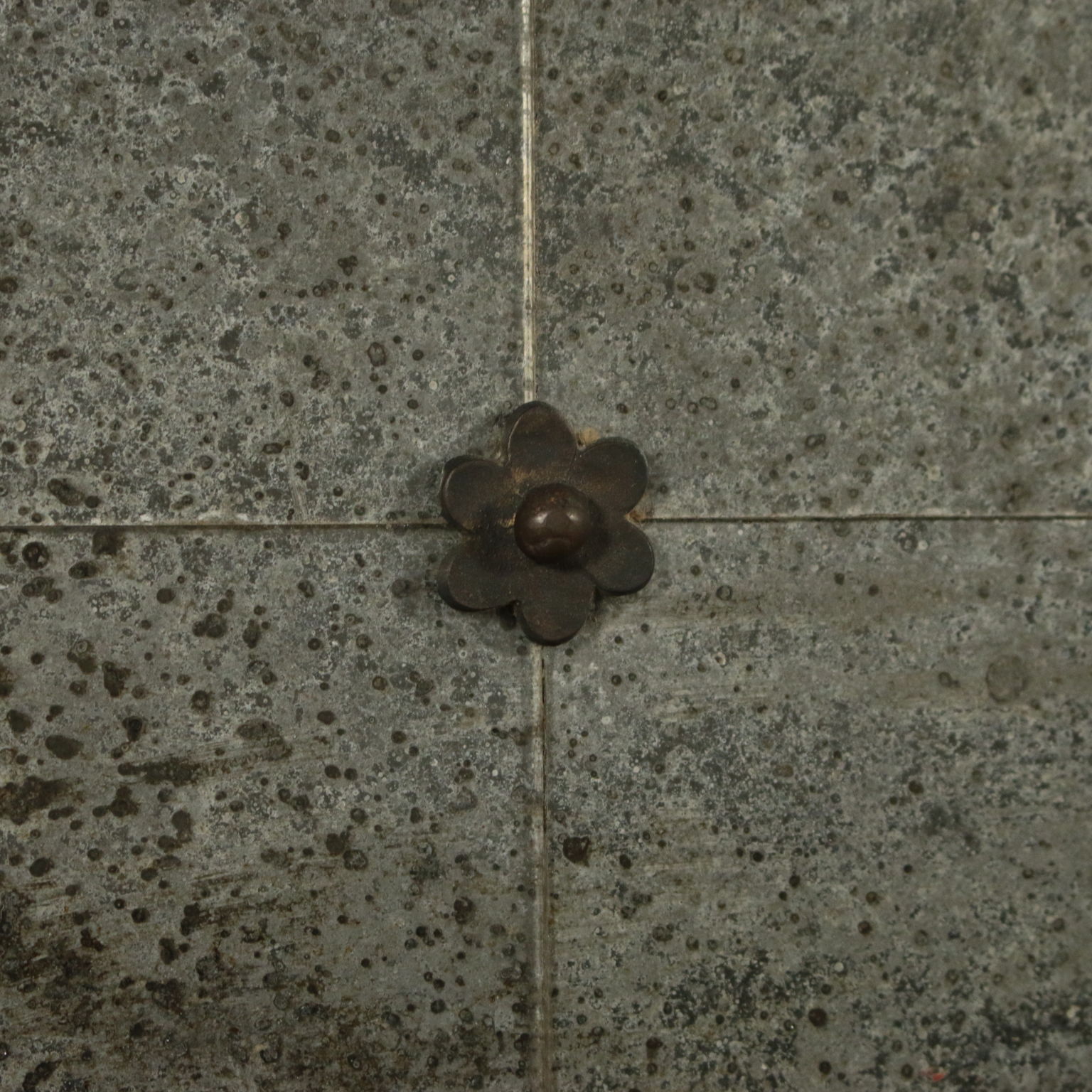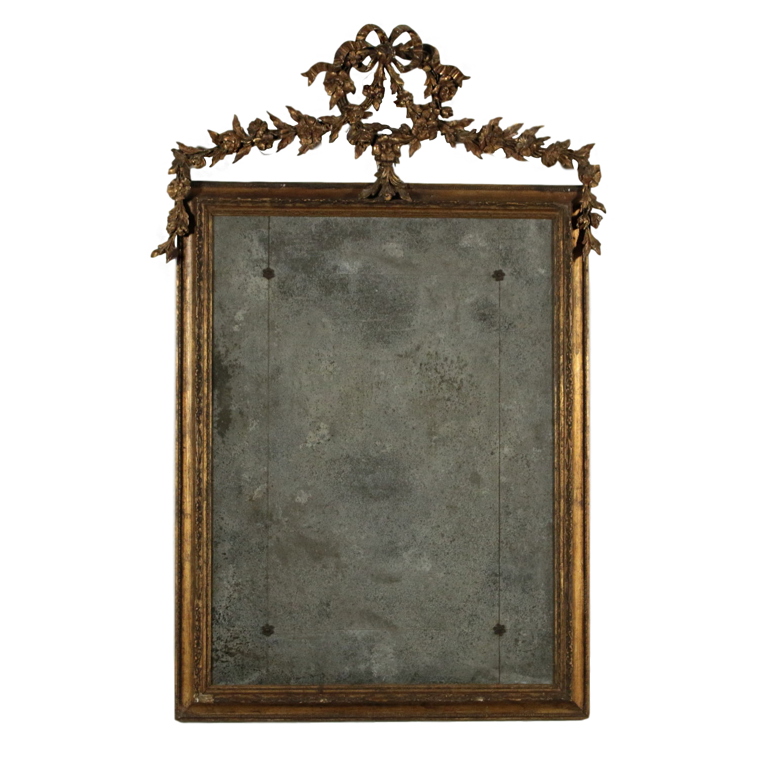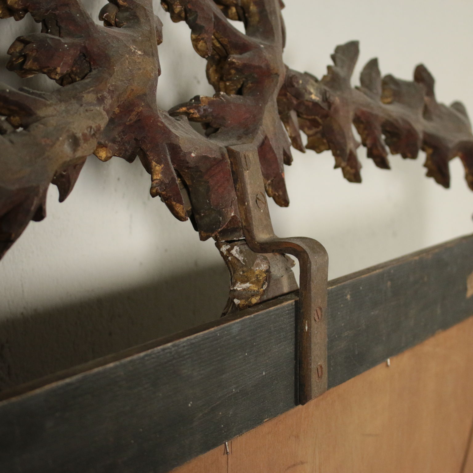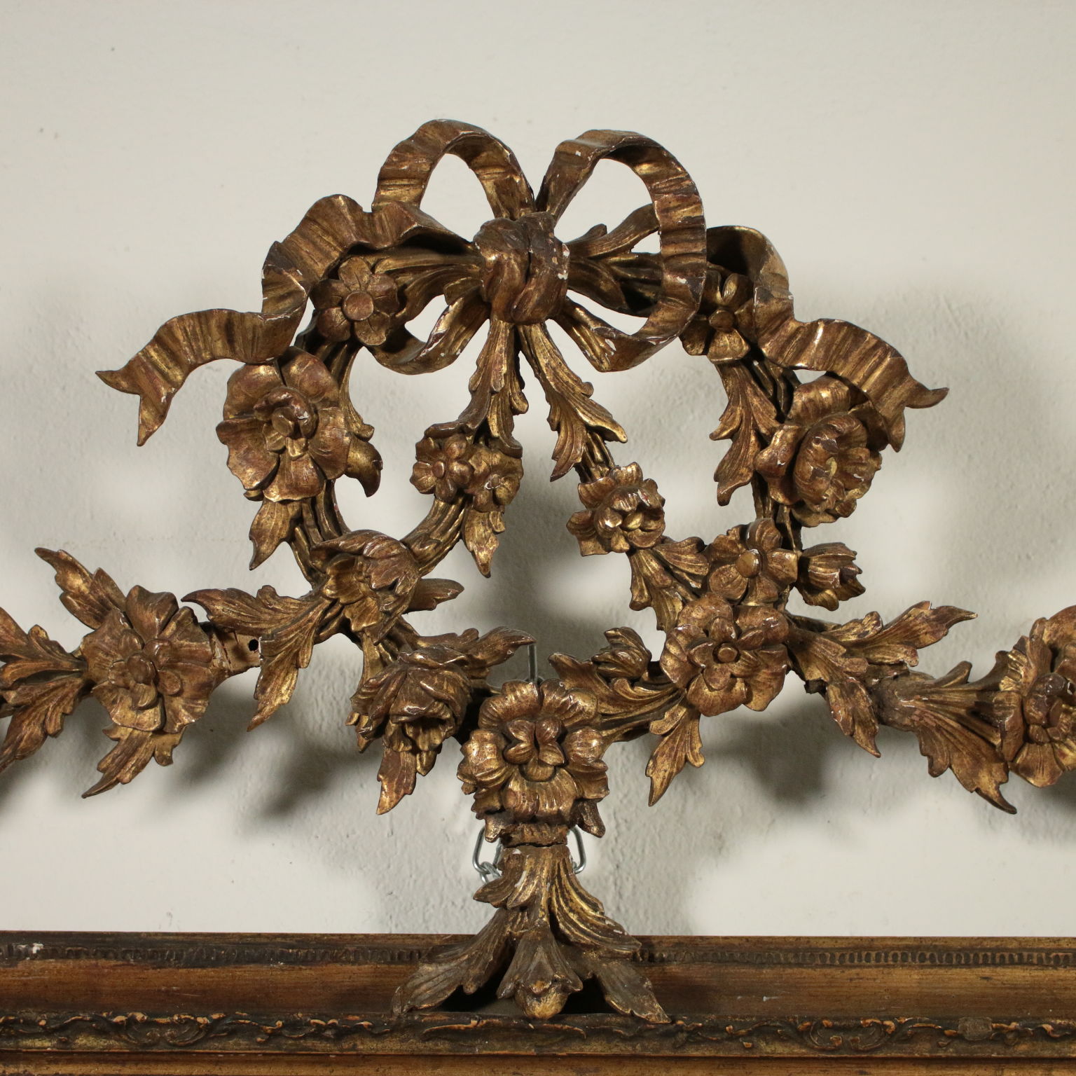 Specchiera dalla cimasa riccamente intagliata e traforata. Specchio composto da più elementi fissati da roselline.