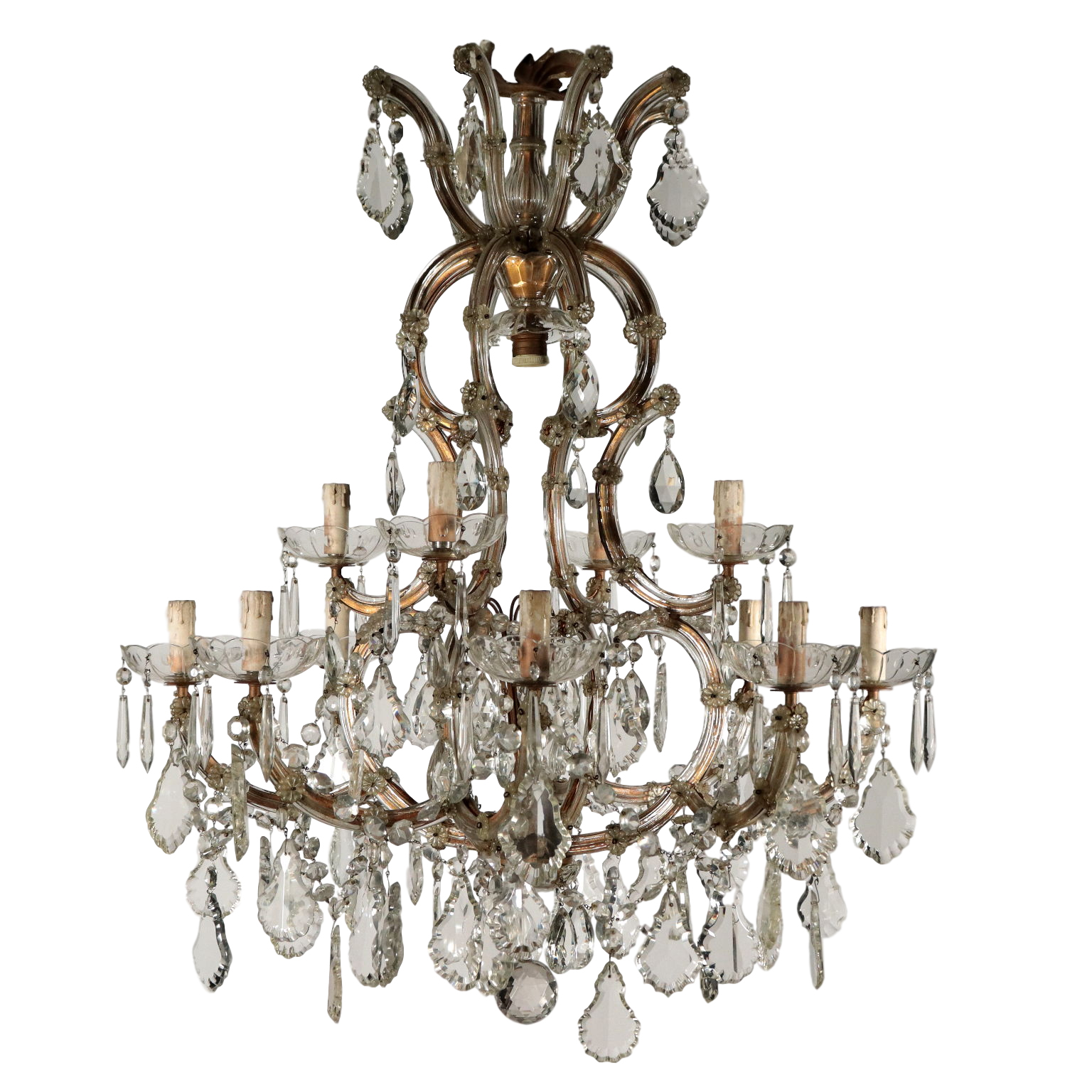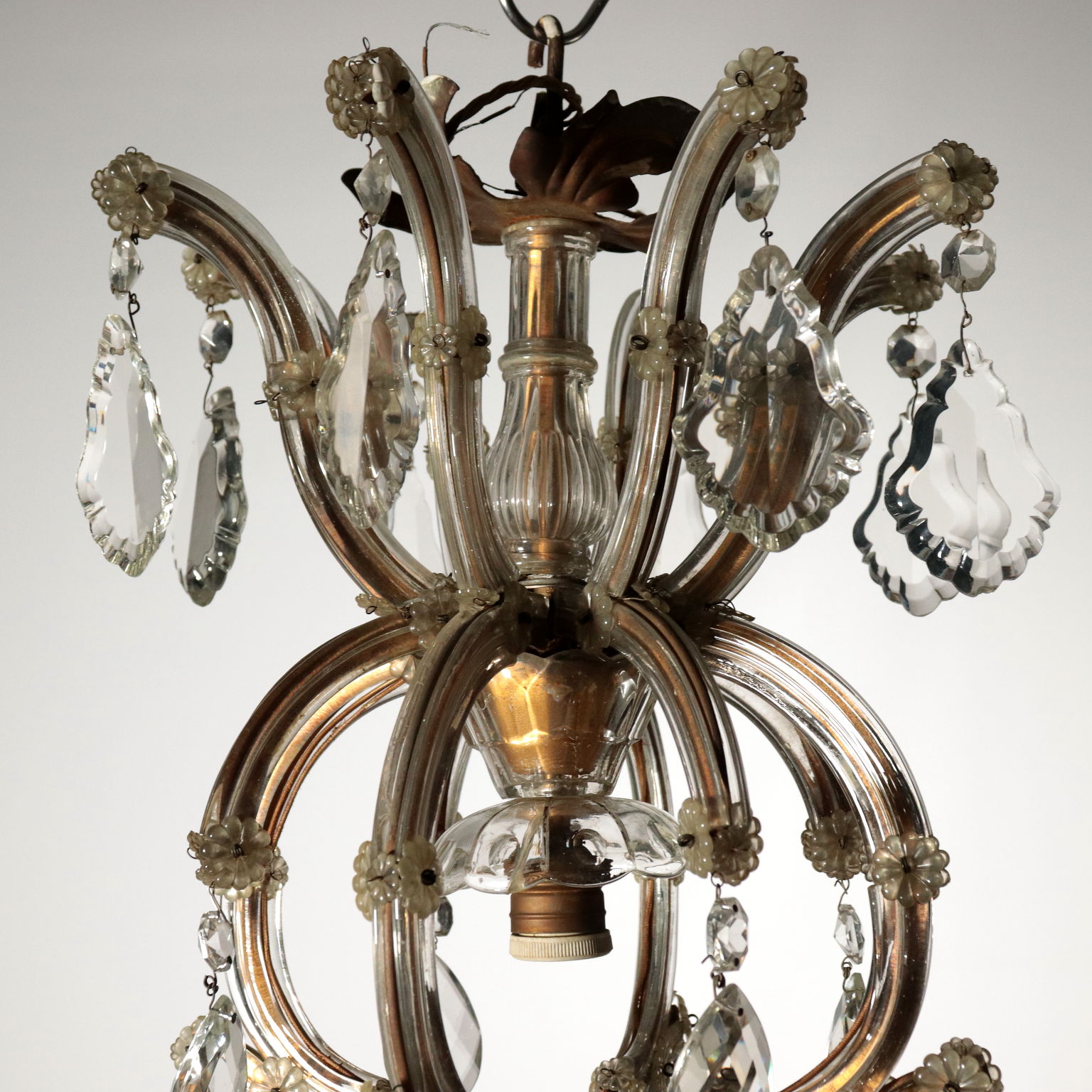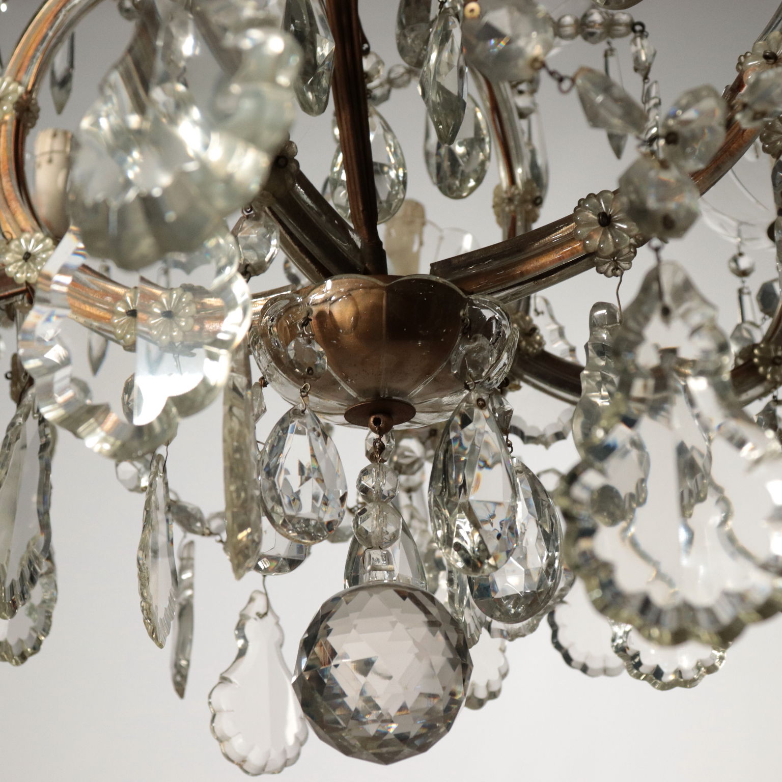 Lampadario a quattro bracci tripartiti; tredici punti luce. Cordoni e pendenti in vetro.