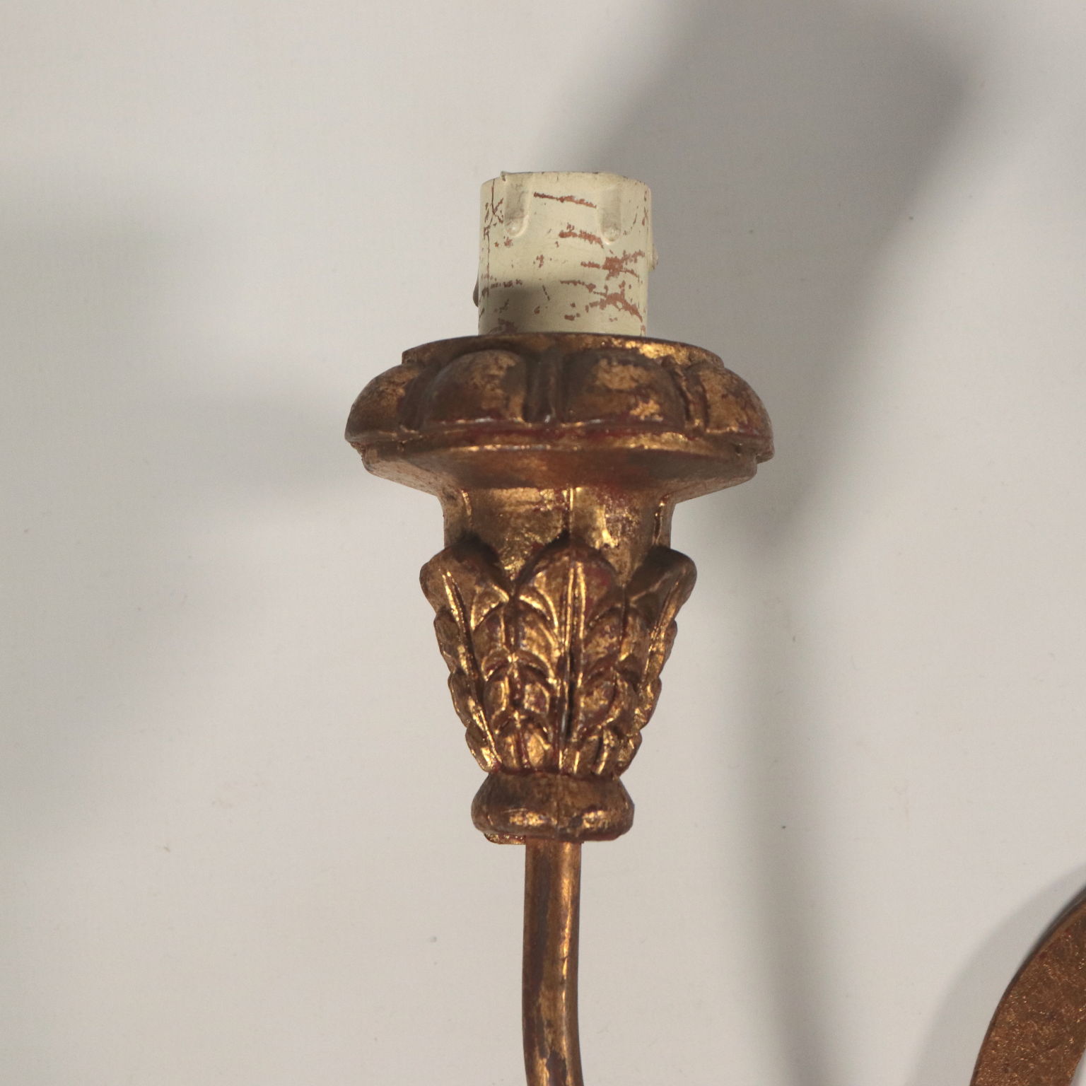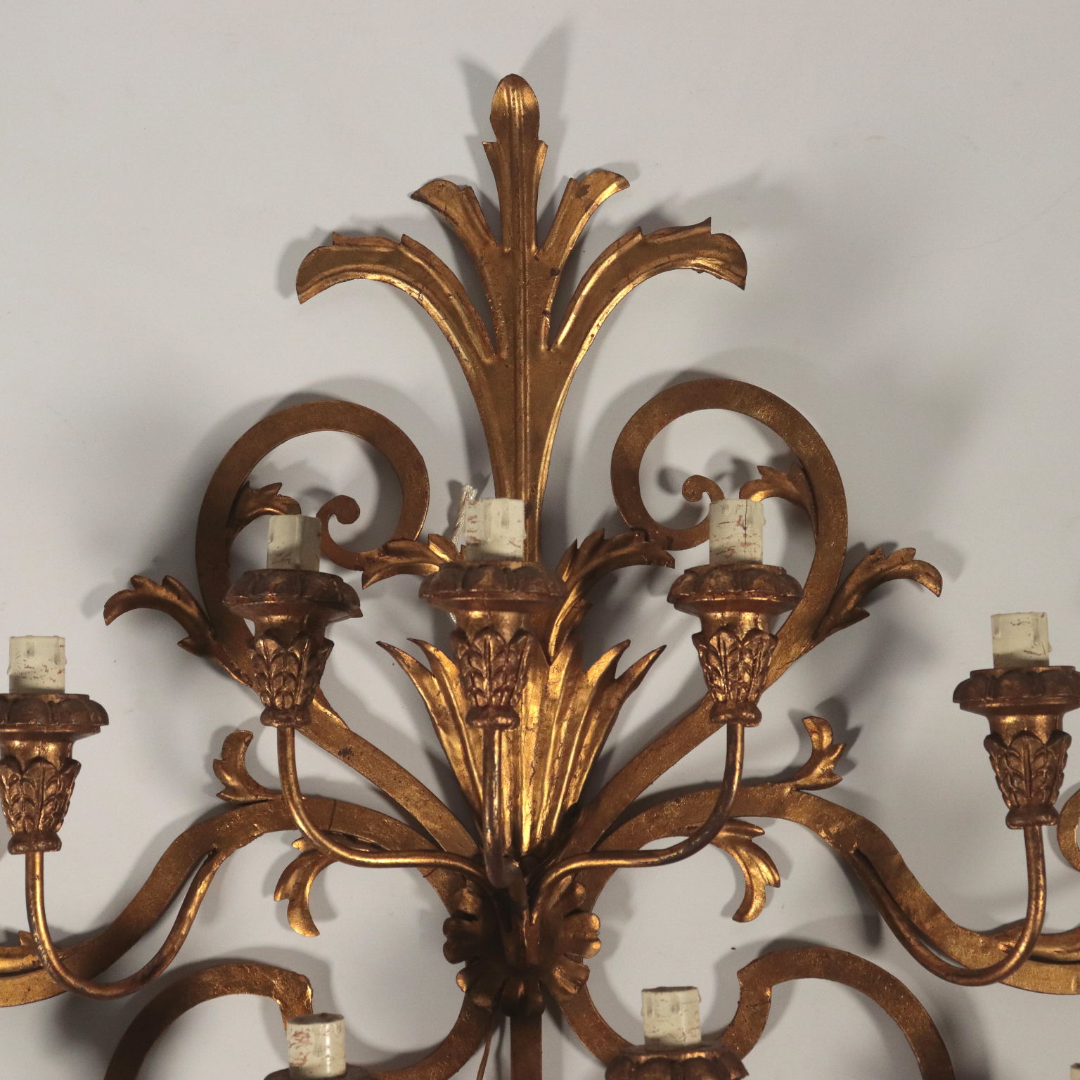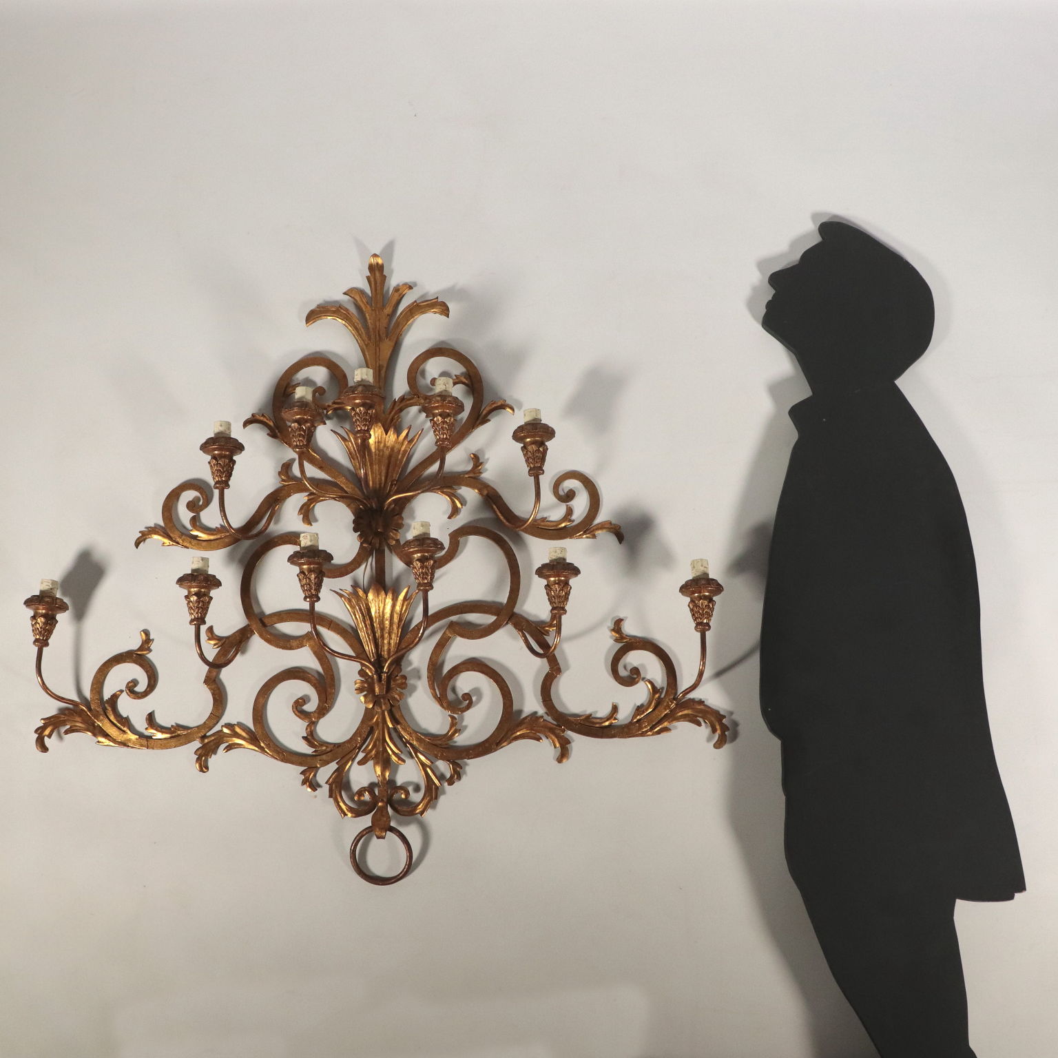 Grande applique a undici luci con supporti in legno intagliato. Corpo lavorato in ferro con volute ed elementi fogliacei.
