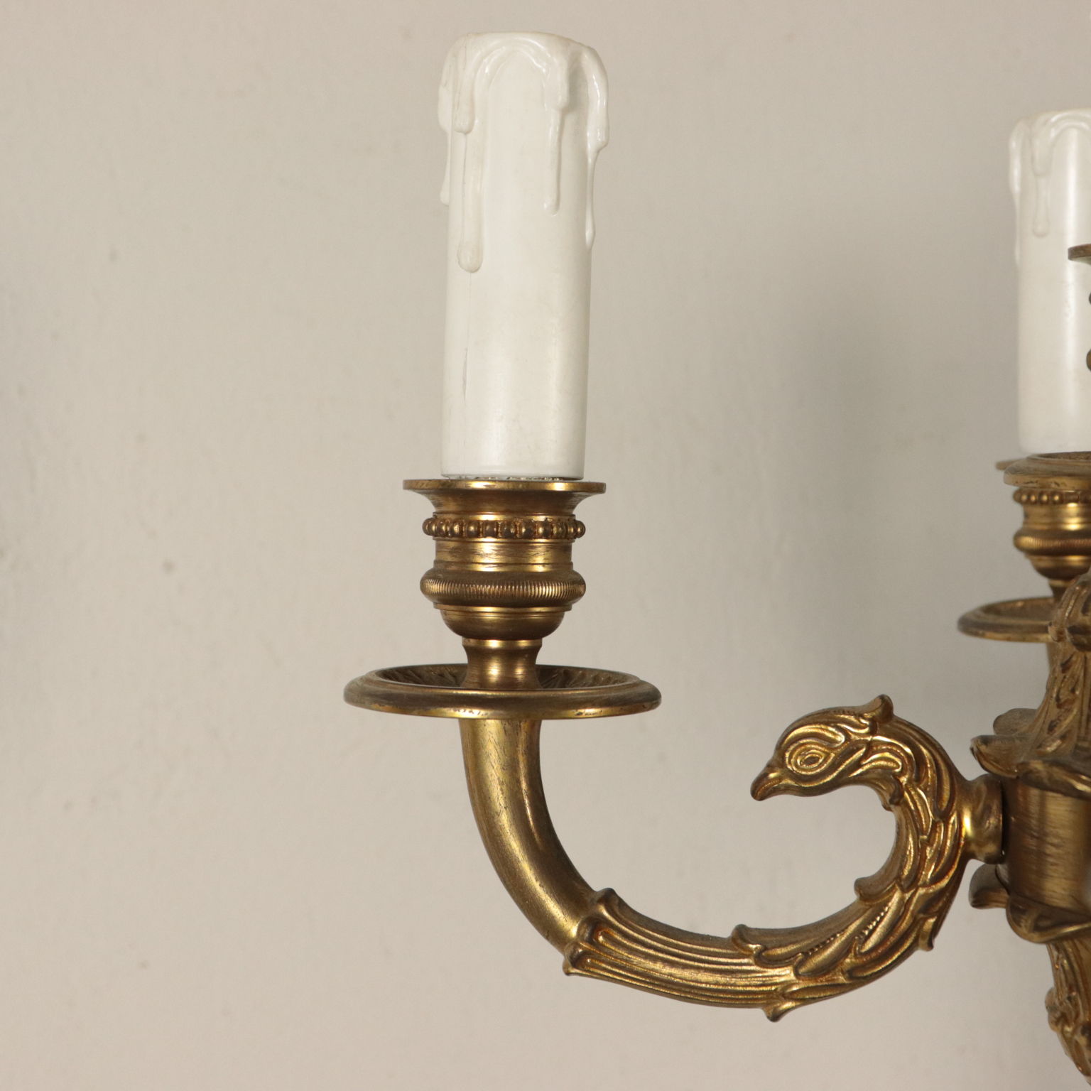 Coppia di candelieri a cinque fiamme in bronzo dorato e cesellato. Quattro piedi a foggia ferina appoggiano su una base a forma irregolare. Decori a motivi vegetali e bracci a voluta con becco di uccello.