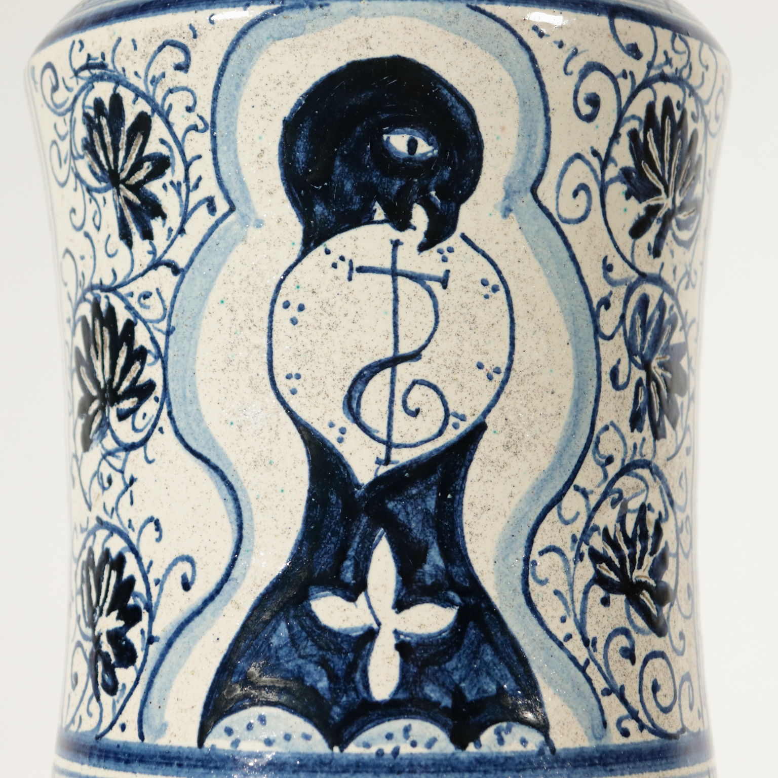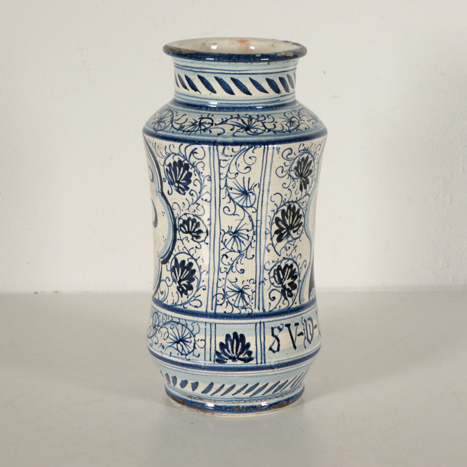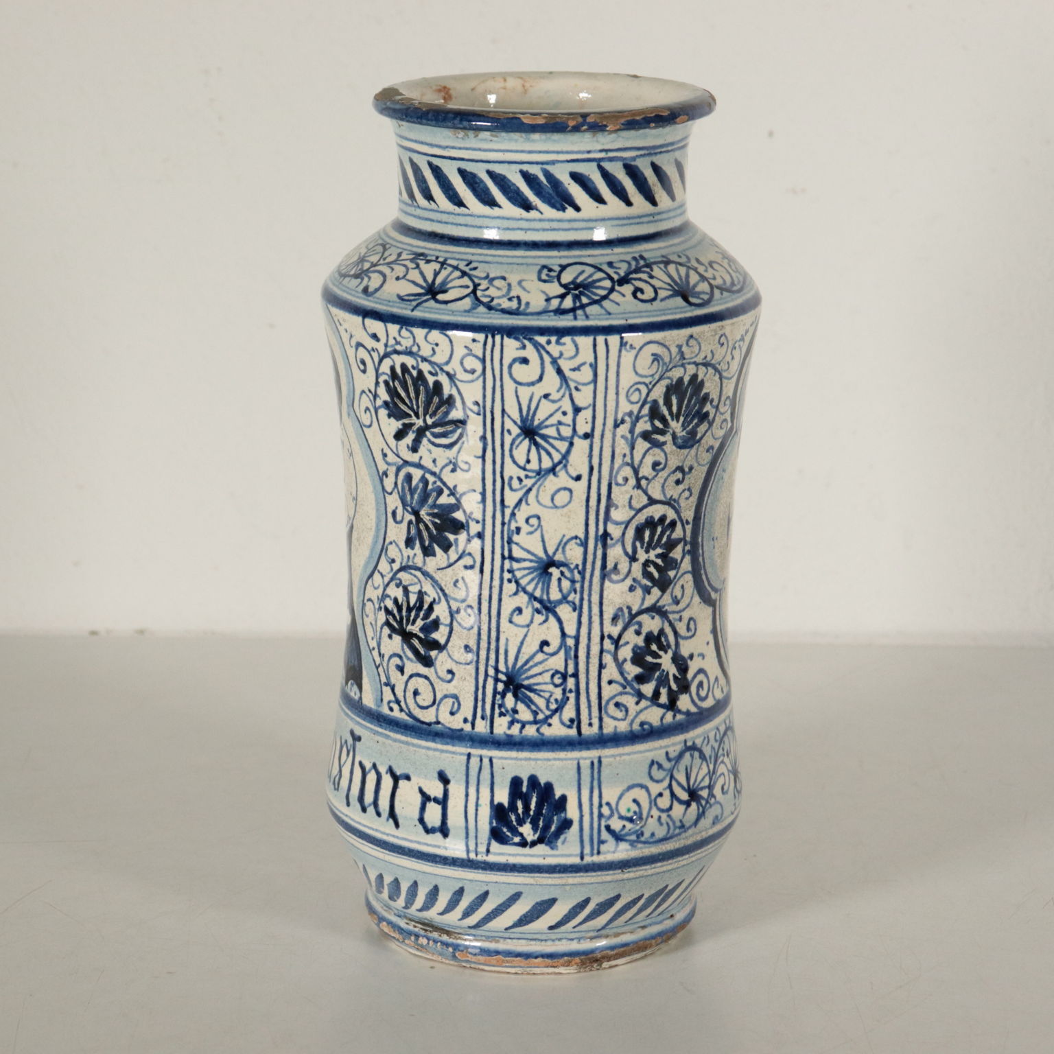 Albarello in ceramica maiolicata con decori in blu a motivi vegetali e riserve.