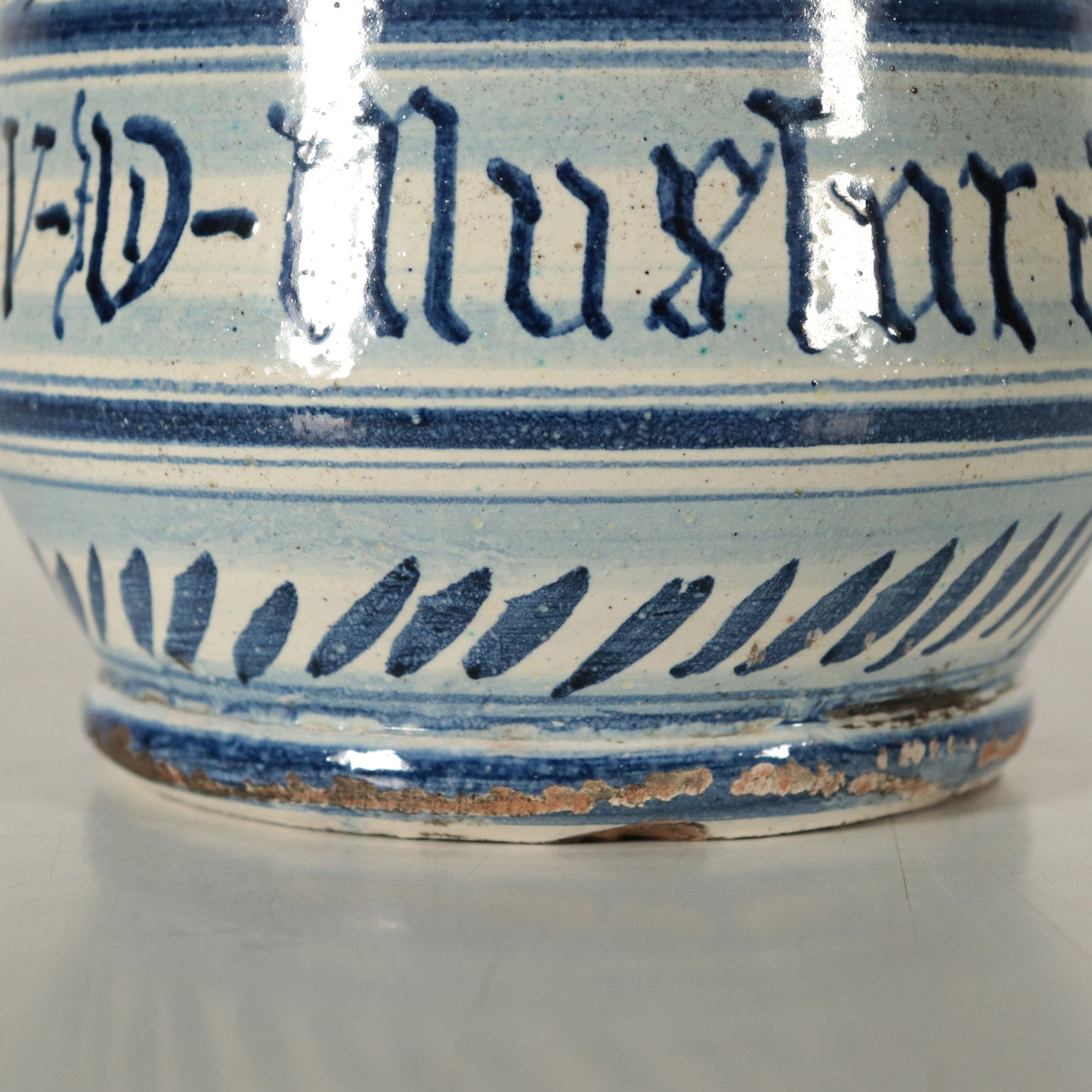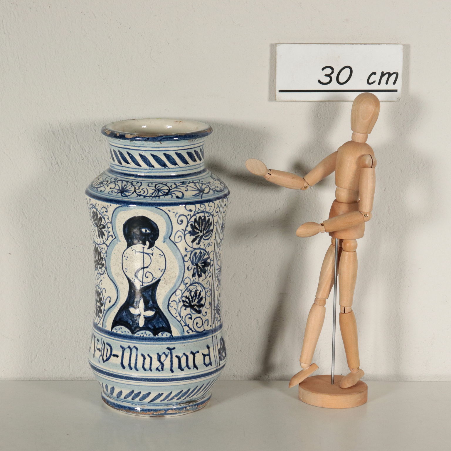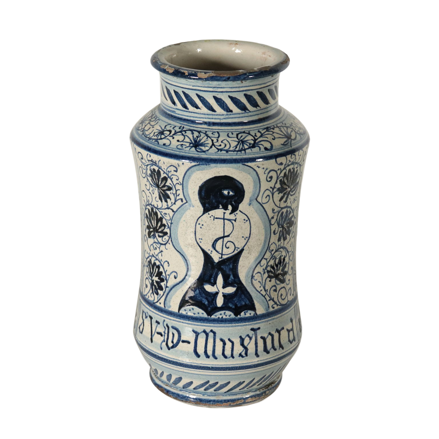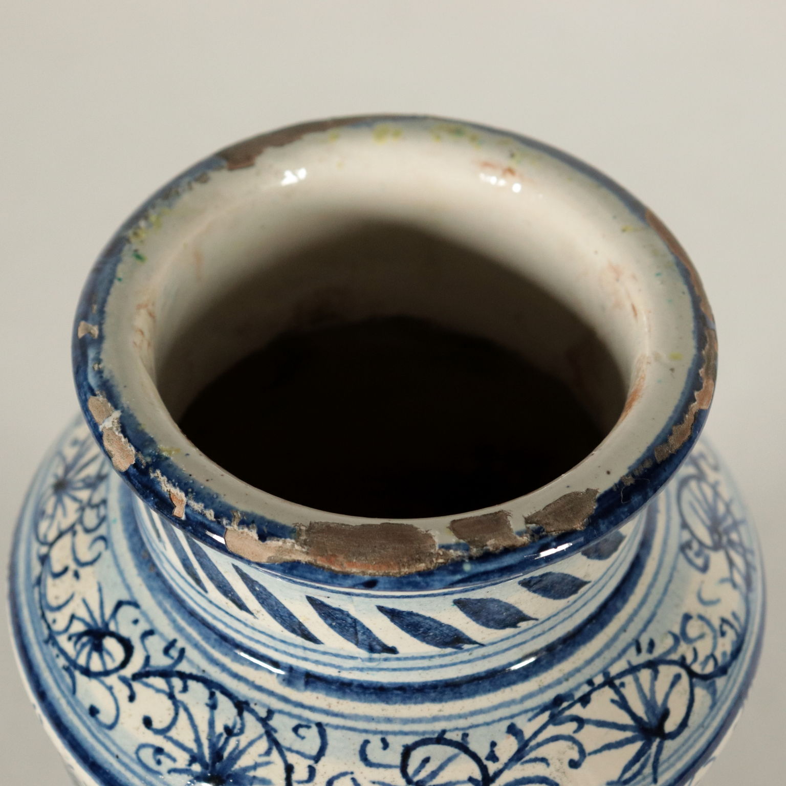 Albarello in ceramica maiolicata con decori in blu a motivi vegetali e riserve.