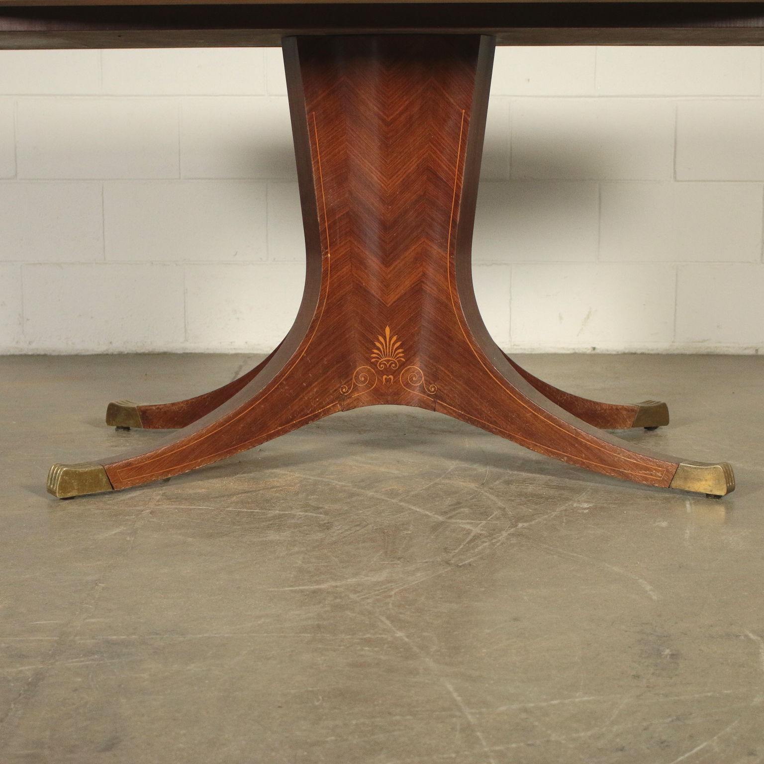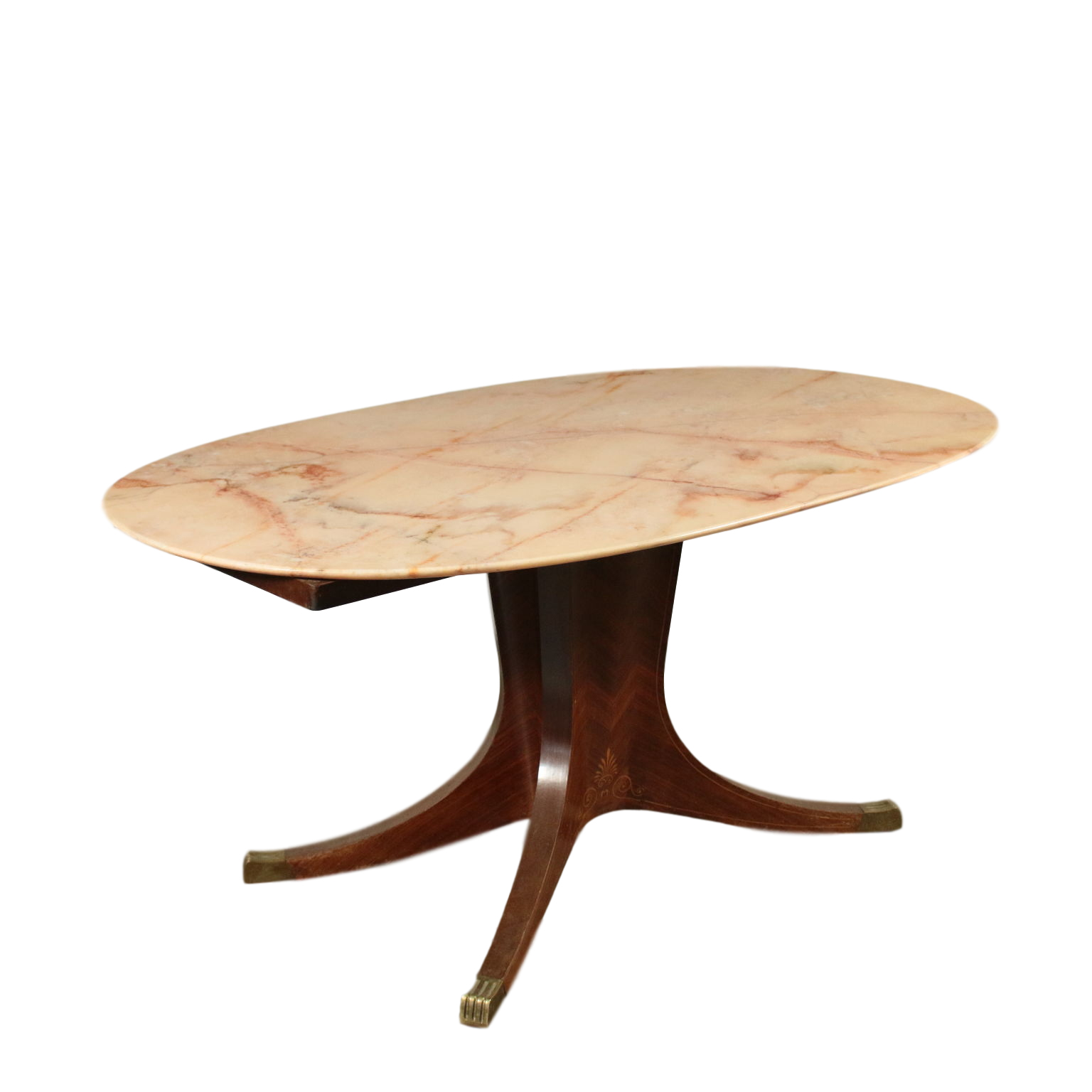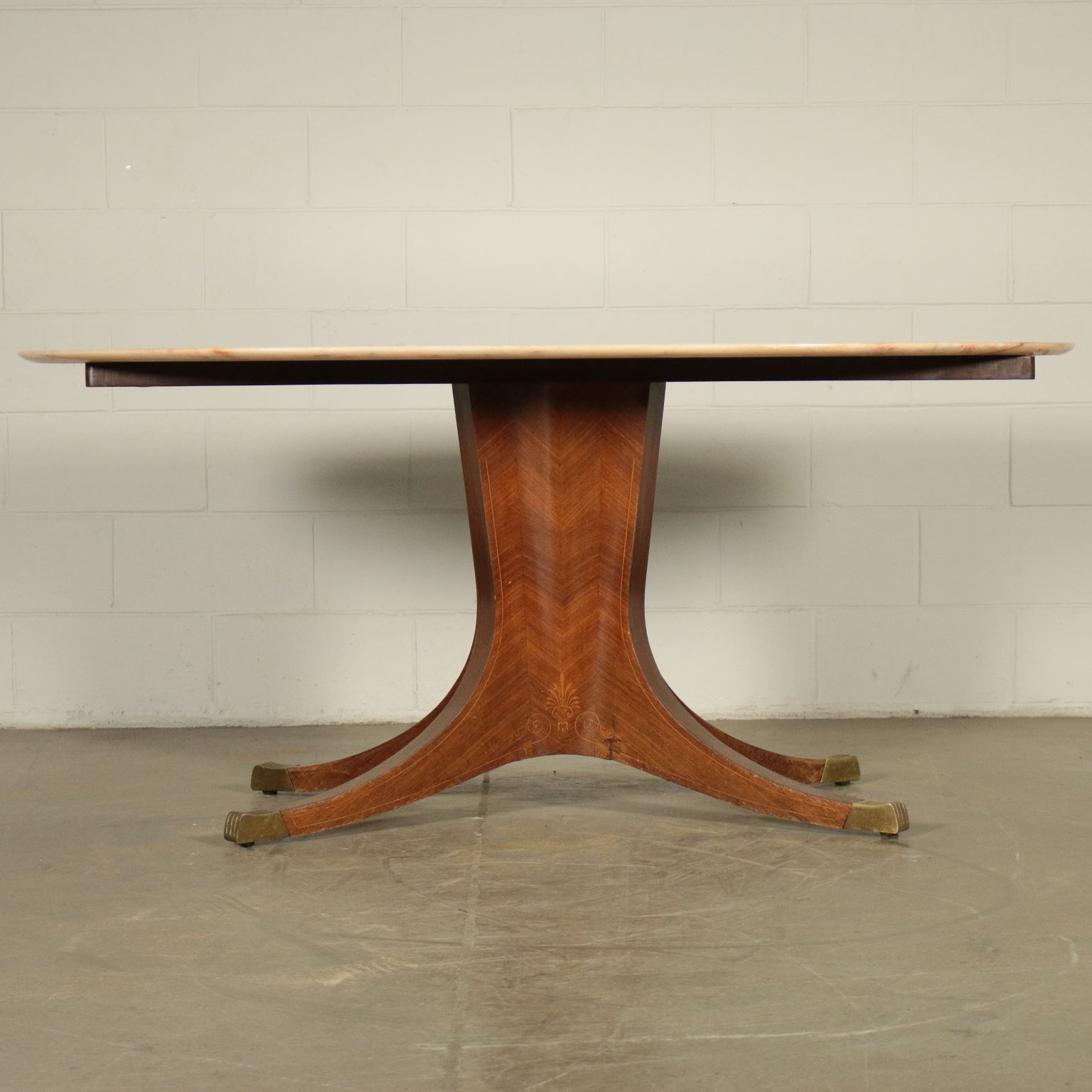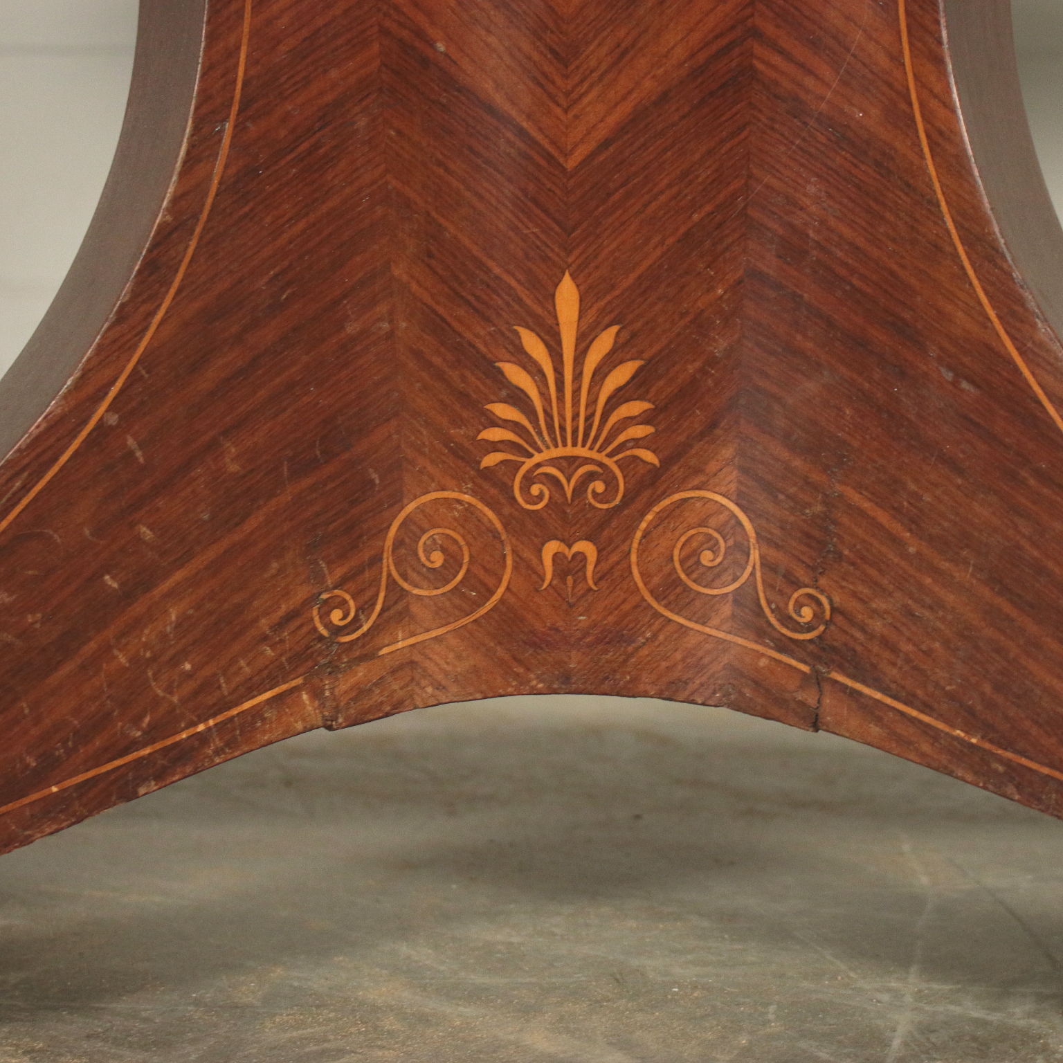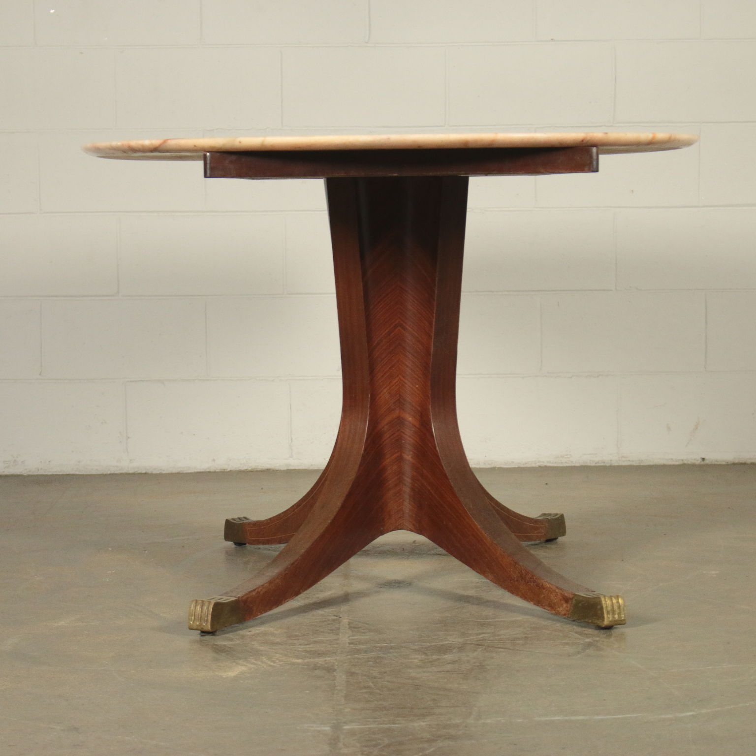 Tavolo con base in legno impiallacciato palissandro, con decori ad intarsio, puntali in ottone, piano in marmo.