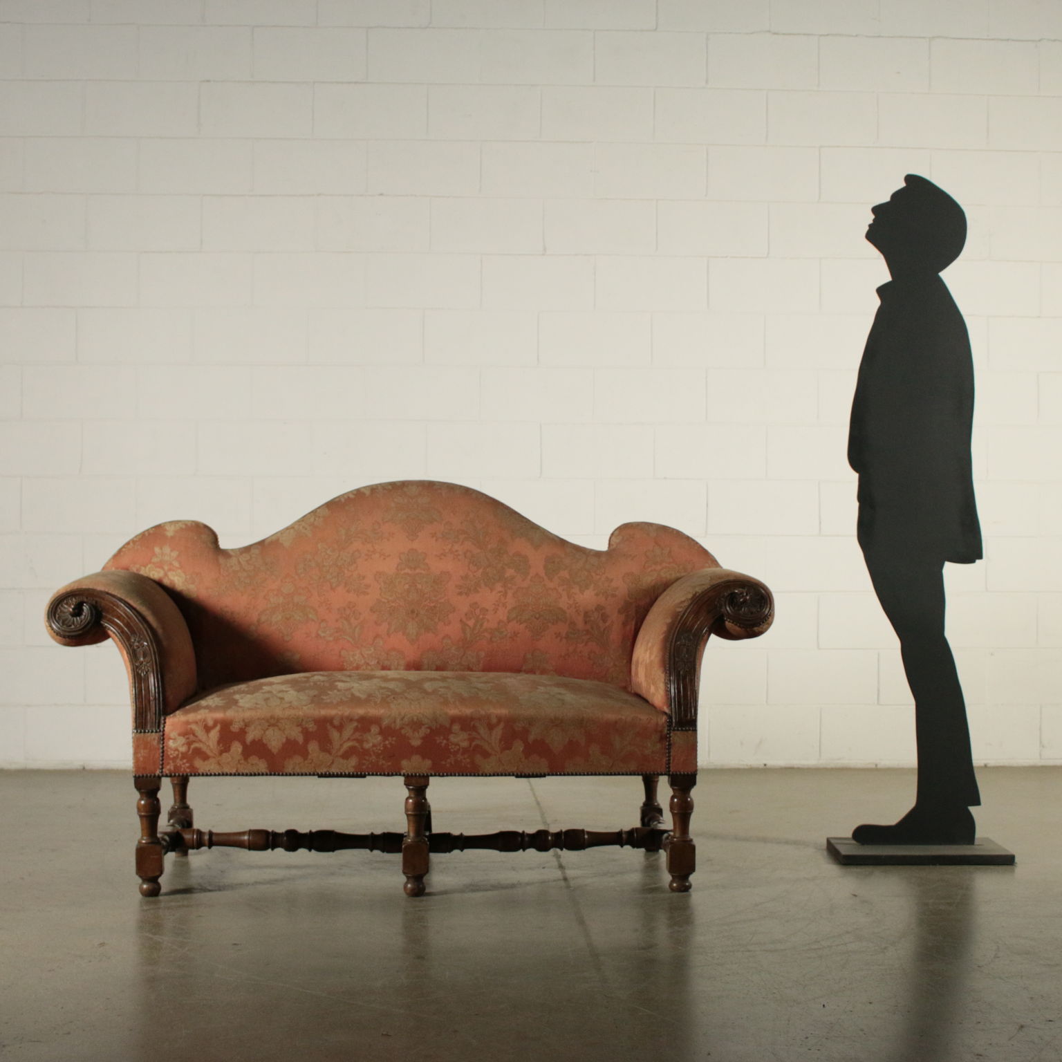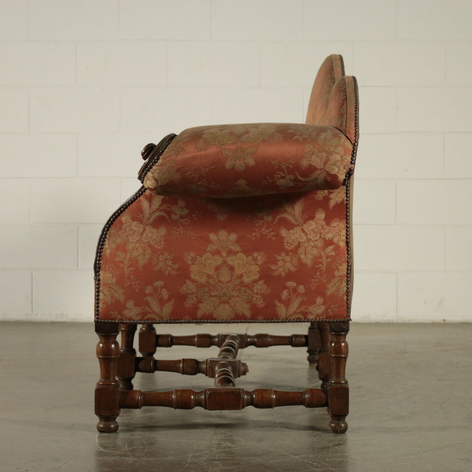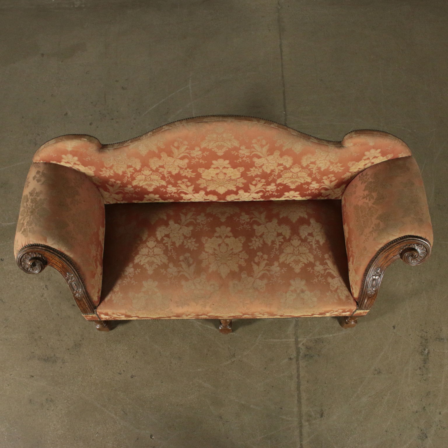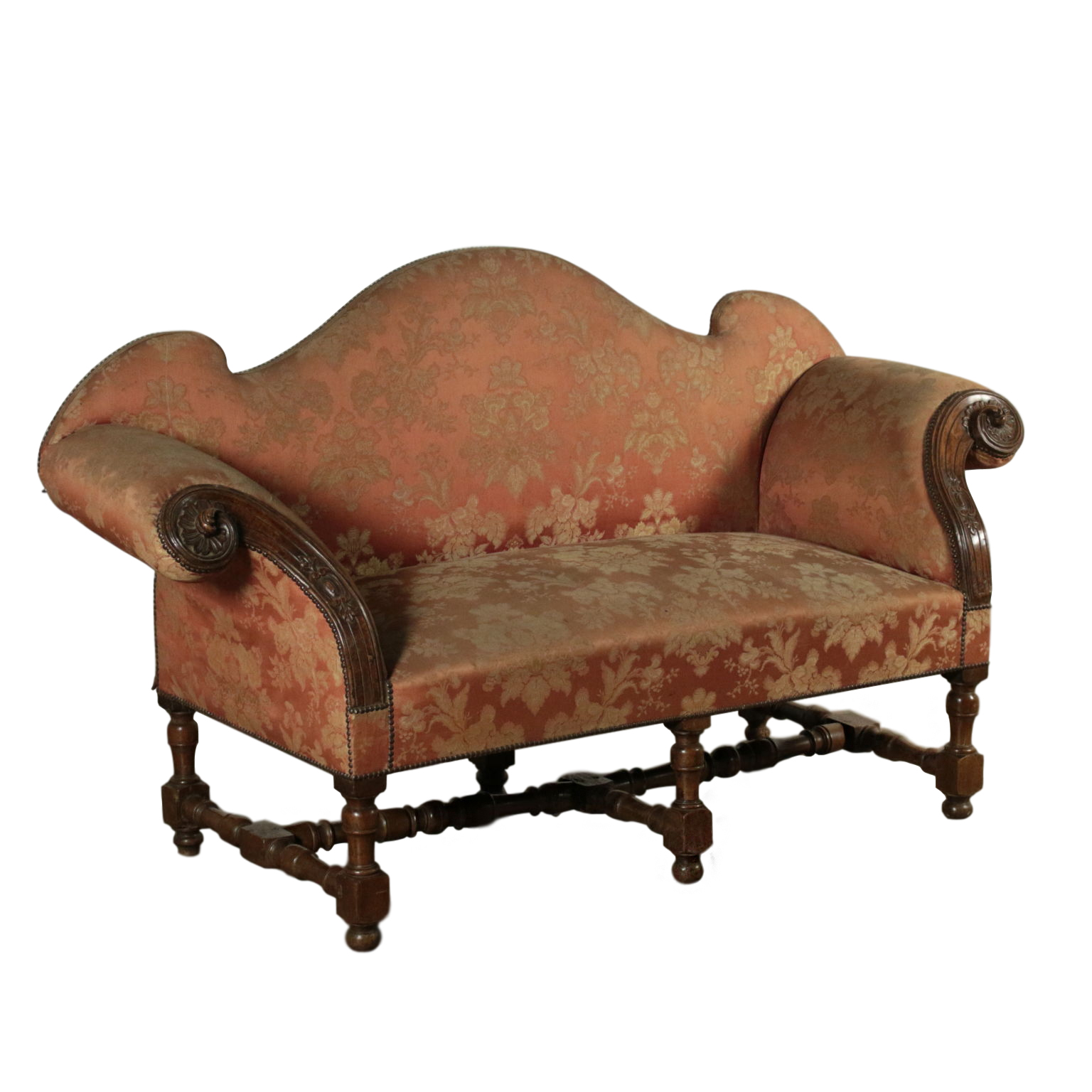 Divano due posti ad orecchioni. Retto da gambe tornite raccordate da crociera. Ampi braccioli intagliati. Schienale sagomato e seduta imbottiti.