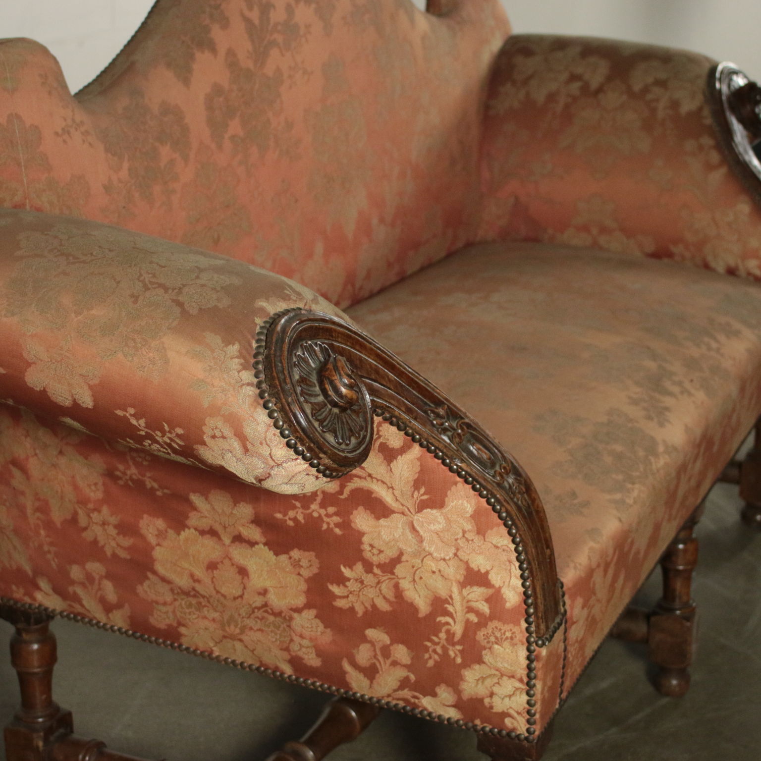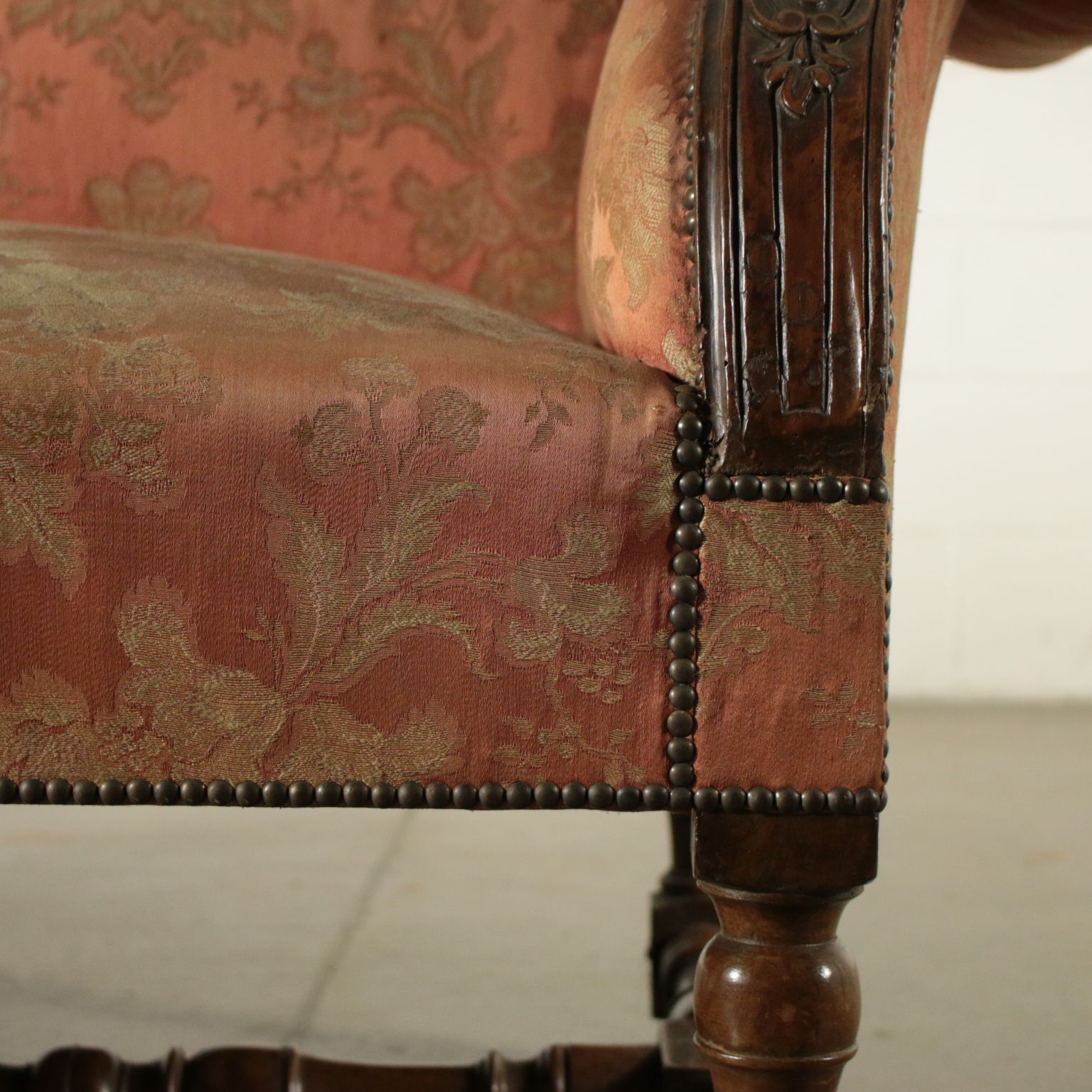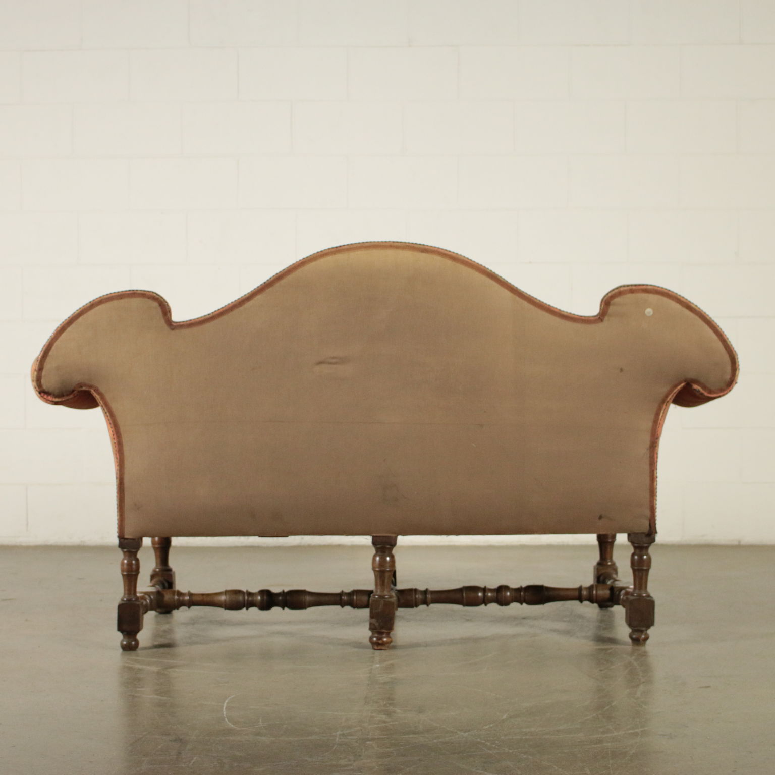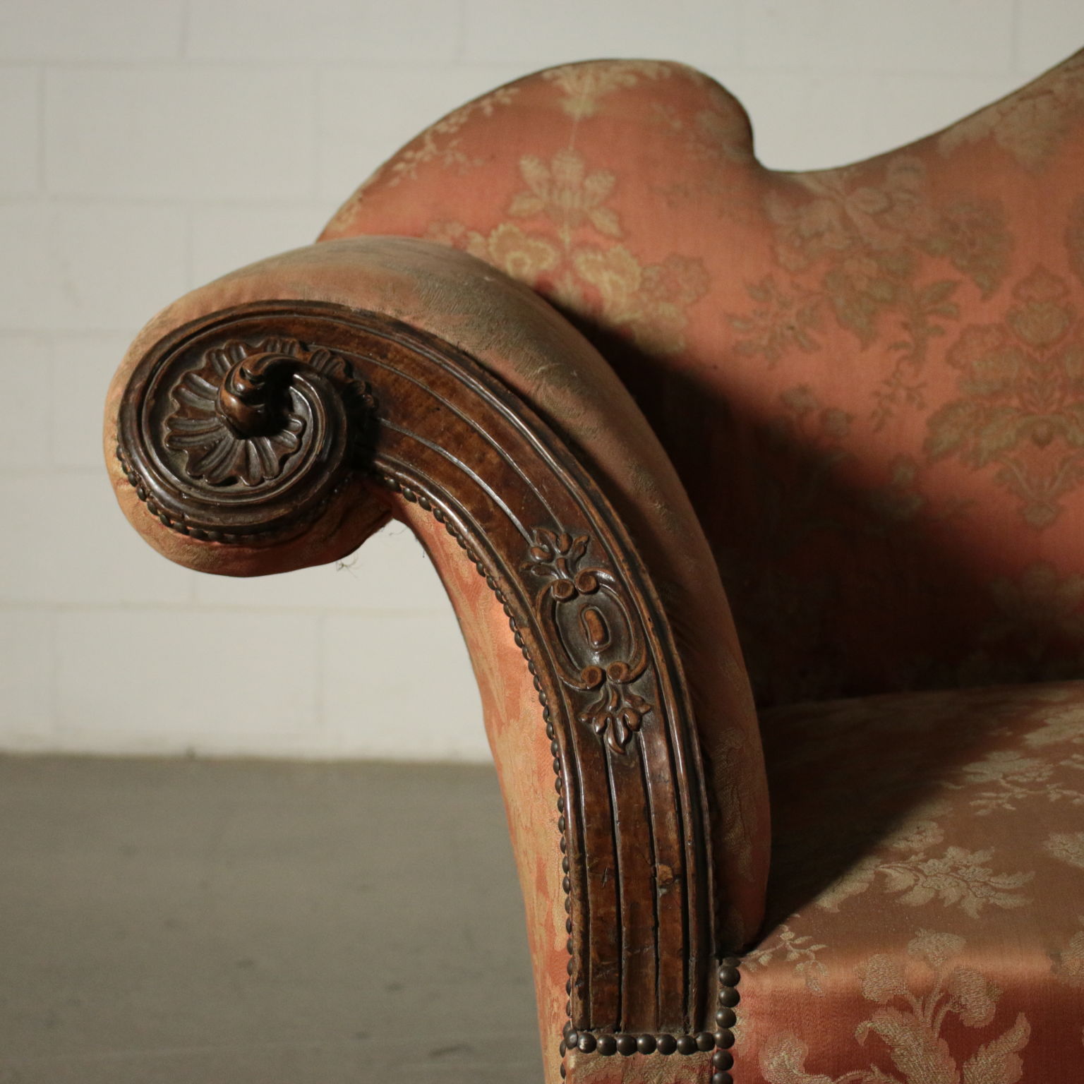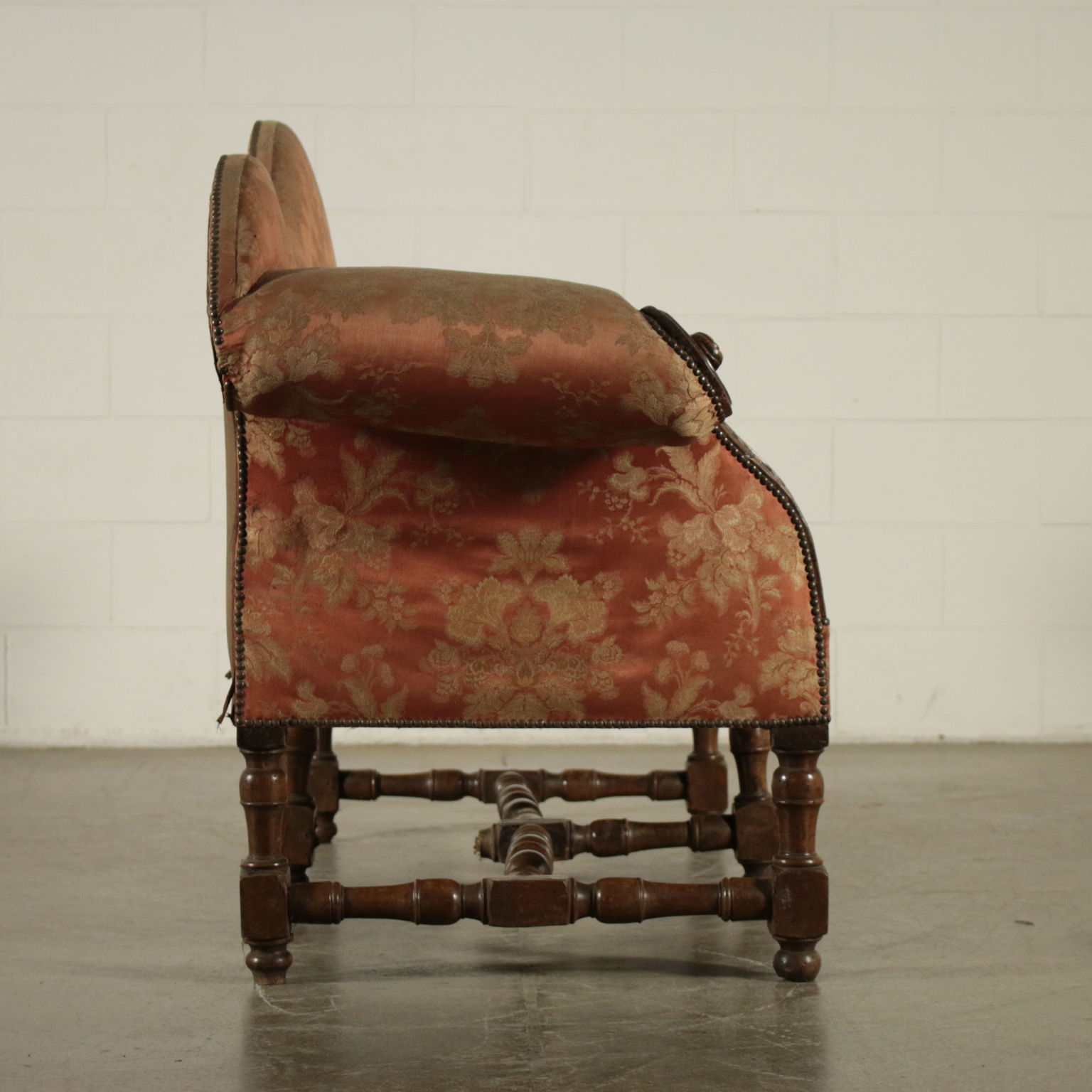 Divano due posti ad orecchioni. Retto da gambe tornite raccordate da crociera. Ampi braccioli intagliati. Schienale sagomato e seduta imbottiti.